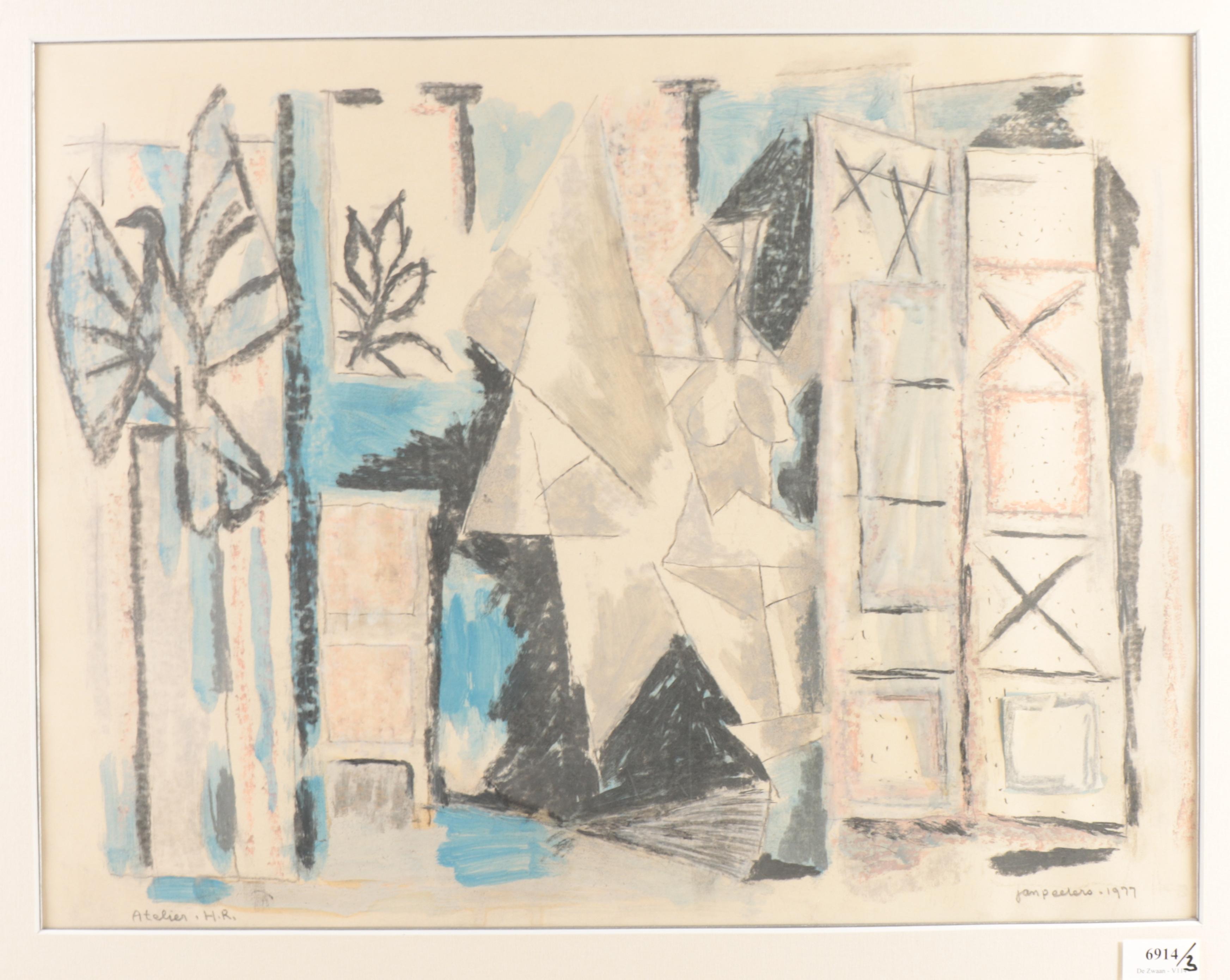gemengde techniek op papier, gesign. 1977, 44 x 58 cm. en litho, 45 x 35 cm. en board, 45 x 60 cm.