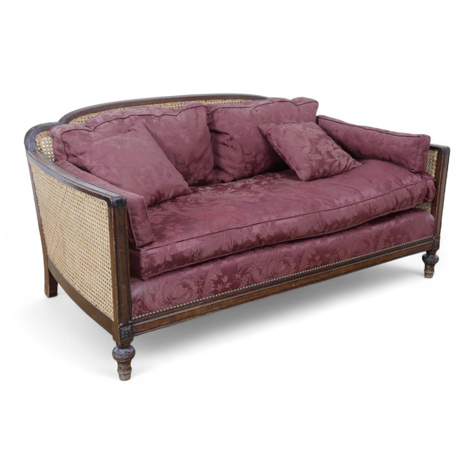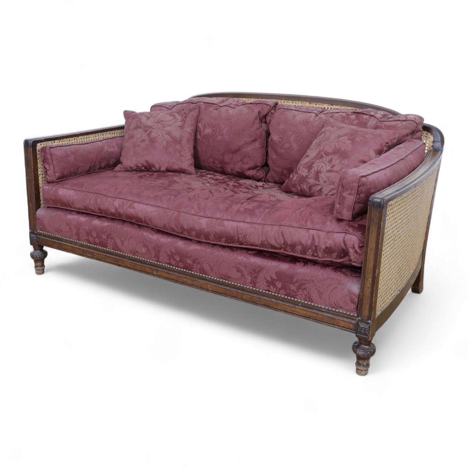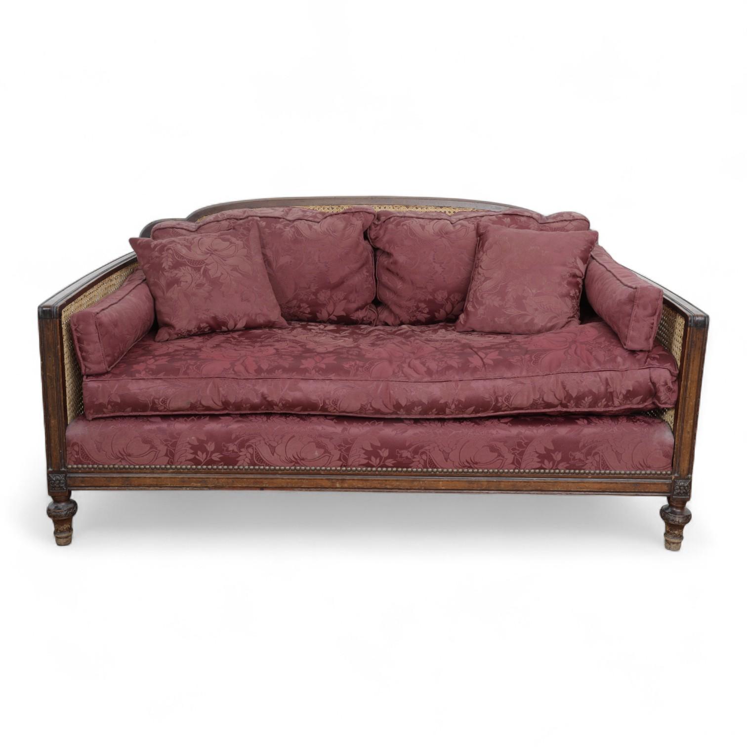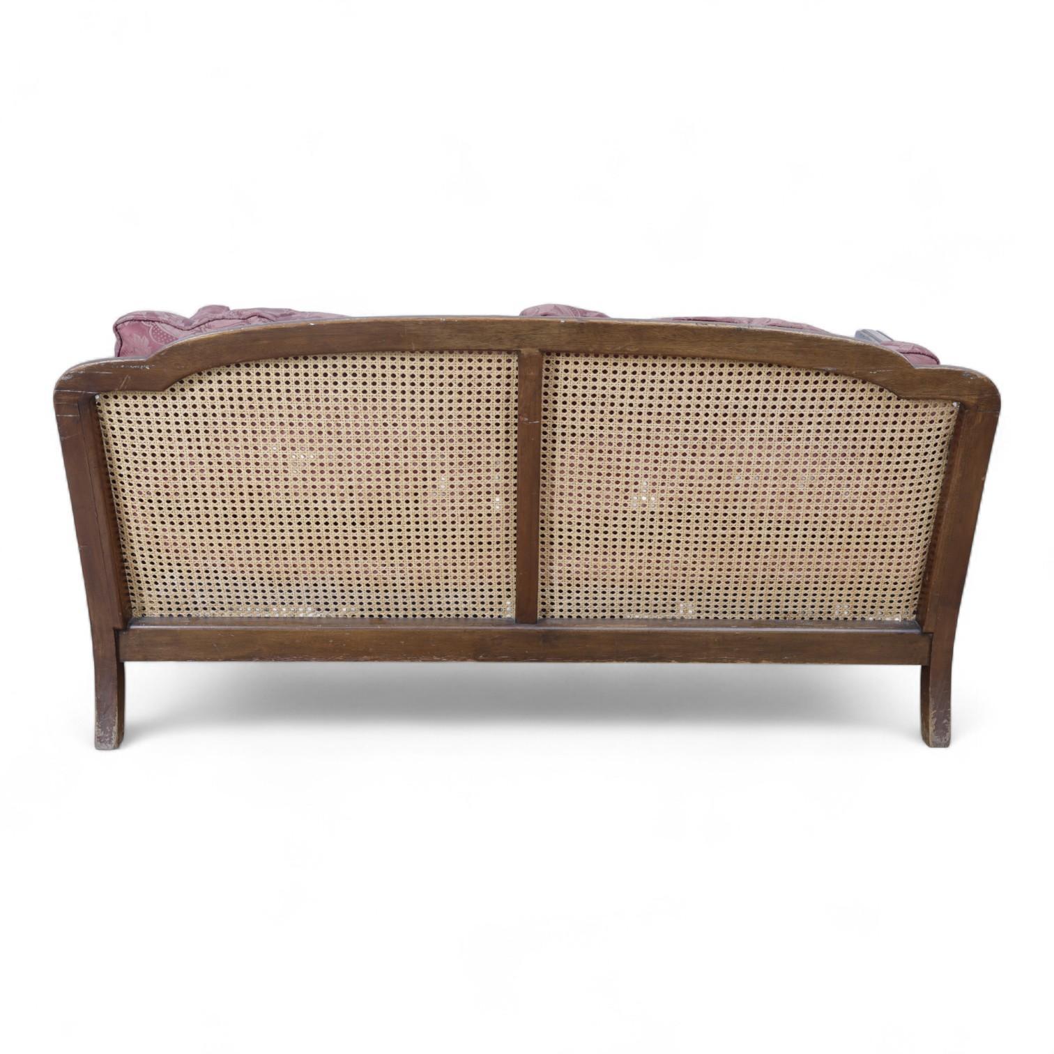 met geriete leuning, dubbelgeriete armleggers en bordeauxrode losse zit- en leunkussens met florale motieven