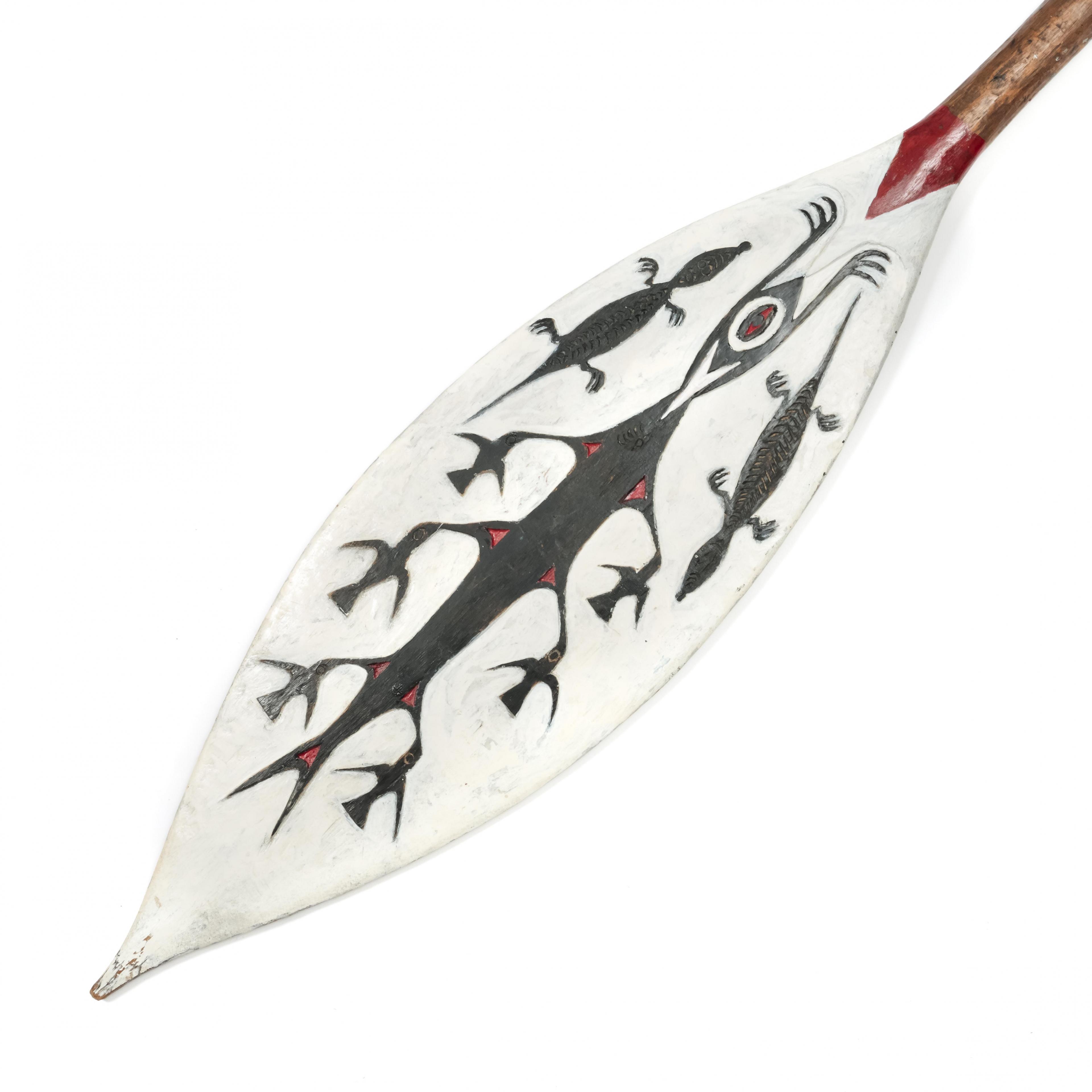 with carvings of animals and geometric patterns. Accents in black, white and red.