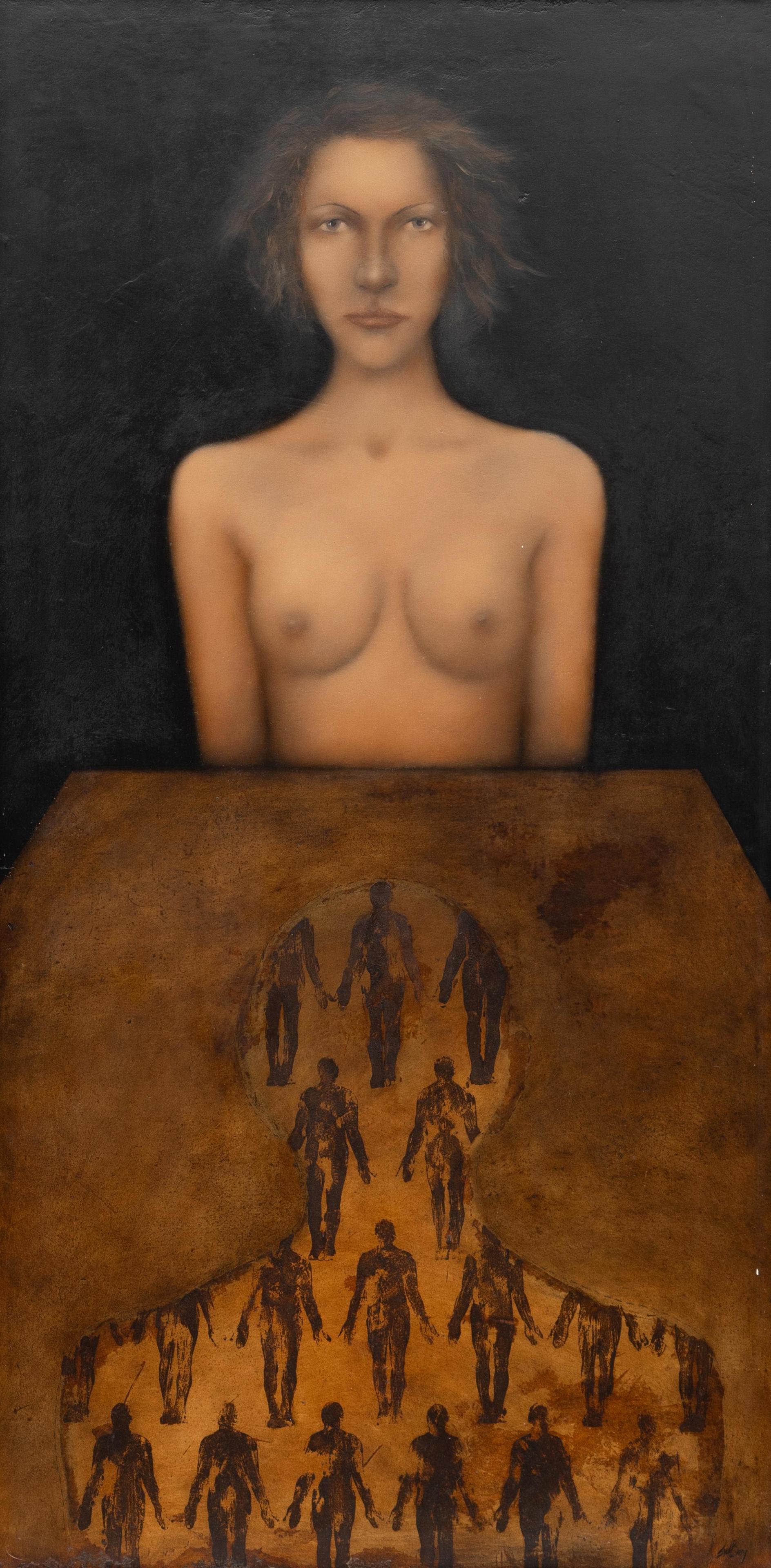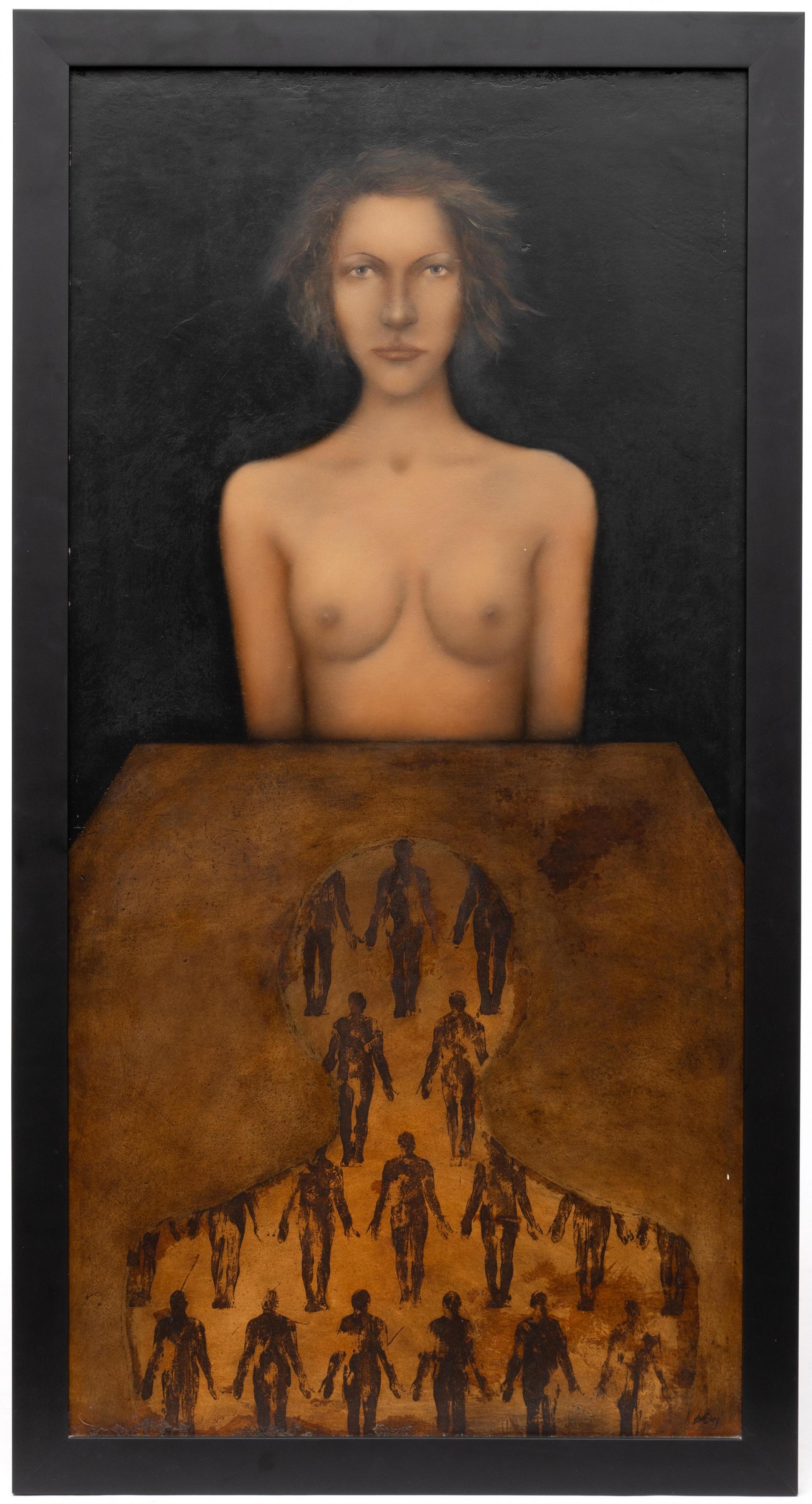 gemengde techniek op paneel, gesign. r.o., 98 x 49 cm.