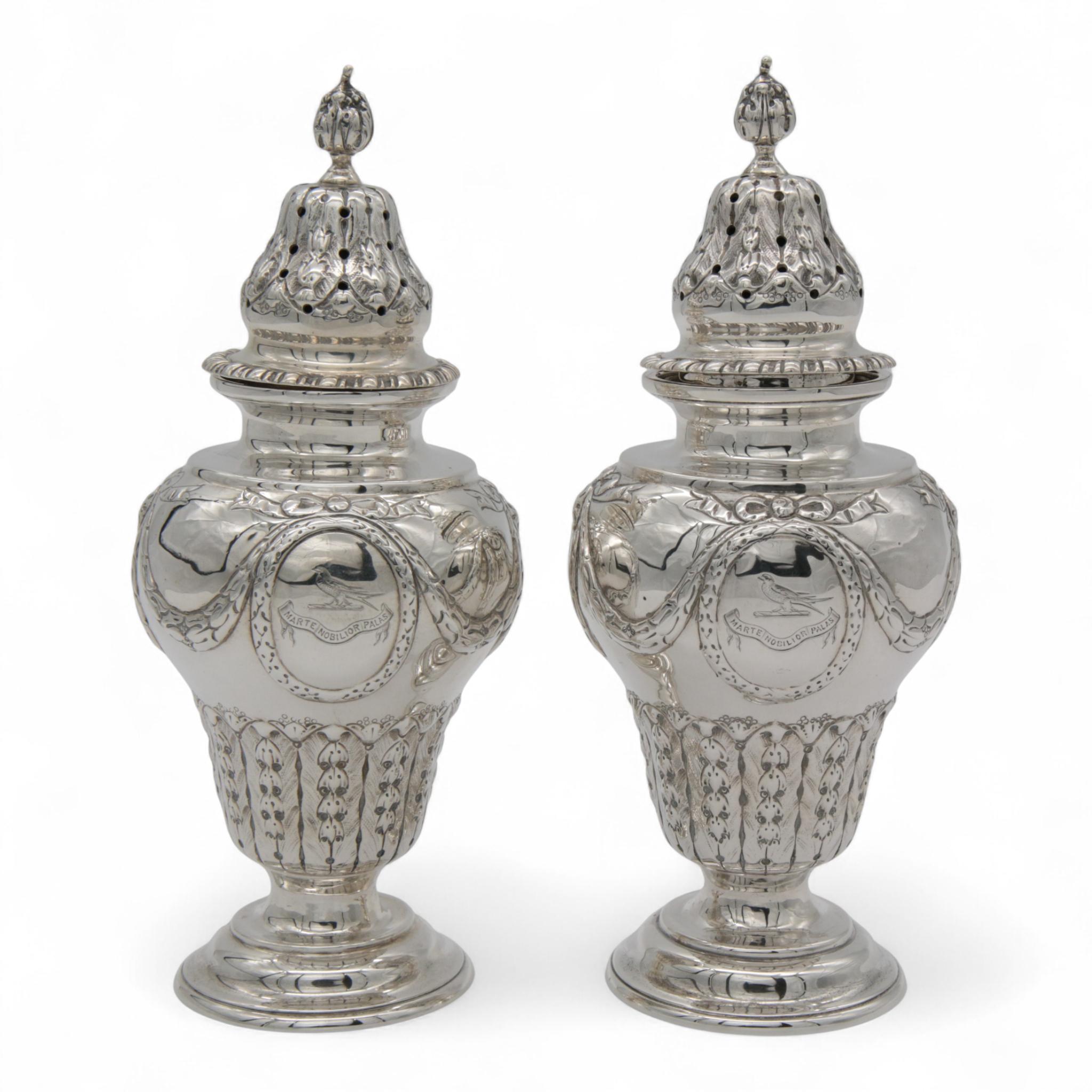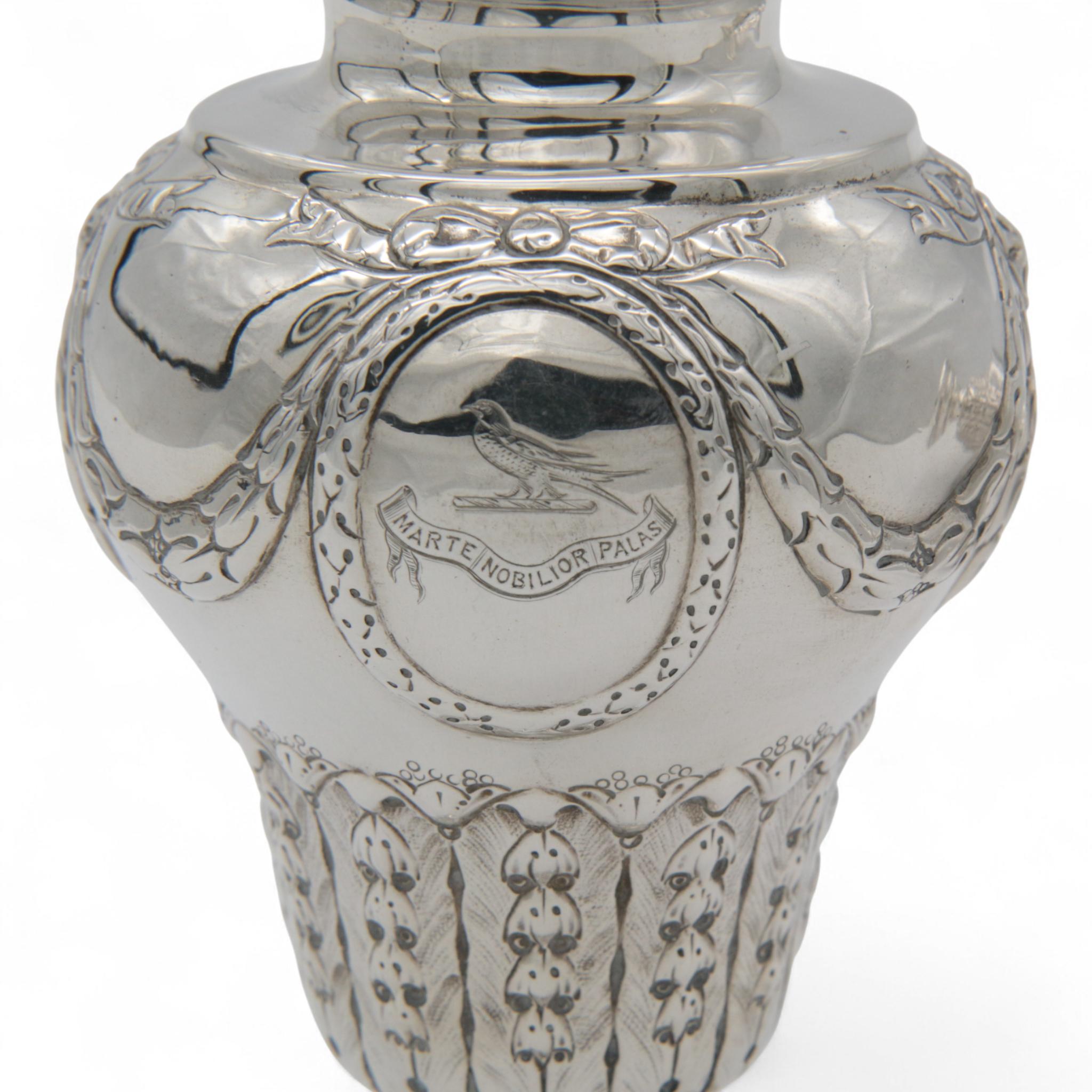rond balustervormige model en versierd met o.a. strikquirlandes en een ovale cartouche met Latijnse tekst "Marte Nobilior Palas"(vertaald "Wijsheid is nobeler dan krijgshaftigheid"), mt. Charles Stuart Harris Londen 1899, sterling,