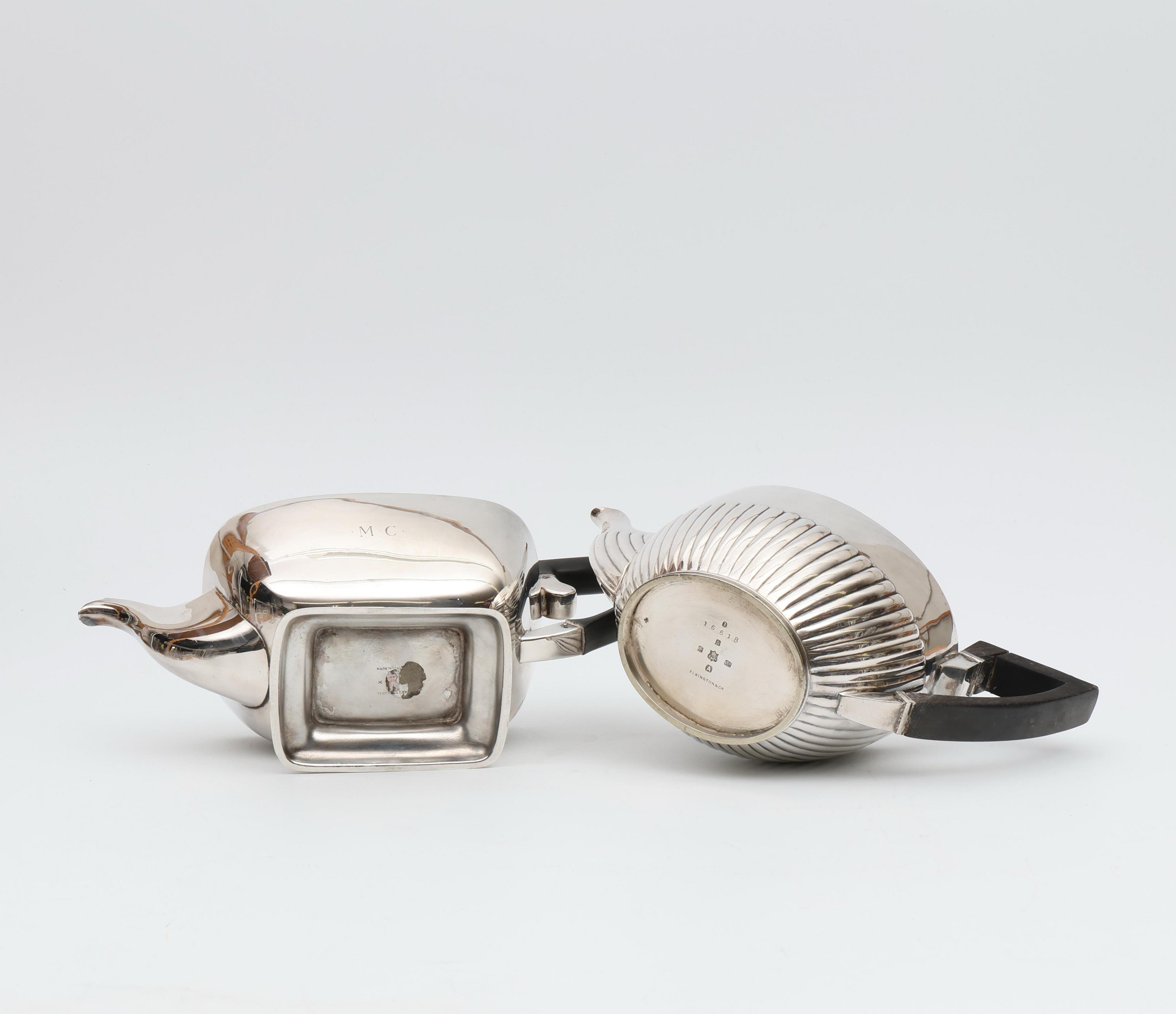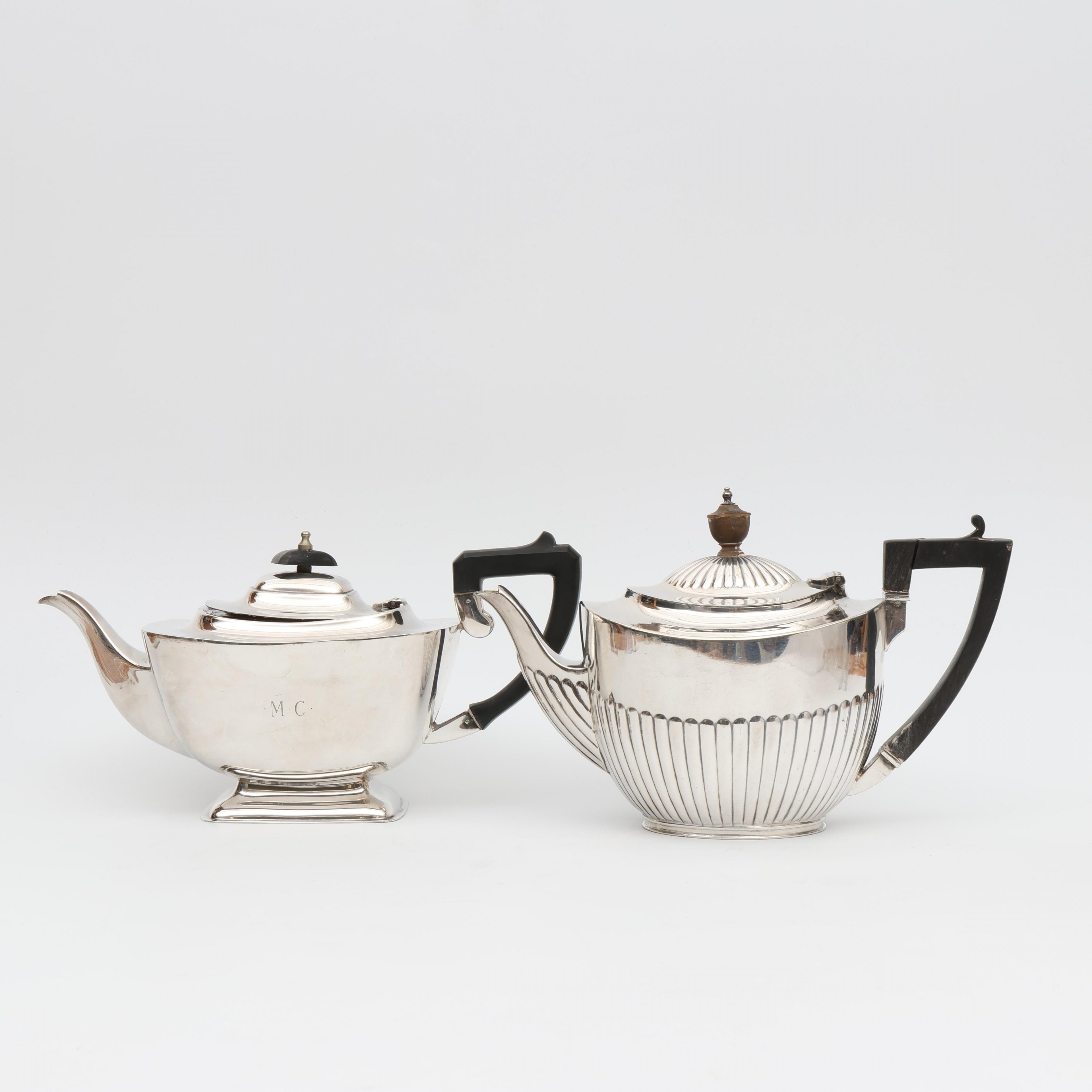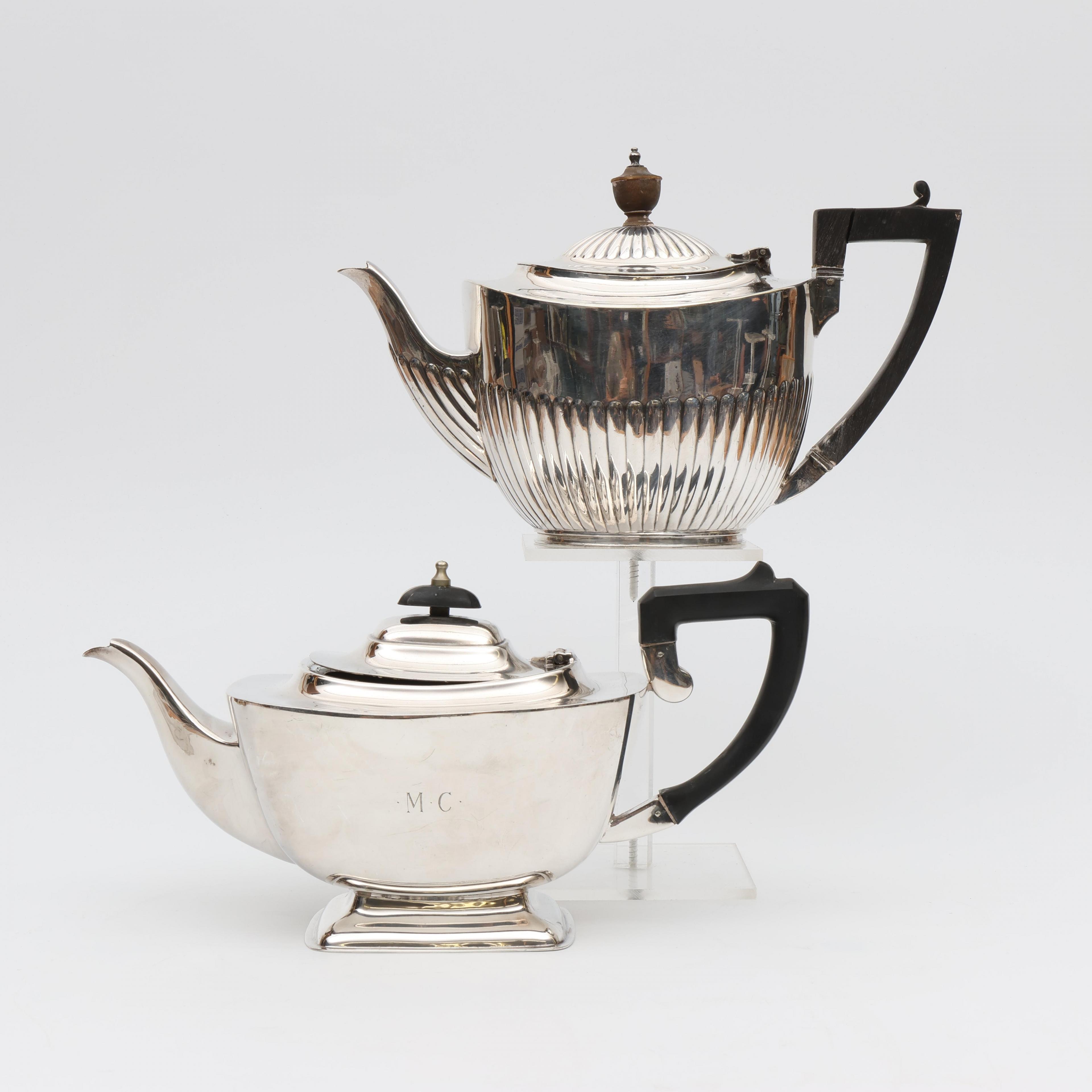 Engeland, twee pleet theepotten met ebbenhouten grepen, w.o. Elkington;
