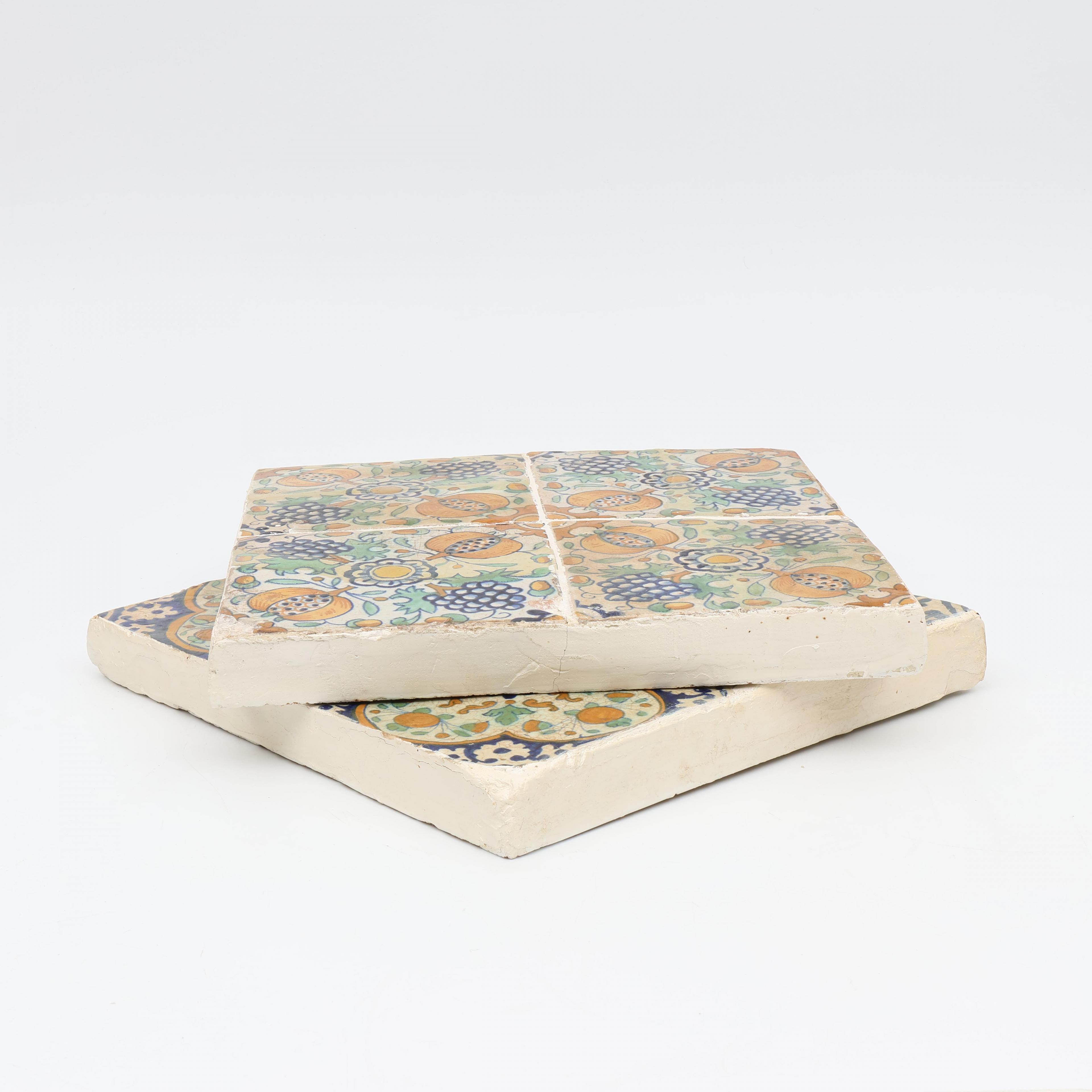 Elk met vier tegels, uitgevoerd met geschilderde decoratie van sinaasappels en druiventrossen en granaatappels.