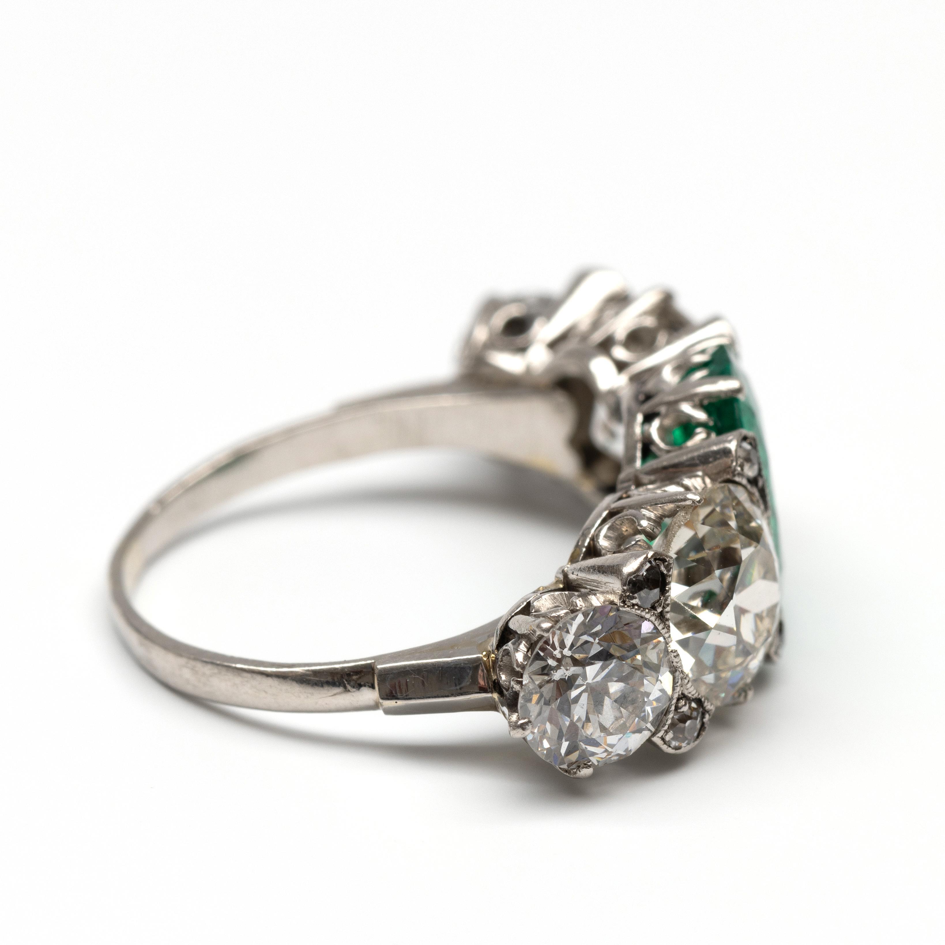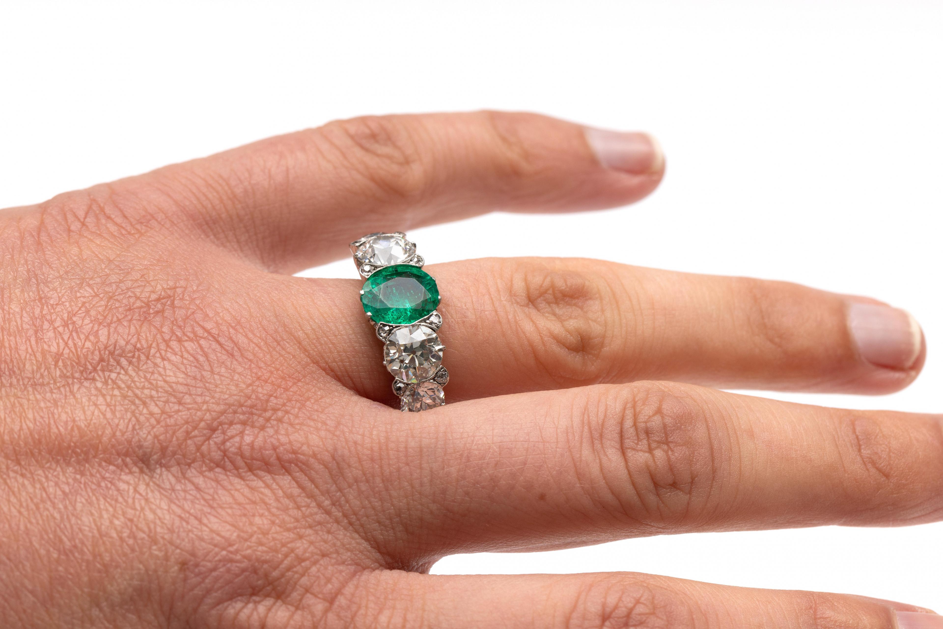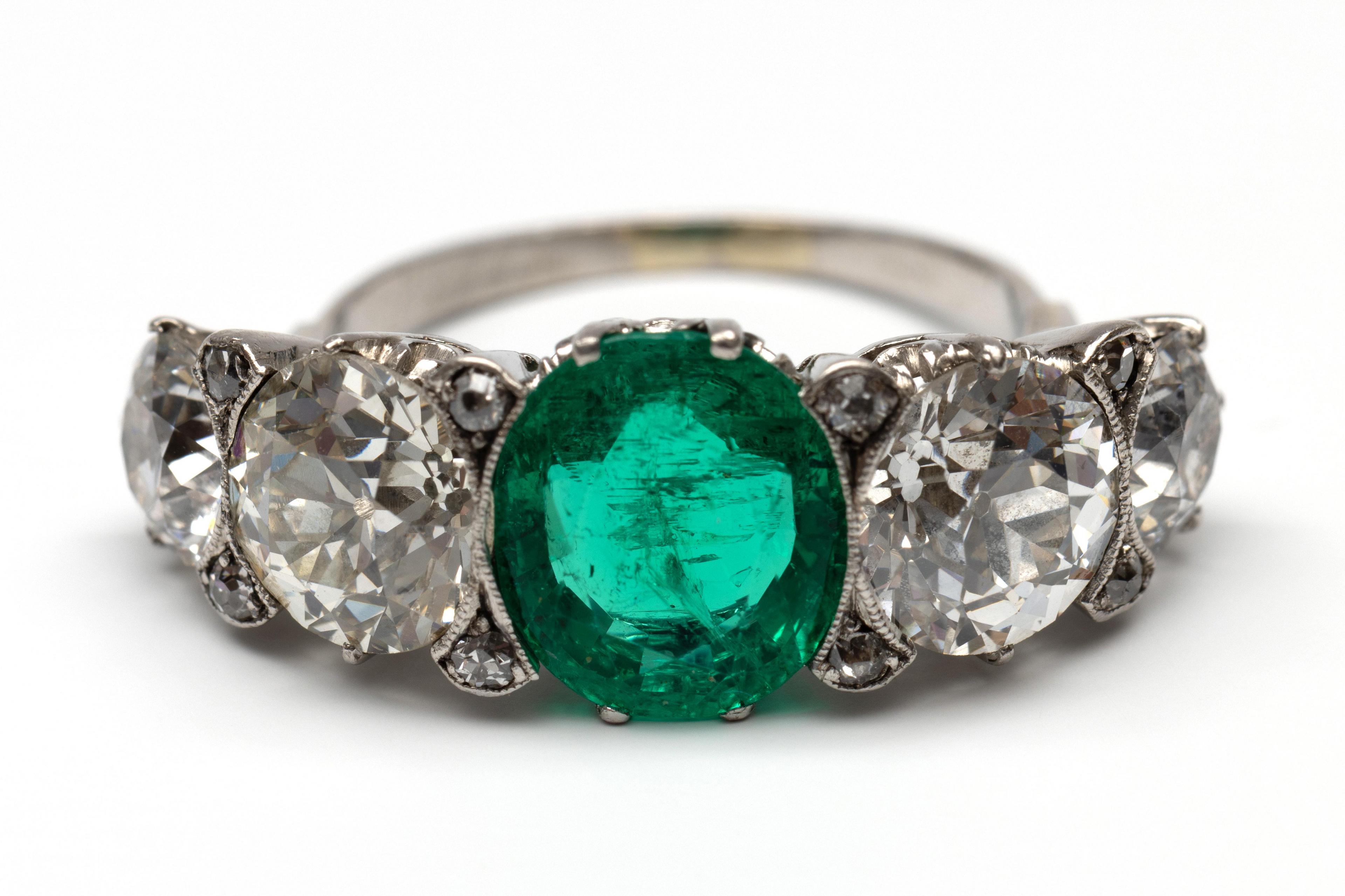 Platinum five stone ring in Art Deco style. Centrally set with an oval faceted clear emerald of approximately 1.80 ct (approx. 9.3 x 7.7 mm), flanked by two old brilliant-cut diamonds on either side, decreasing in size from the center. Small single-cut diamonds are set between the stones. Total diamond weight: approximately 3.40 ct.