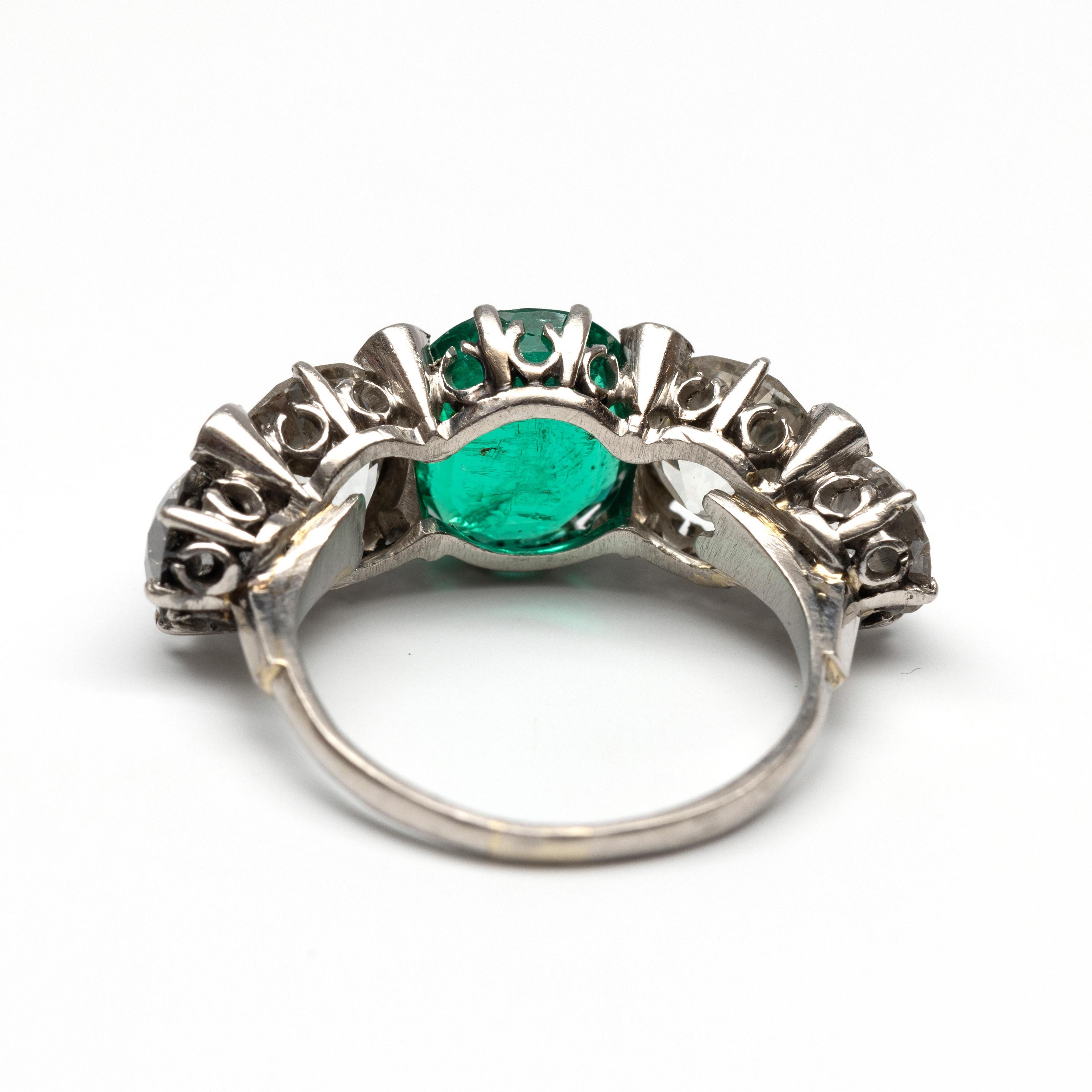 Centraal bezet met een ovale gefacetteerde heldere smaragd van ca. 1.80 ct. (ca. 9,3 x 7,7 mm), met aan weerszijden twee oud briljant geslepen diamanten, in grootte aflopend vanaf het midden. Tussen de stenen zijn kleine achtkant geslepen diamanten gezet. Totaal diamant gewicht ca. 3.40 ct.