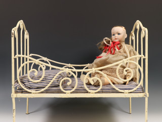 Gietijzeren miniatuur fornuis, kabouterhuis en poppenbed met pop,