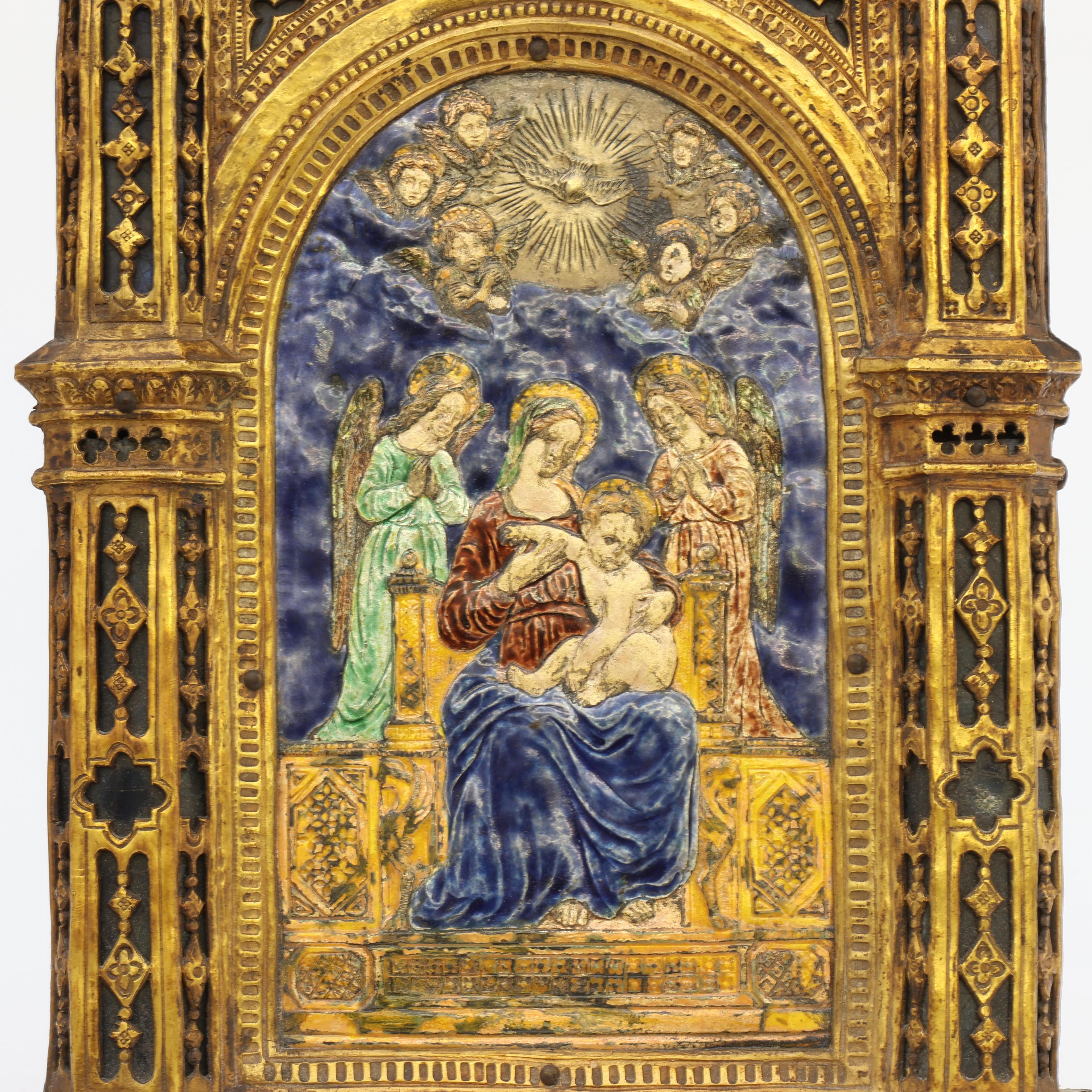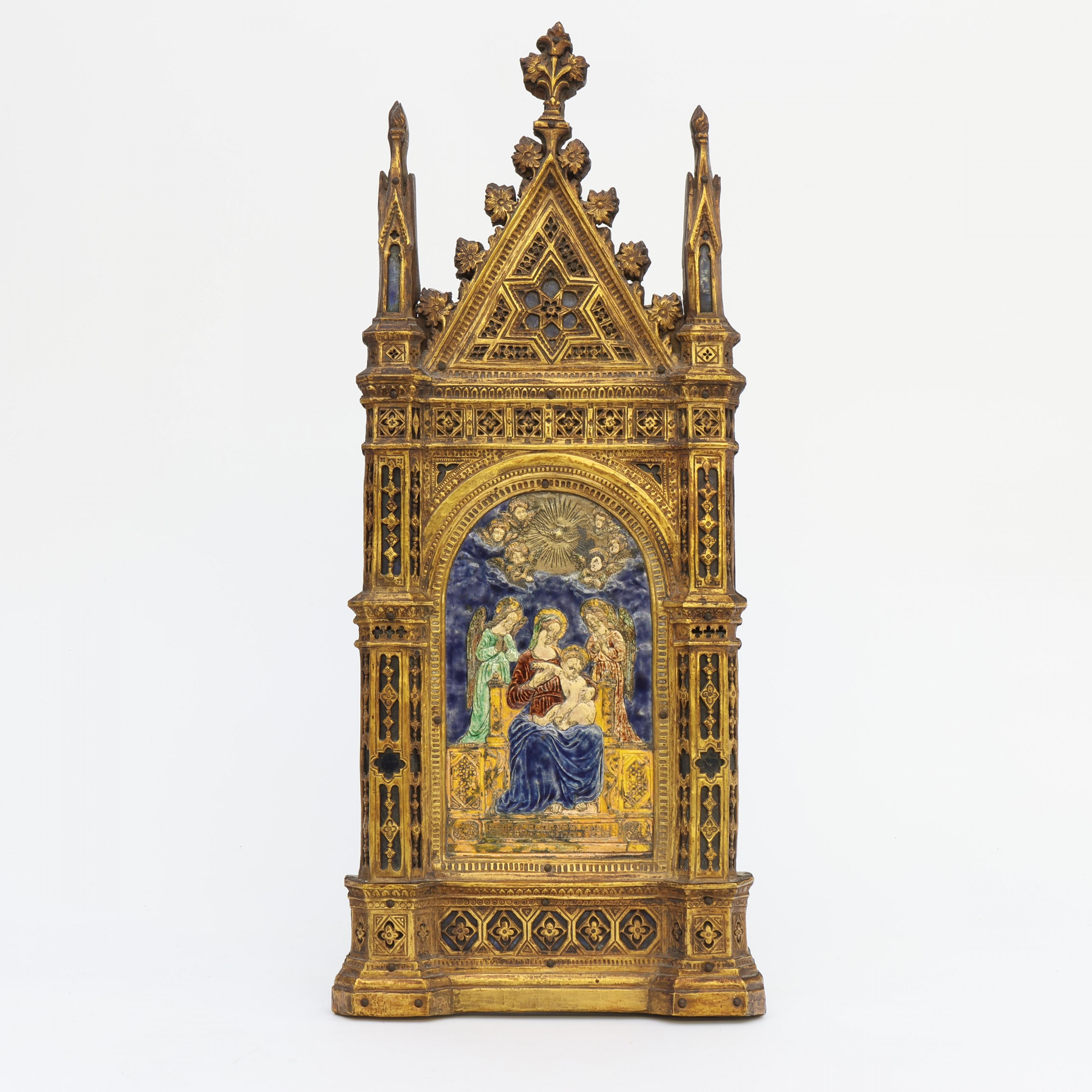 Uitgevoerd met voorstelling van Maria met kind omringd door engelen. Geplaatst in koperen raamwerk in gotische stijl.