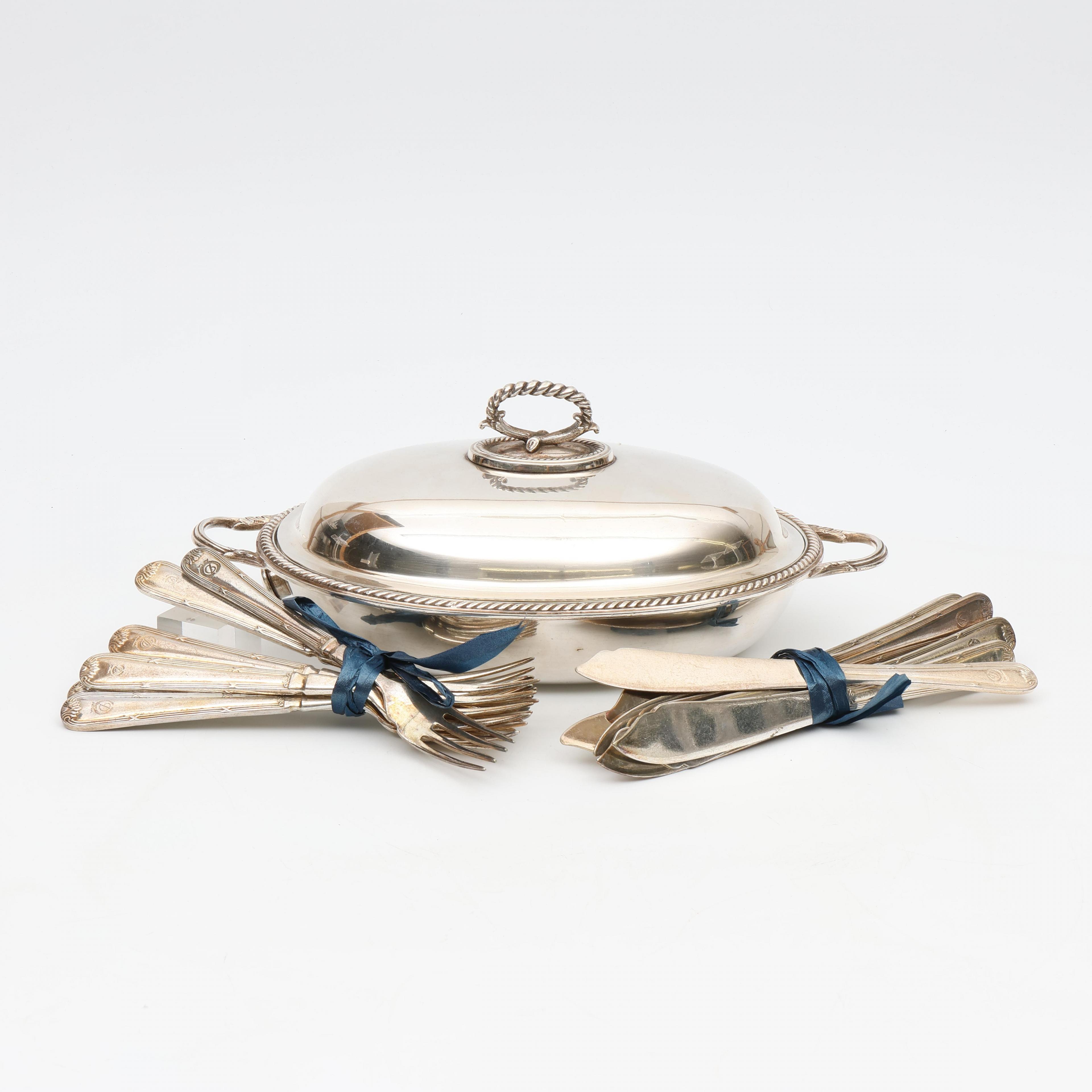 Engeland, Sheffield pleet acht persoons visbestek en Barker Brothers warmhoud dekschaal;