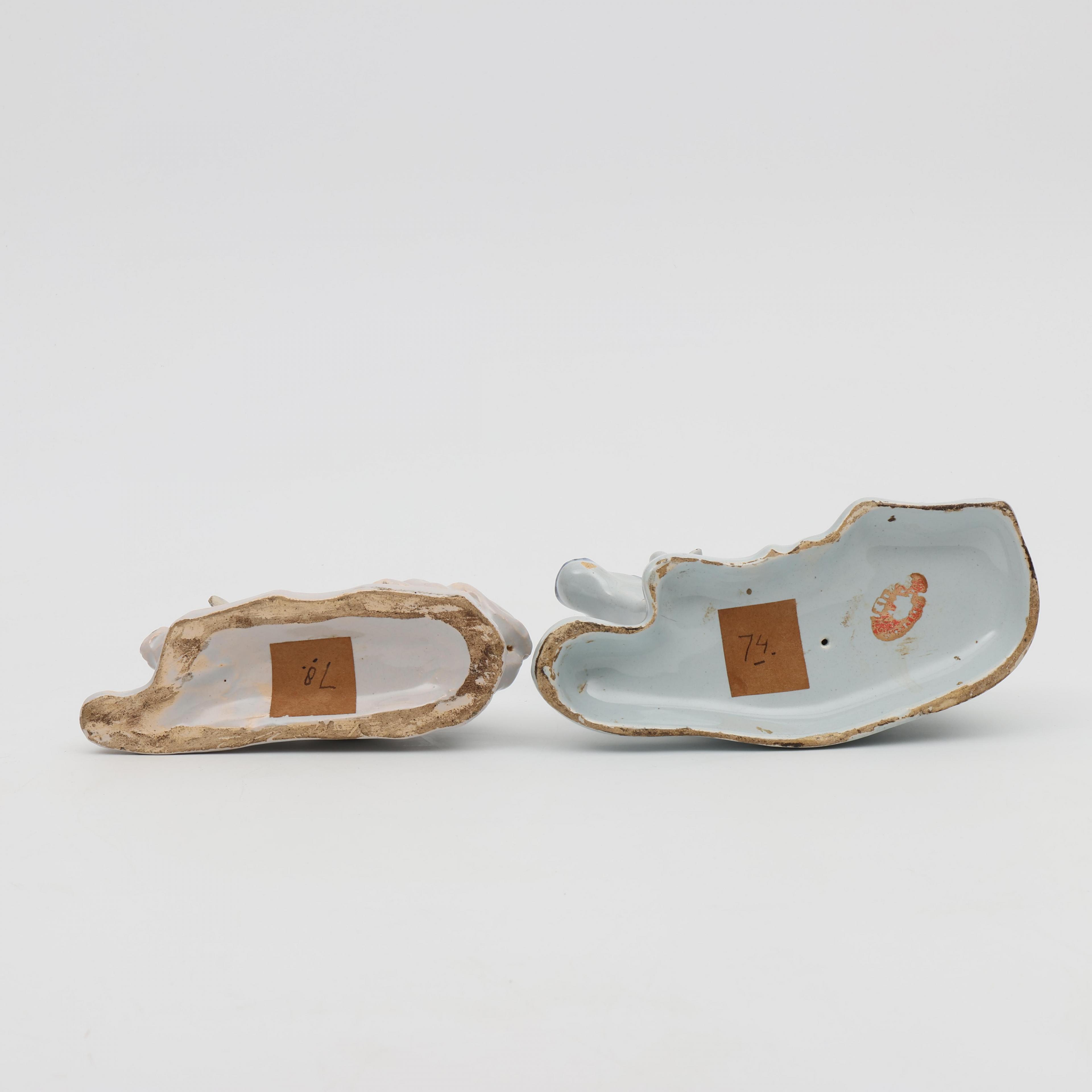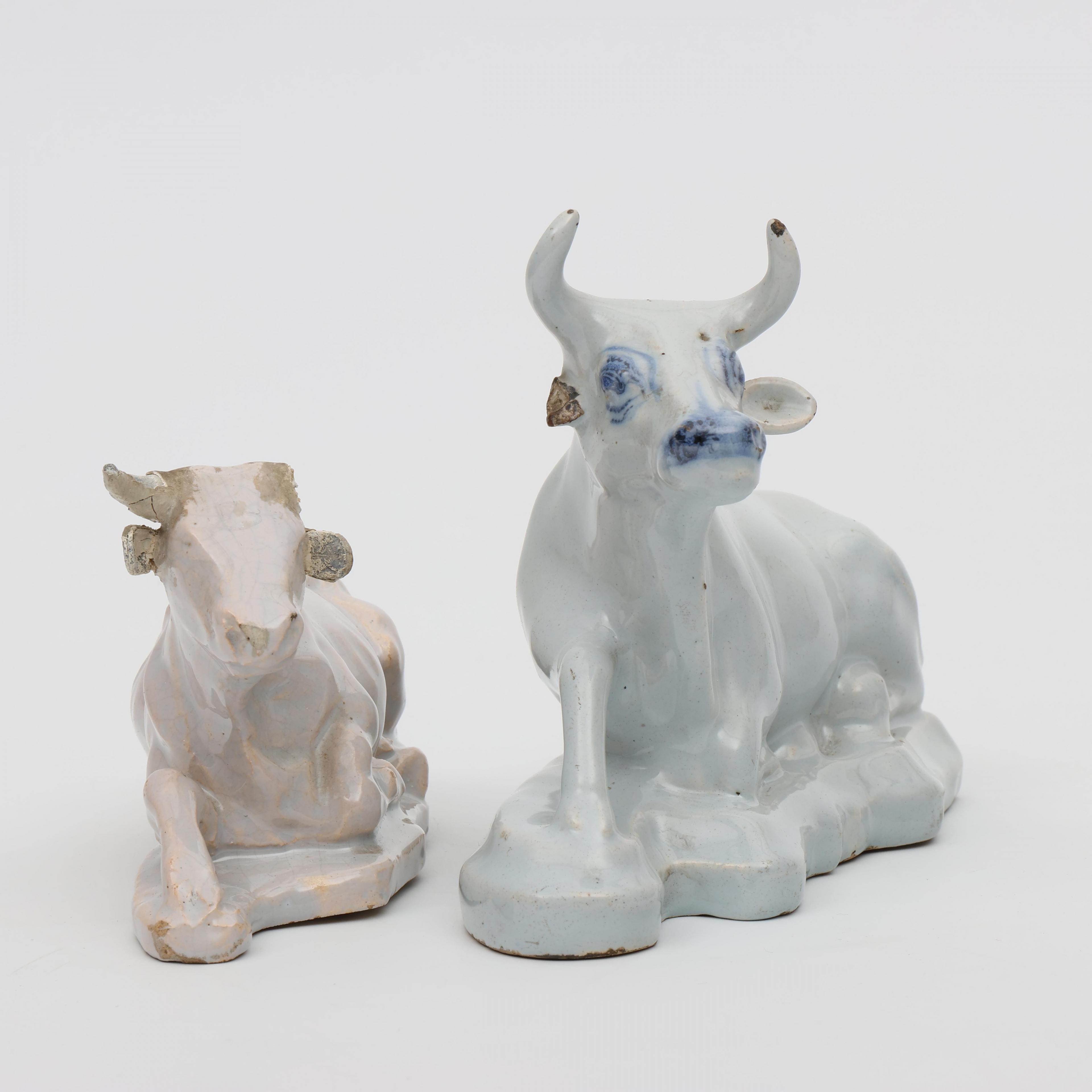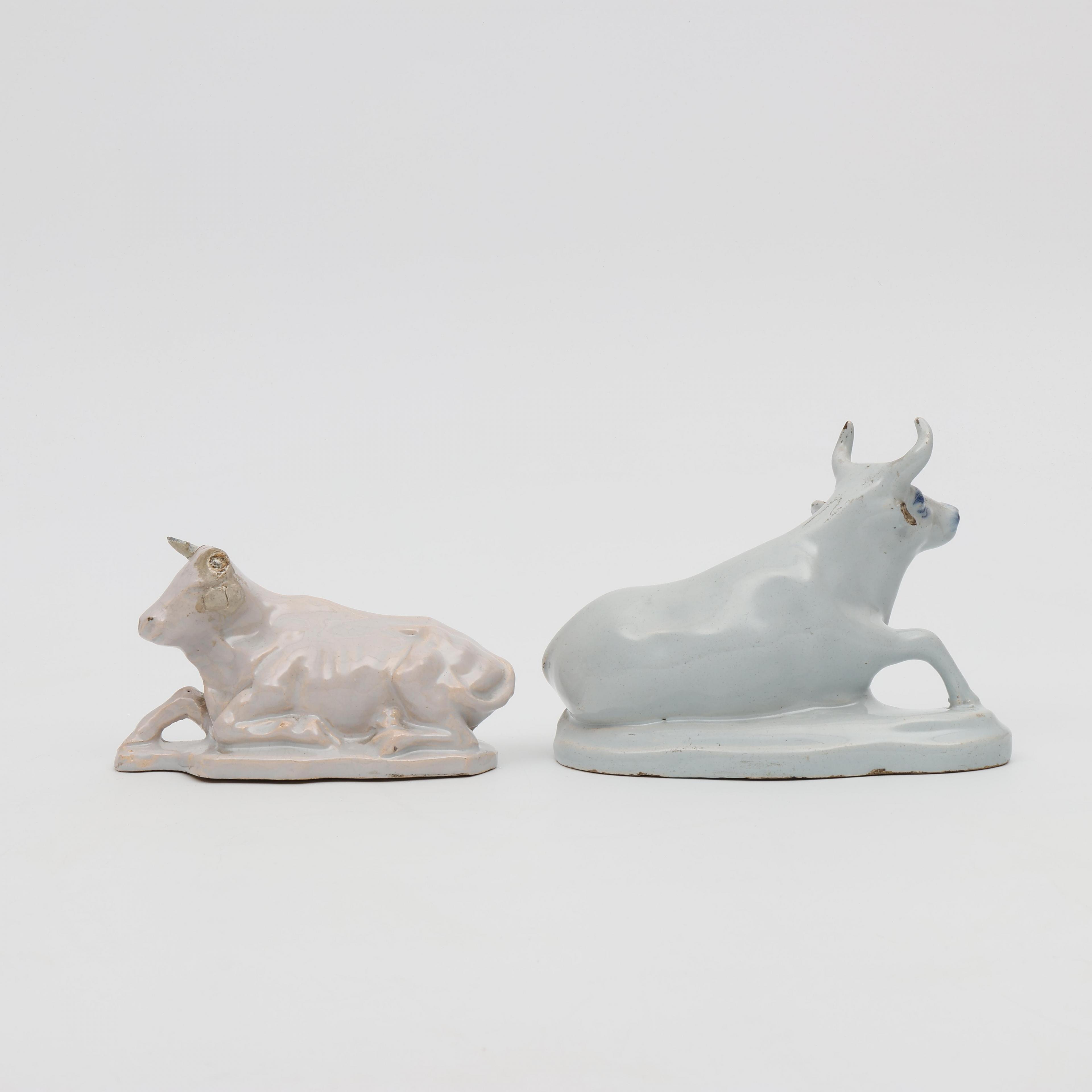 Delft, twee wit aardewerk koetjes, 18e eeuw;