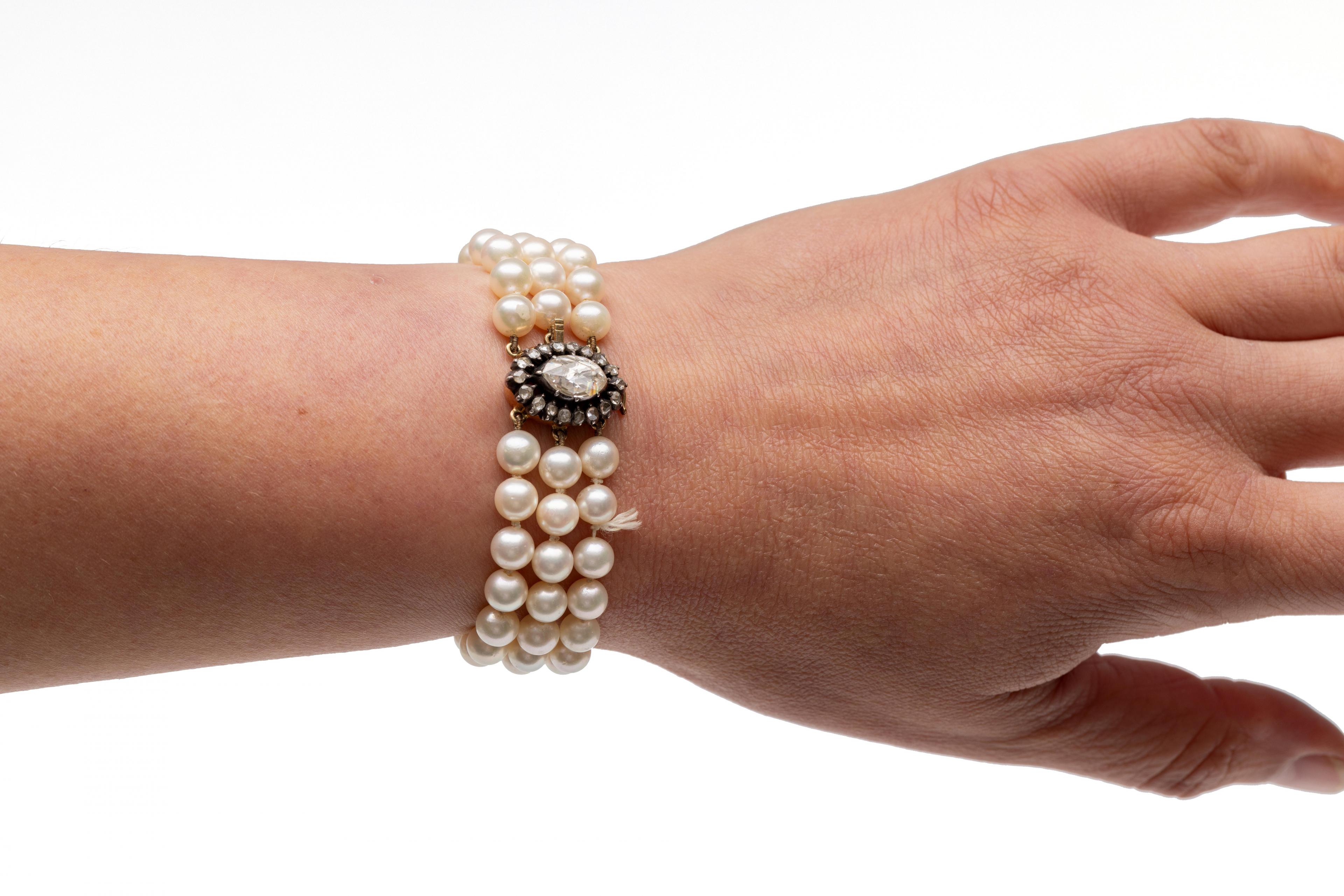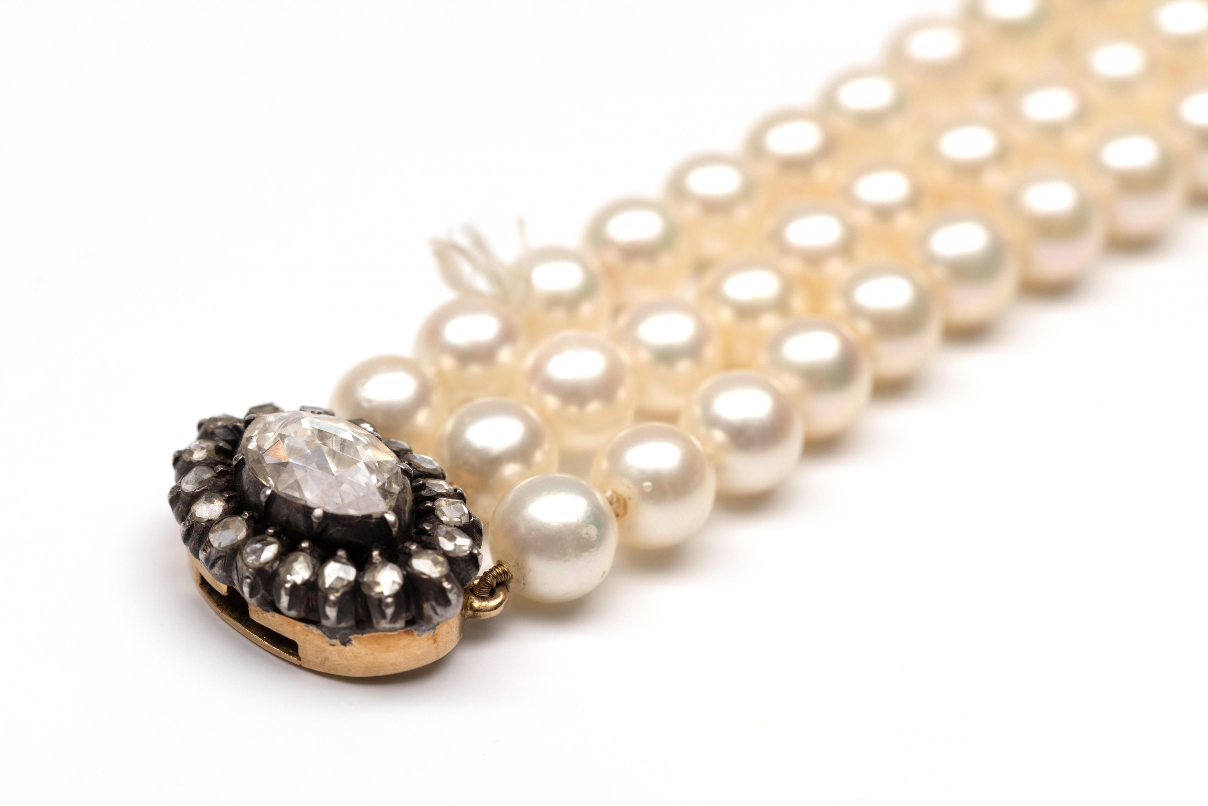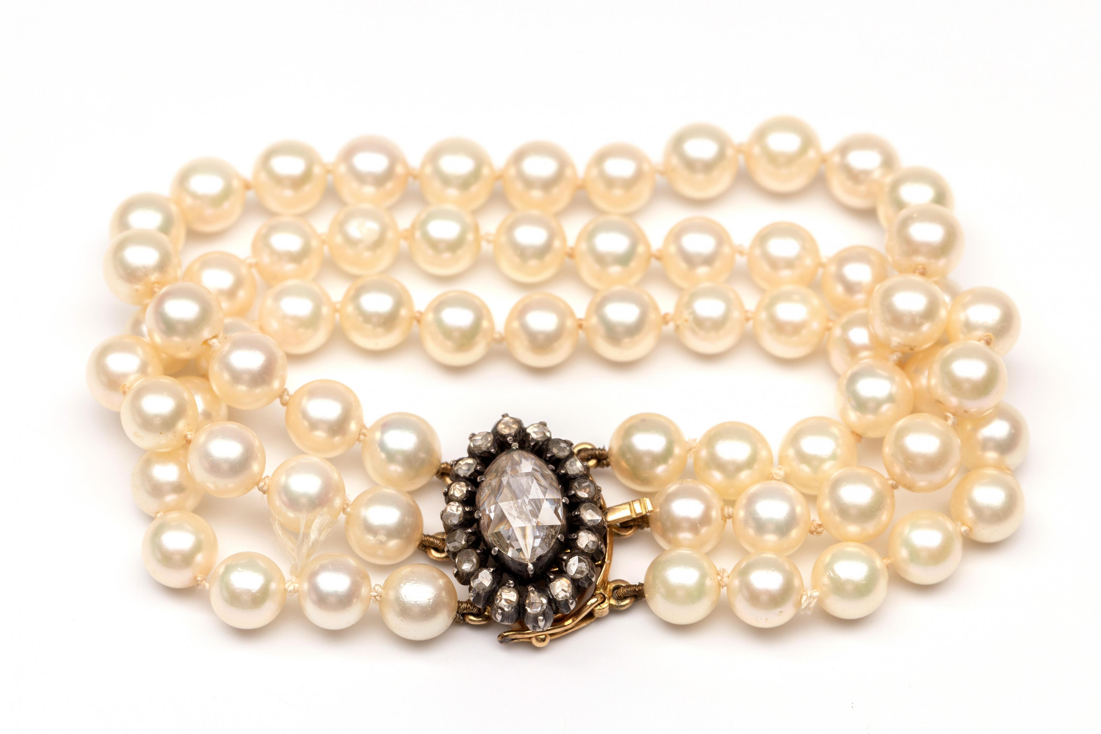 Pearl bracelet, consisting of three strands of cultured pearls (diam. approx. 6.3 mm) on a gold and silver clasp set with a marquise-shaped rose-cut diamond (approx. 10 x 6 mm) in an entourage of small round rose-cut diamonds