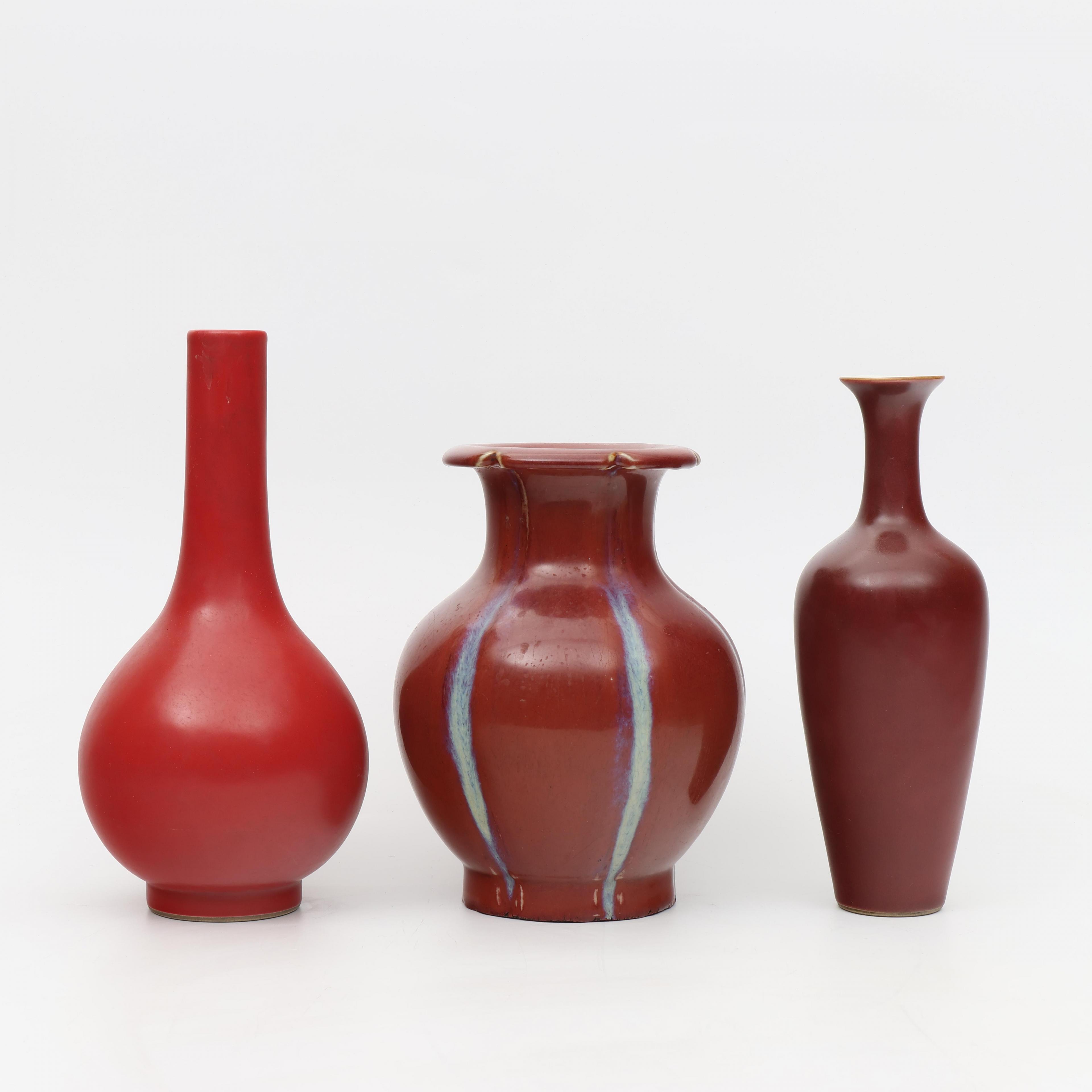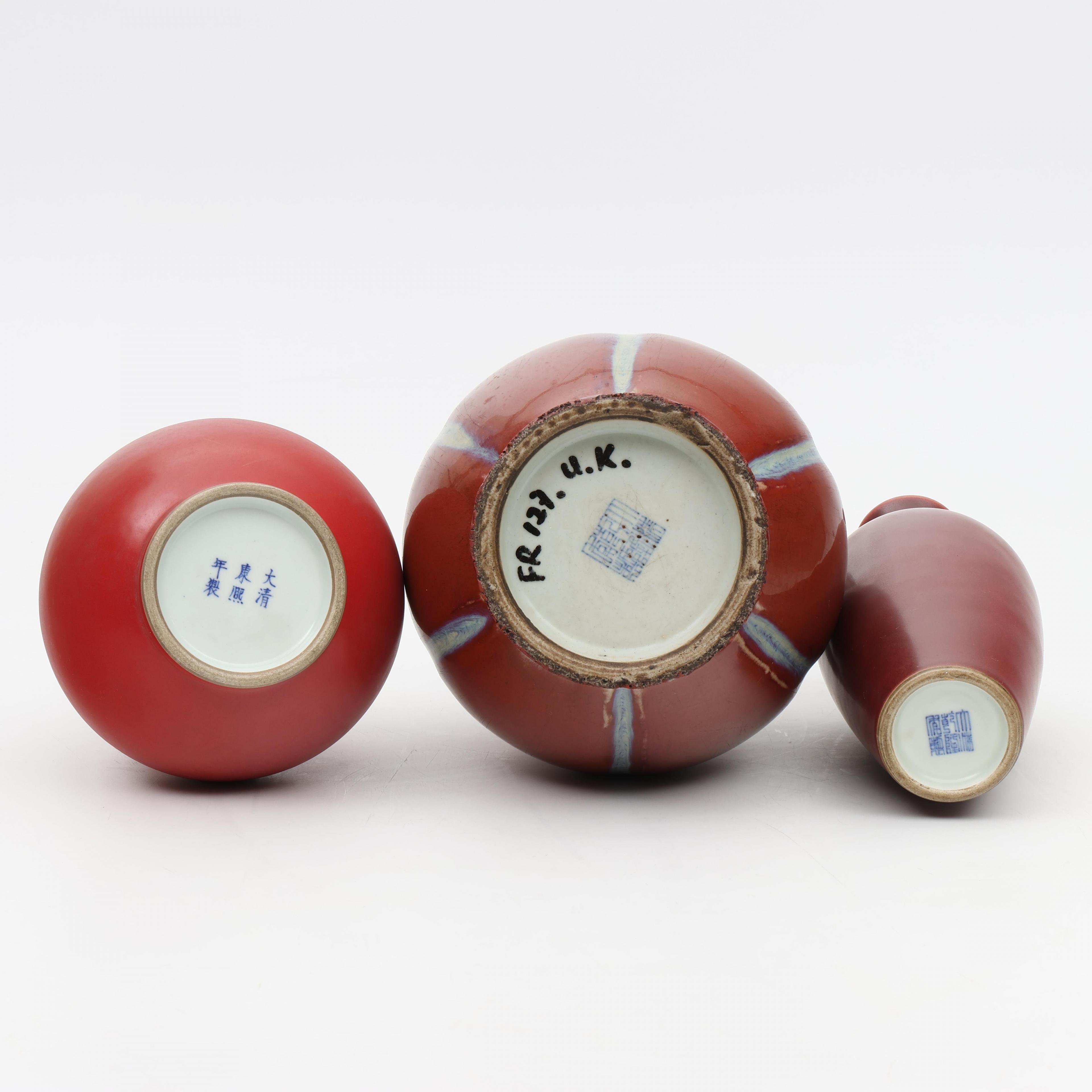 comprising one coral-glazed bottle vase with apocryphal Kangxi mark, a dark-red vase with apocryphal Qianlong seal mark, and an iron-red vase streaked with turquoise and with apocryphal Qianlong seal mark