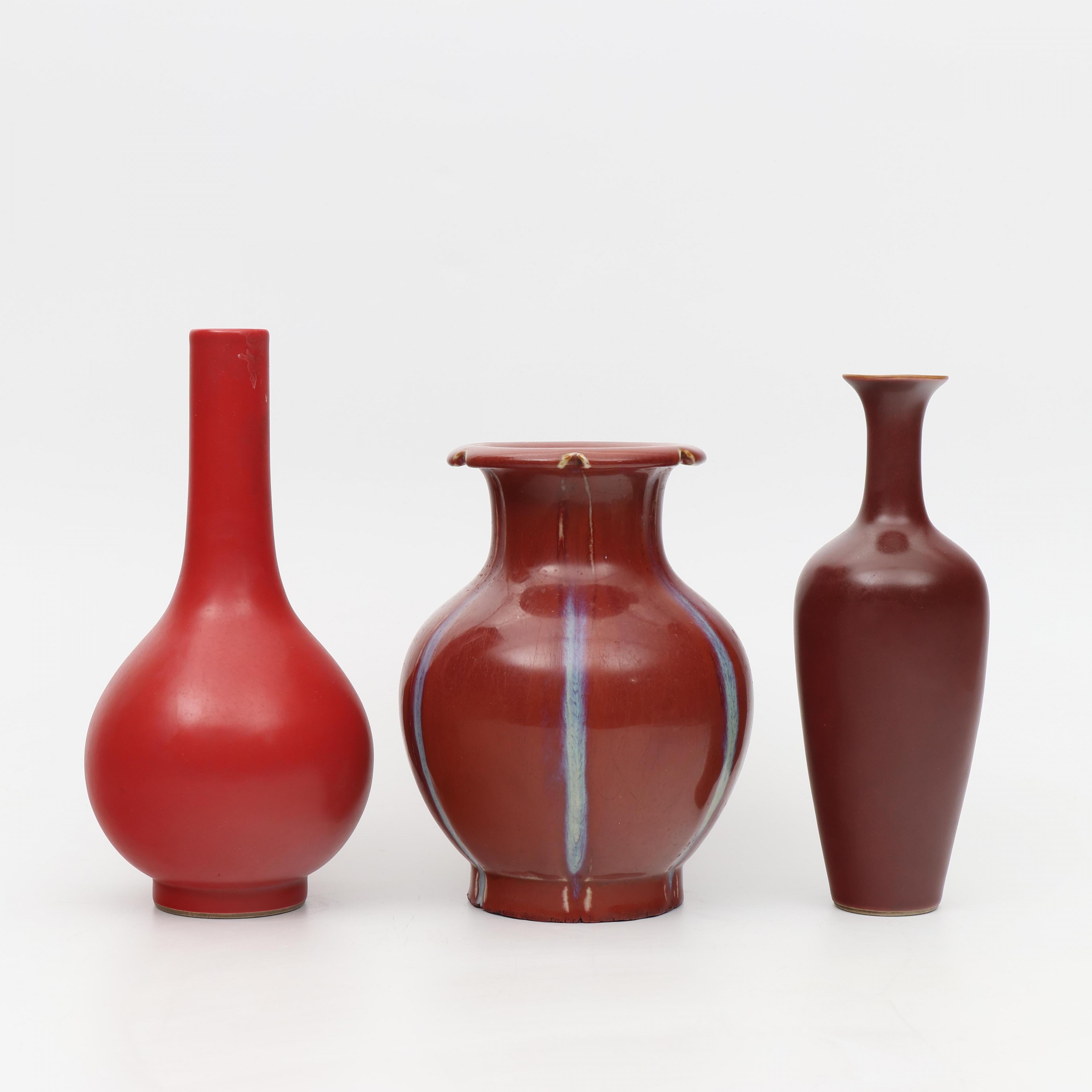 China, three red-glazed and flambé porcelain vases, 19th and 20th century,