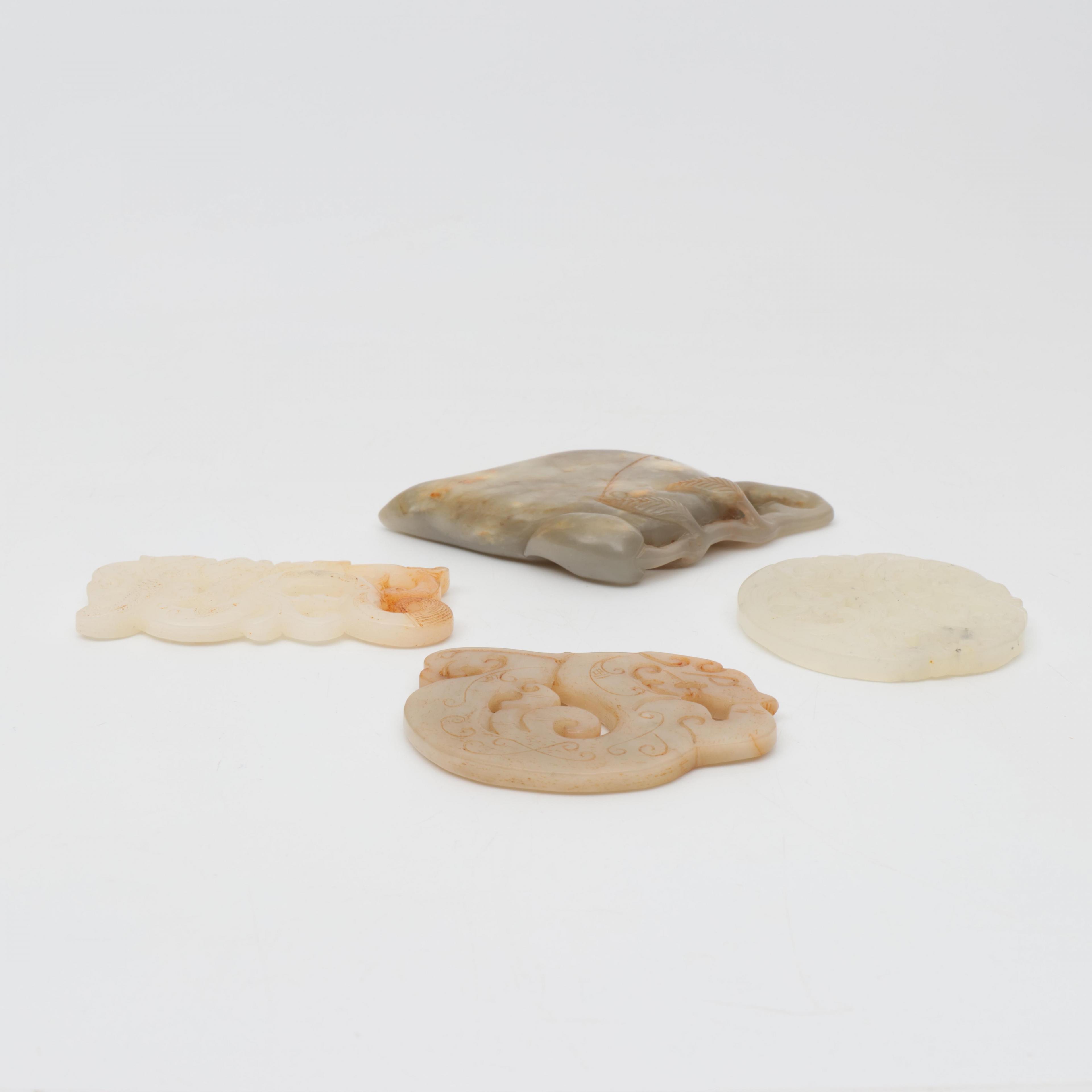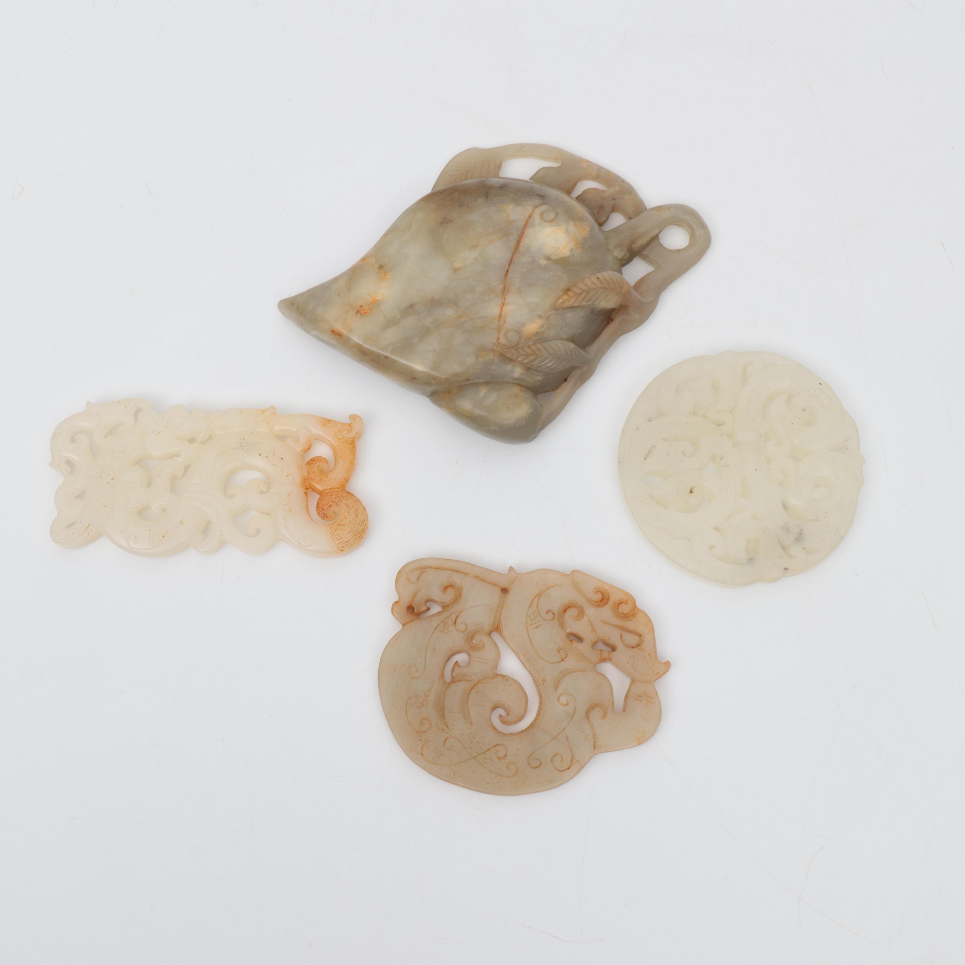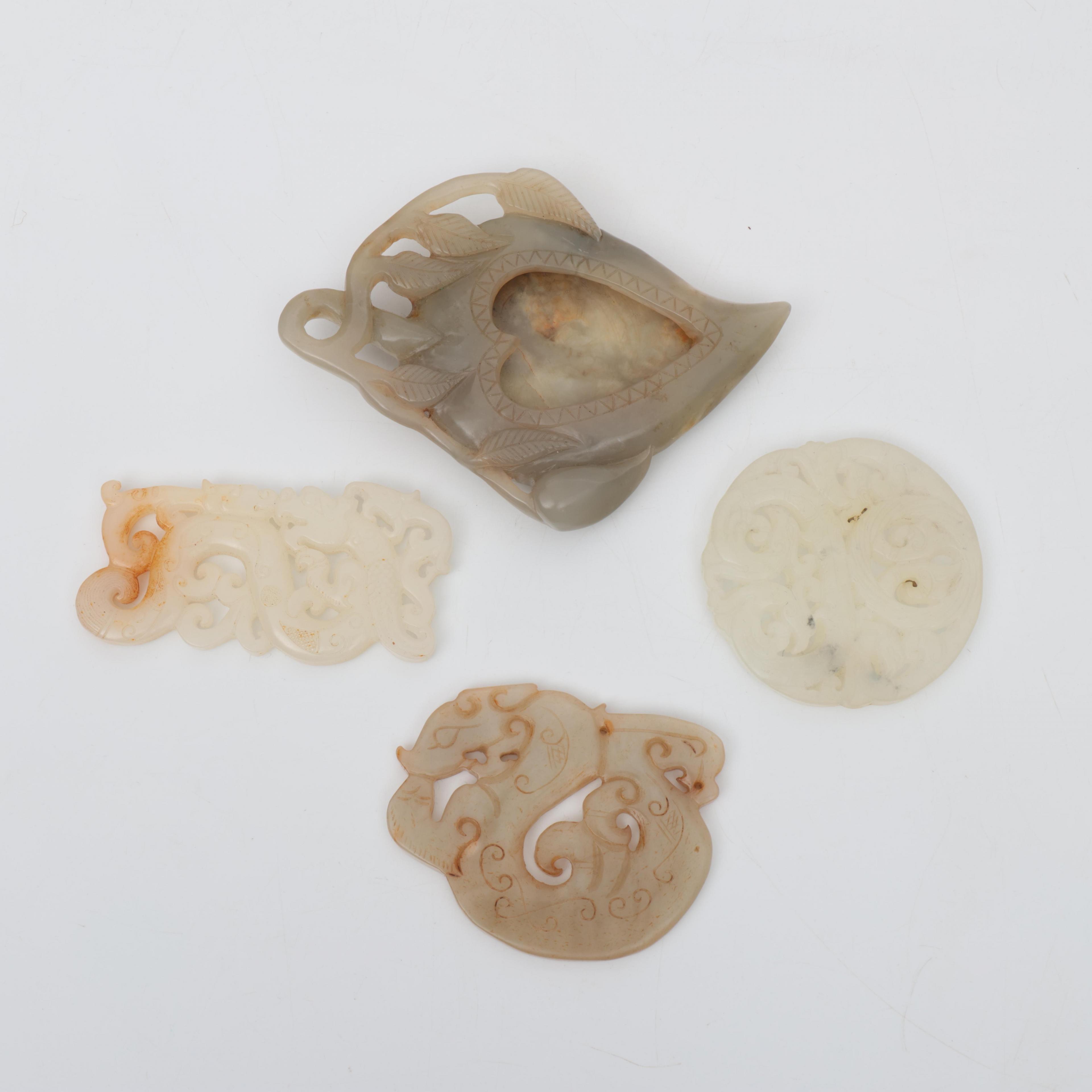 the pendants in various openworked dragon shapes and the washer shaped as a fruit, the stones varying in tone from pale to greysih-green celadon
