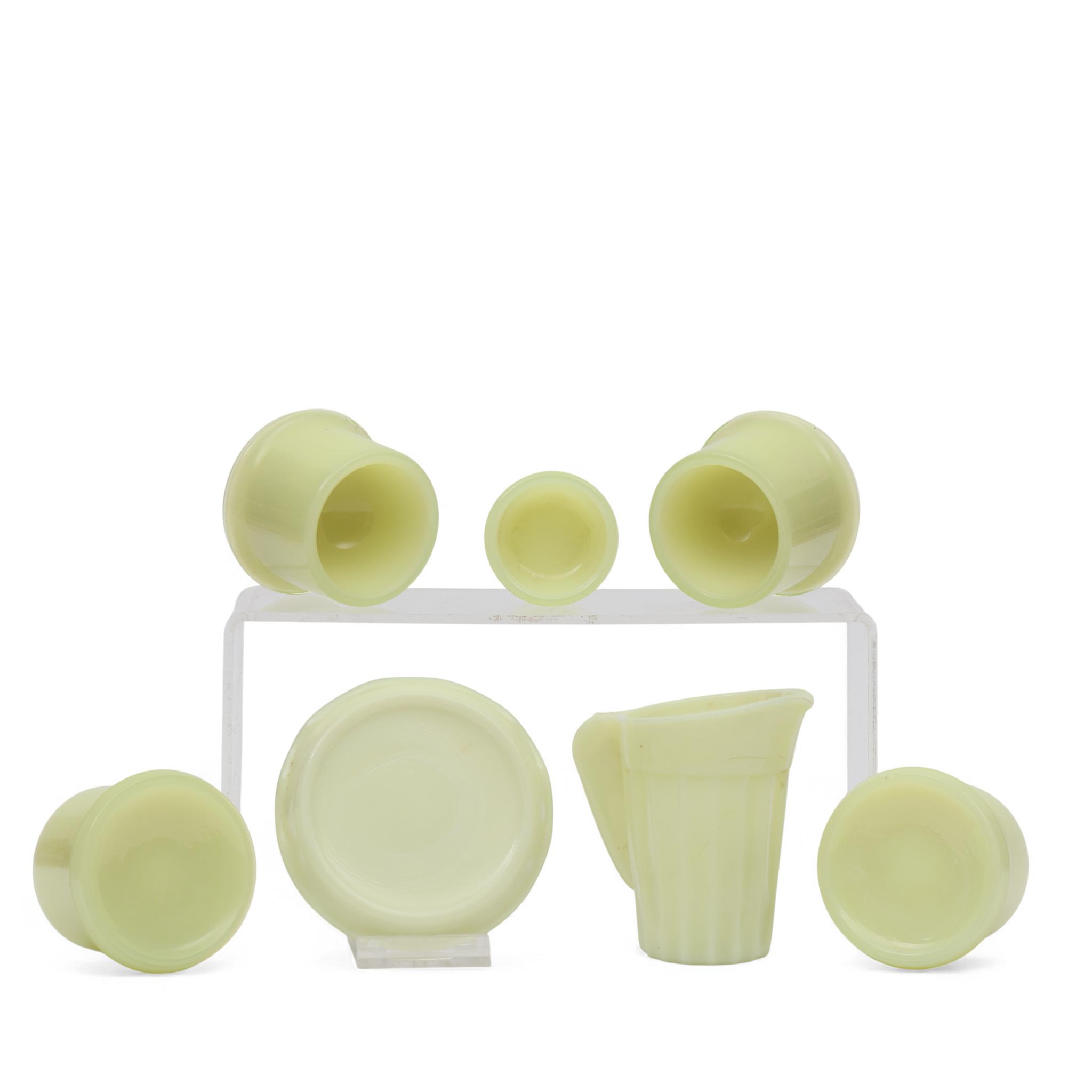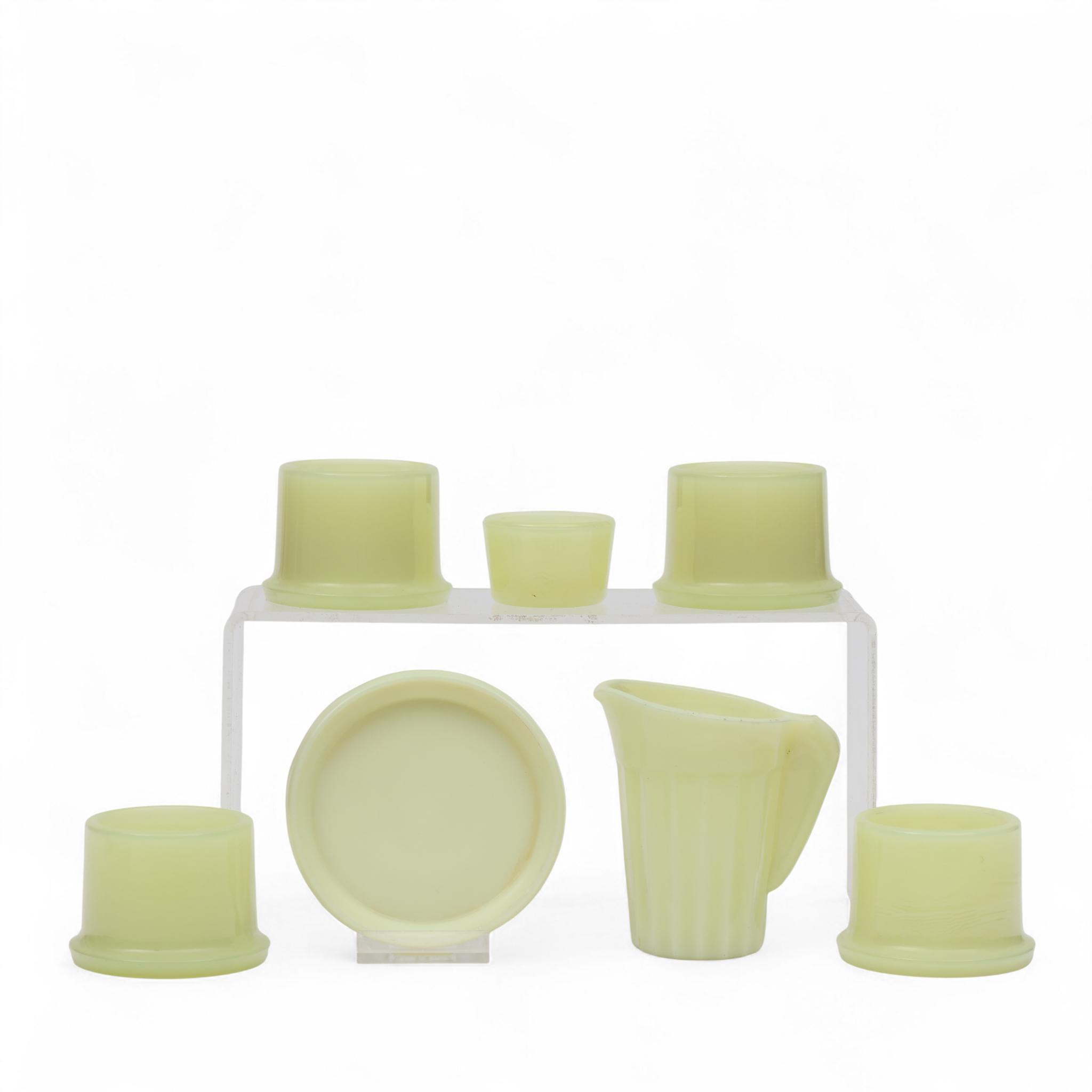 A. D. Copier (1901-1991), vier gele Colopal eierdoppen, zoutvat, roomkannetje en schotel, 1931;