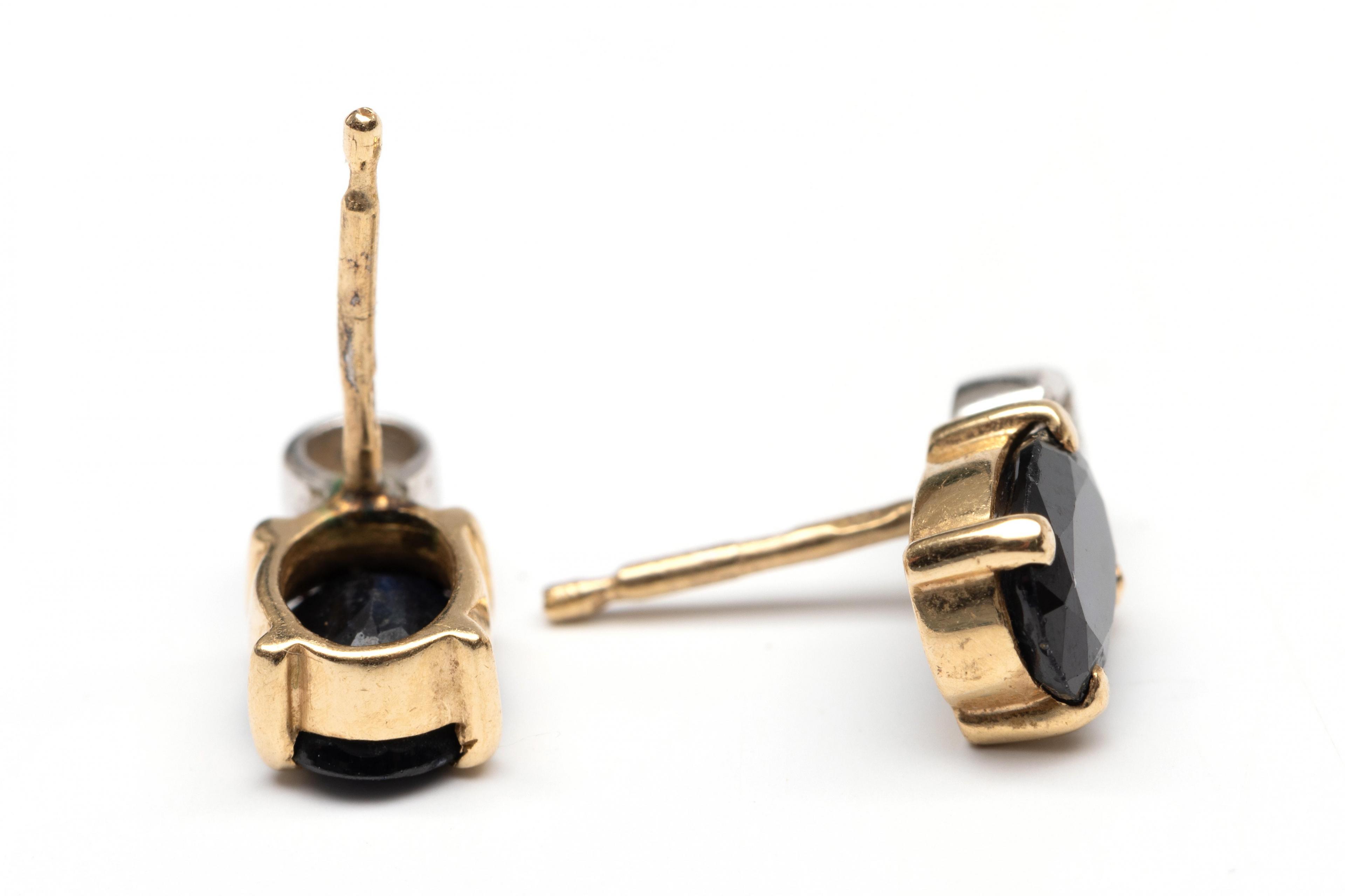 14 k. gold stud earrings, each set with an oval faceted dark blue sapphire (approx. 6.7 x 5 mm) above which a small single cut diamond