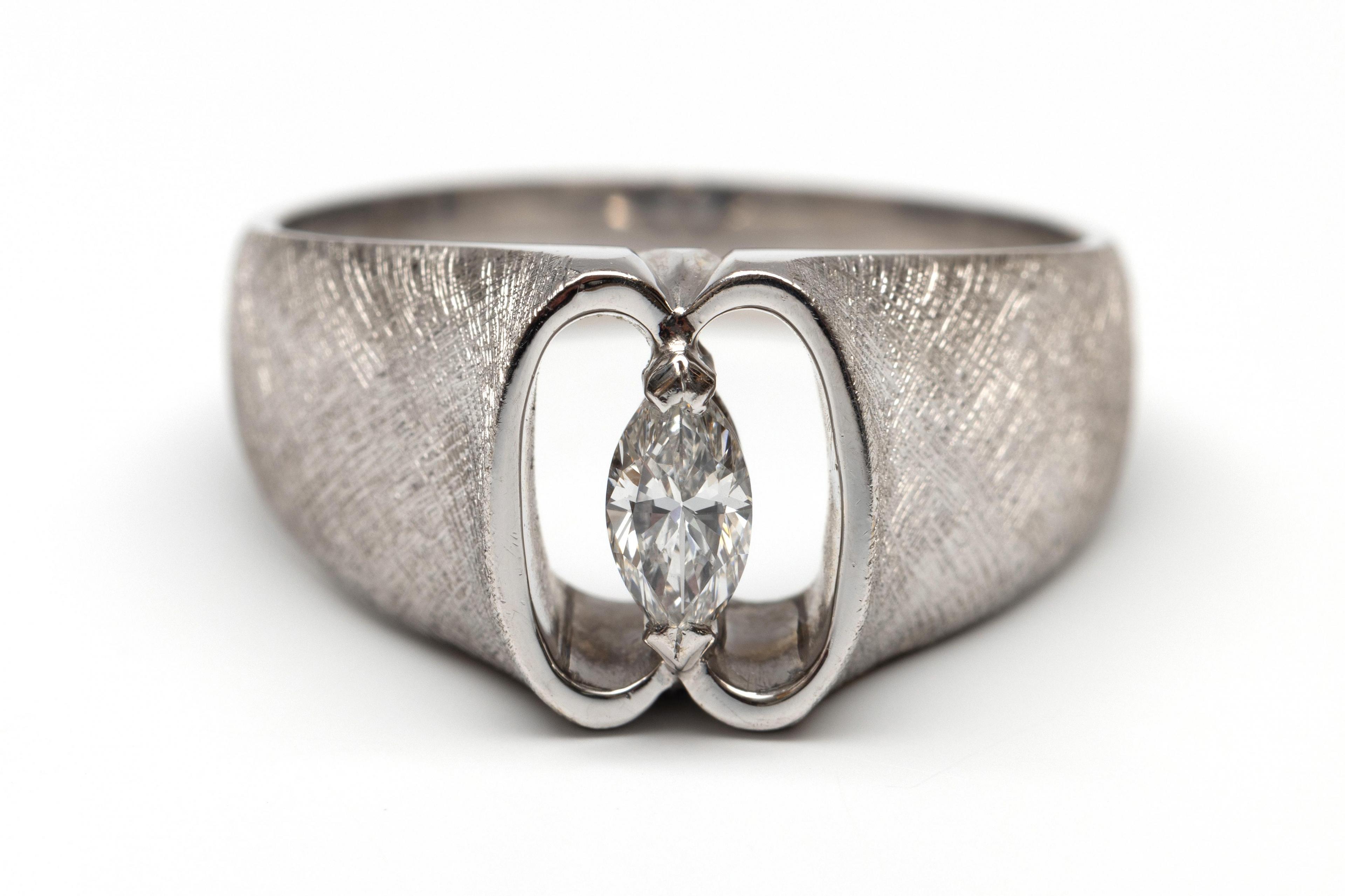 14 k. White gold ring. The top consists of two open ovals between which a marquise-cut diamond of approximately 0.35 ct is set. The surface is cross-hatched. Makers mark Bernard Schipper, Amstelveen, 1973-1994