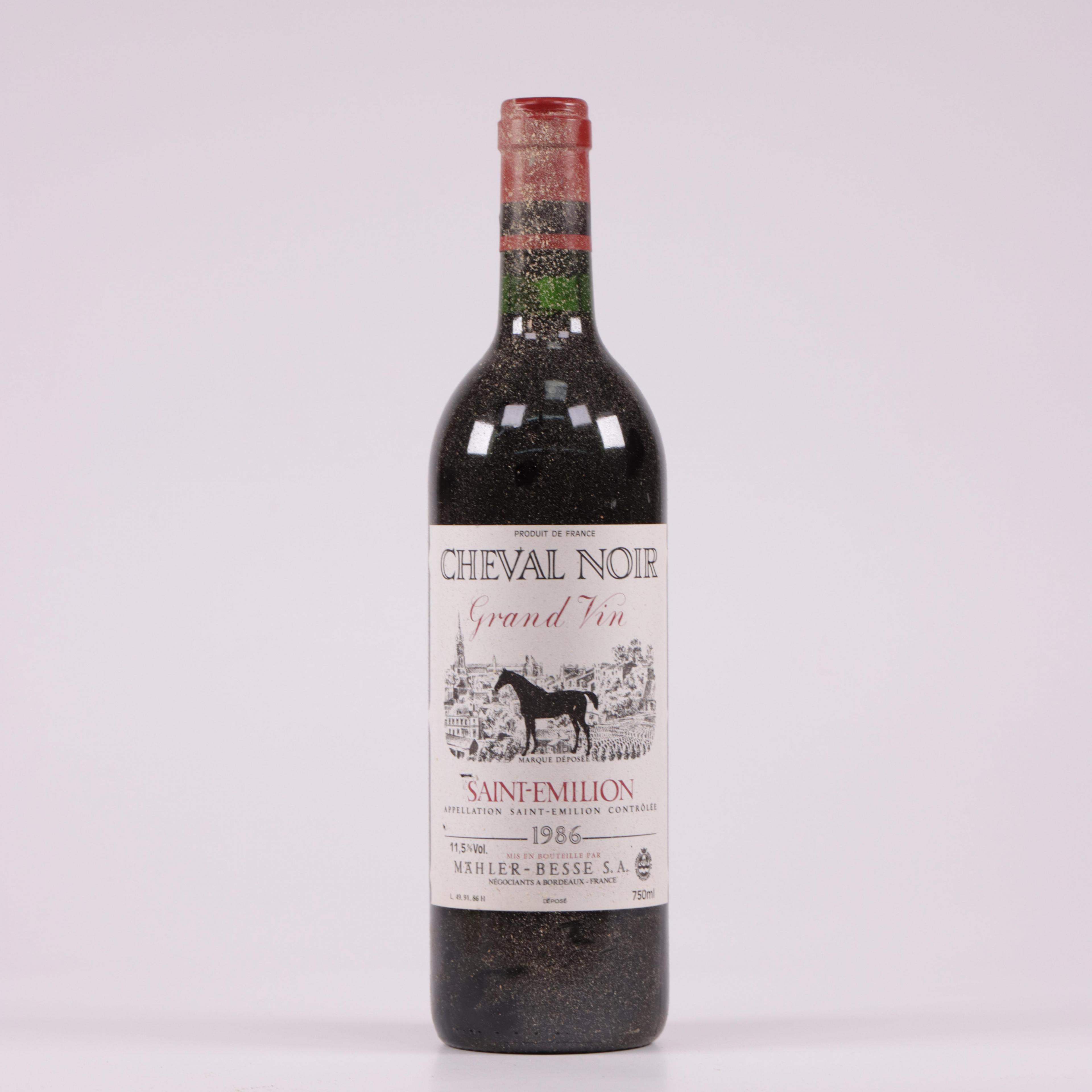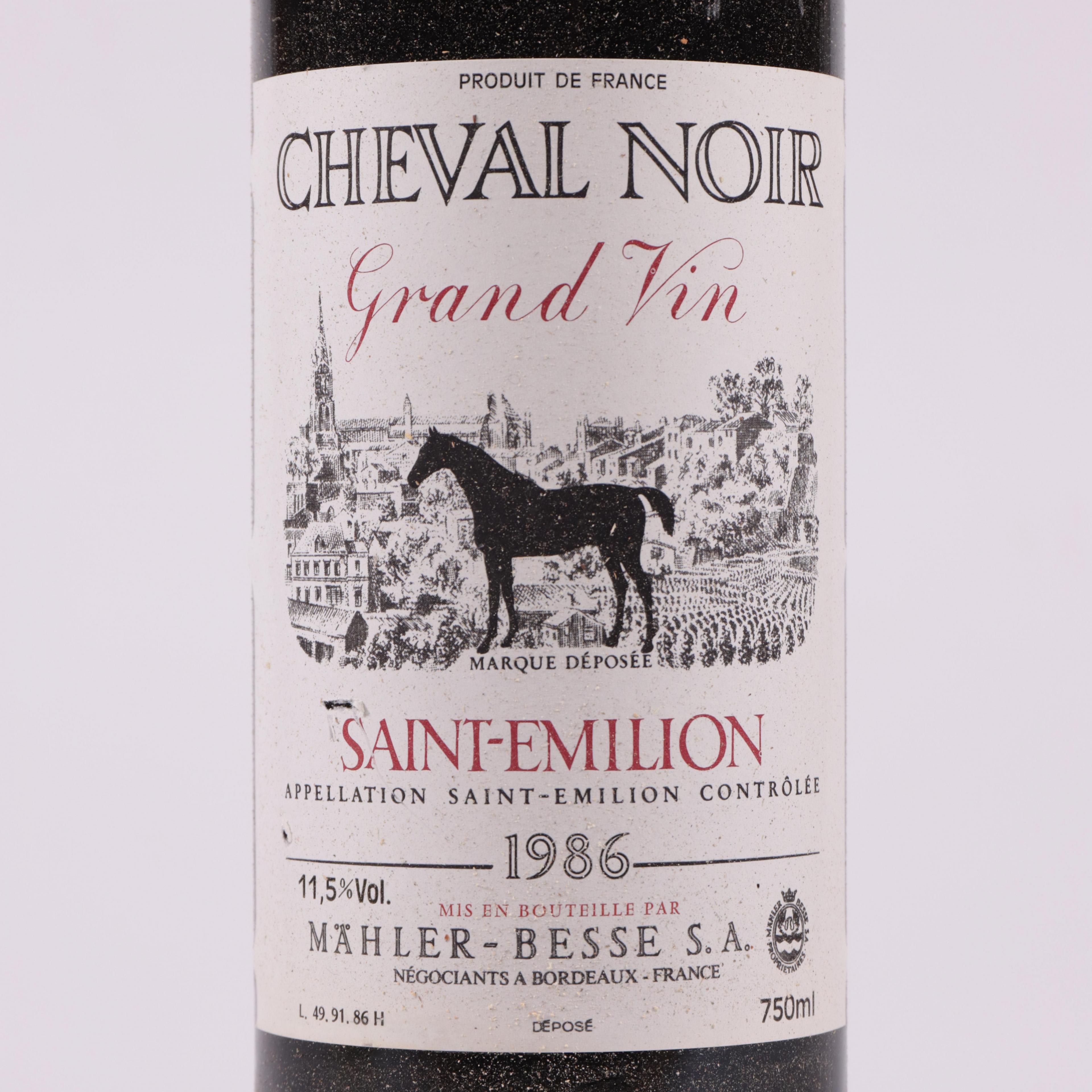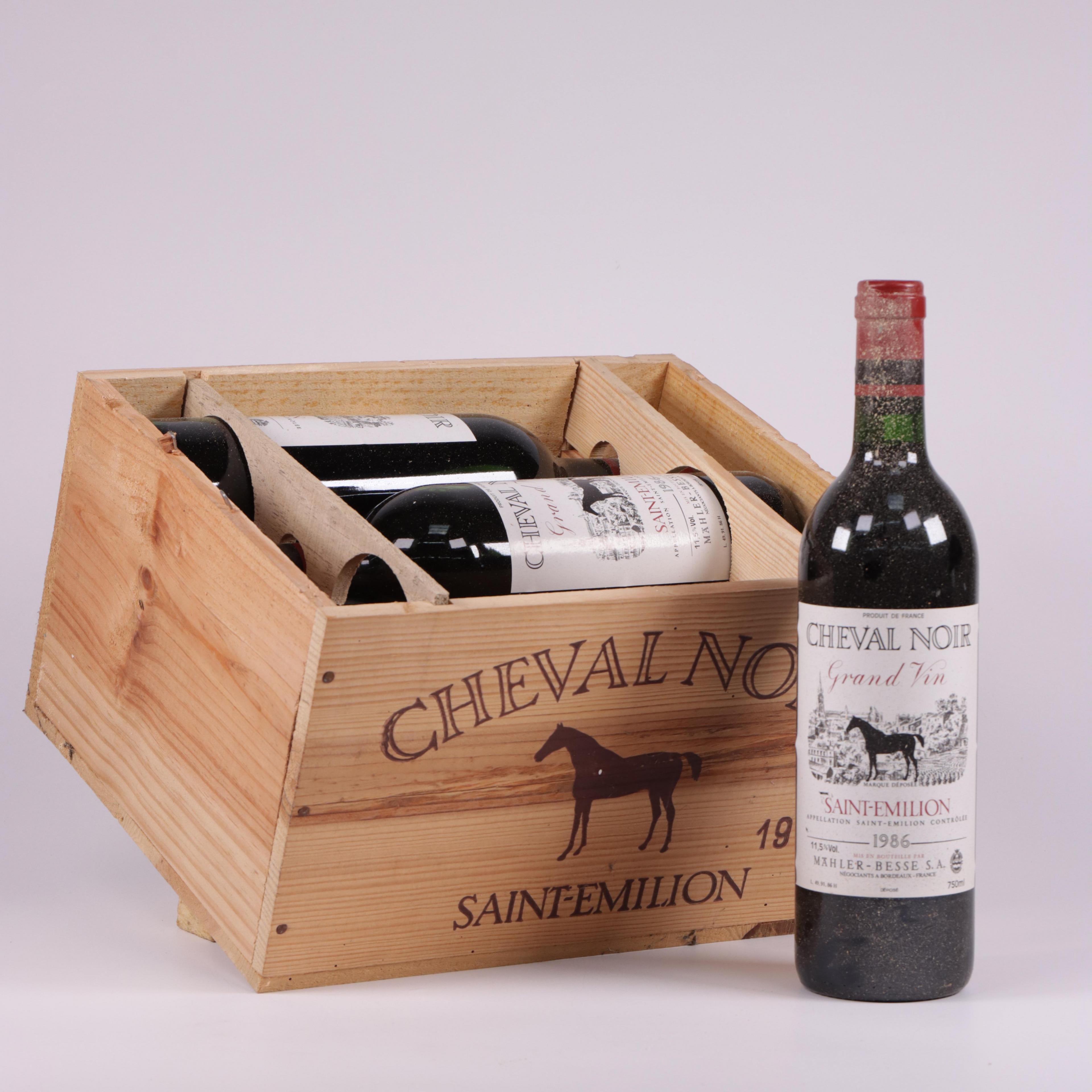 Zes flessen wijn, rood, Cheval Noir, Mahler & Besse, Saint Emilion, 1986. In kist, deksel manco.