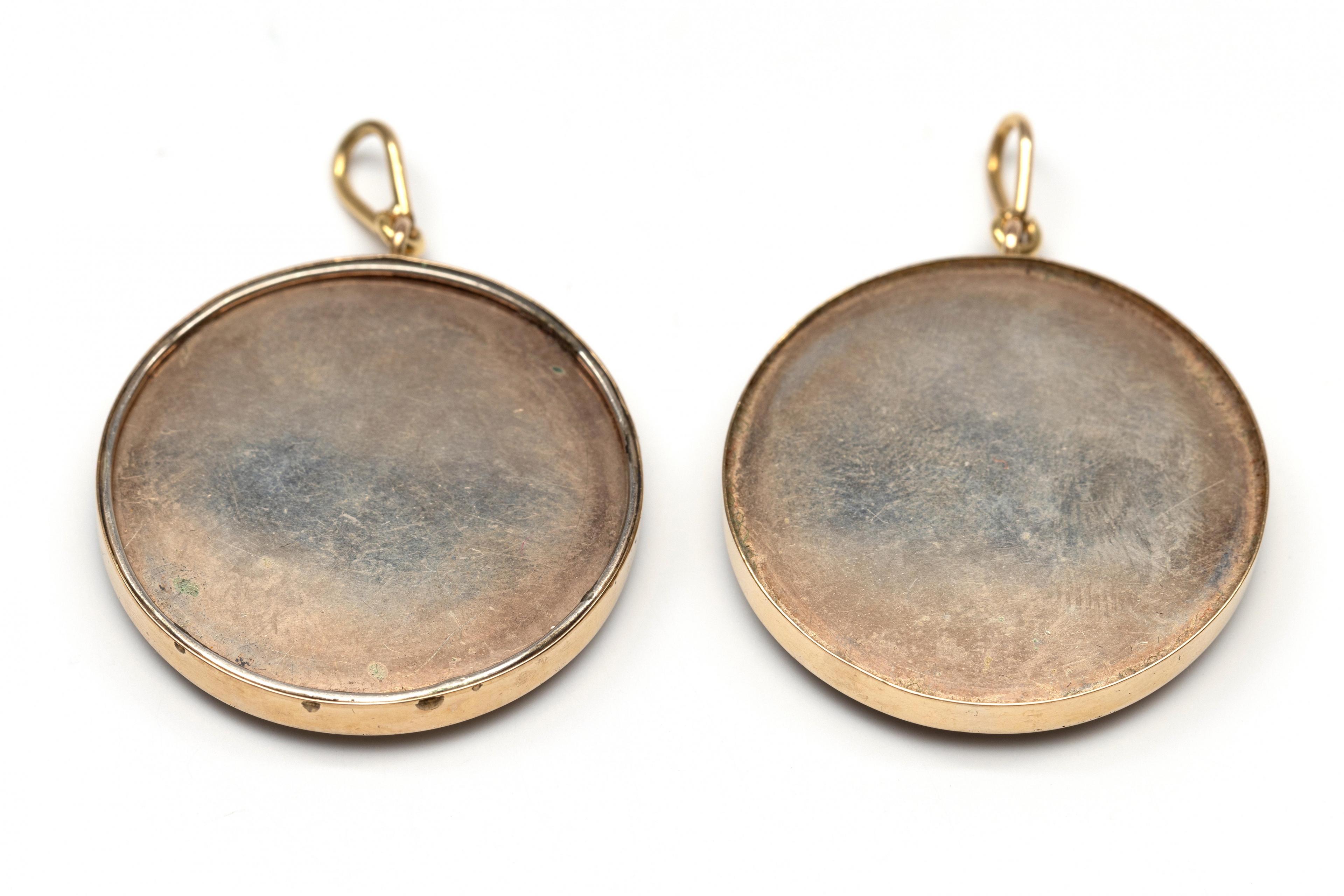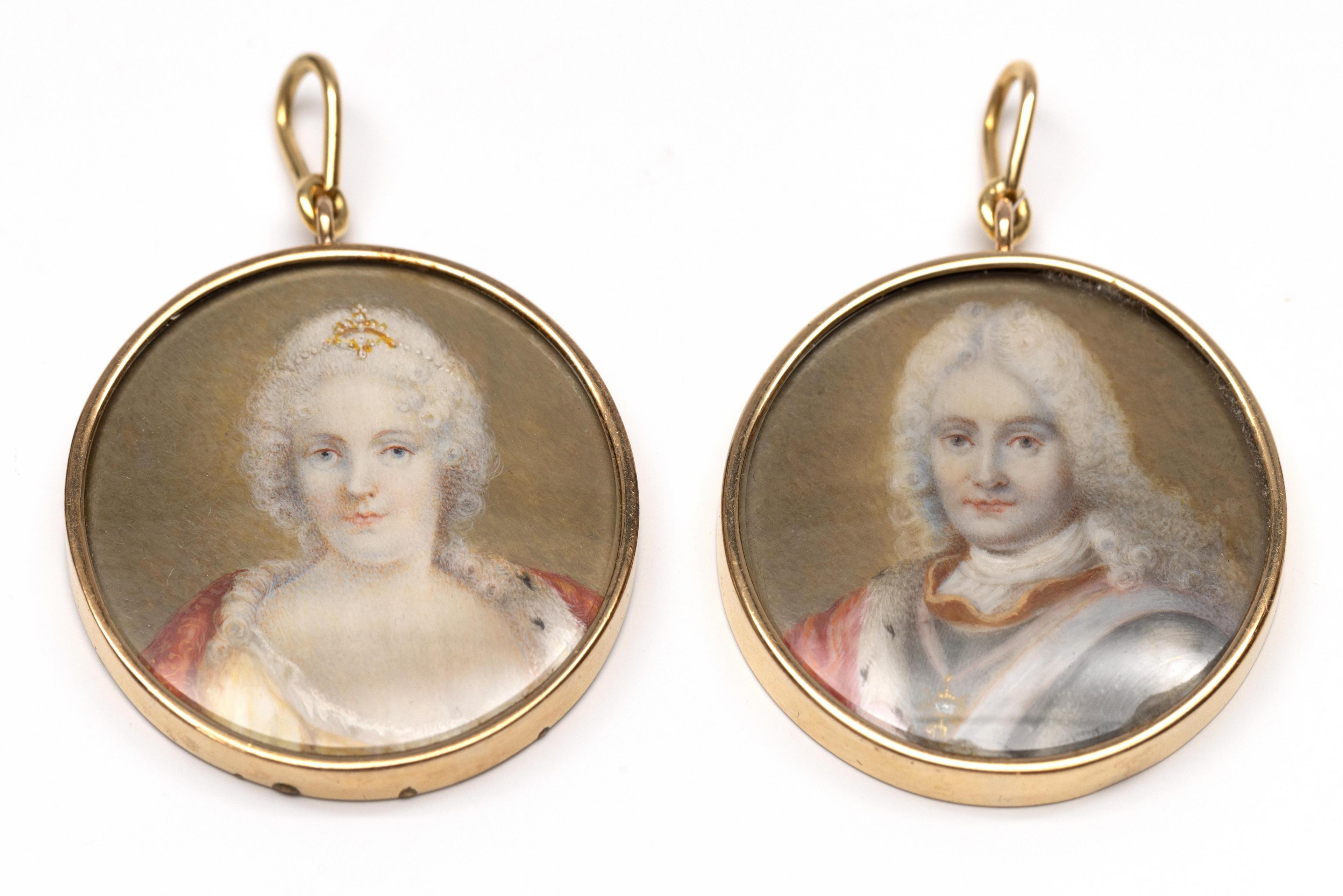 Two 14 k. gold pendants, 19th century. Both with a miniature portrait. One of a richly dressed gentleman, the other of a lady.