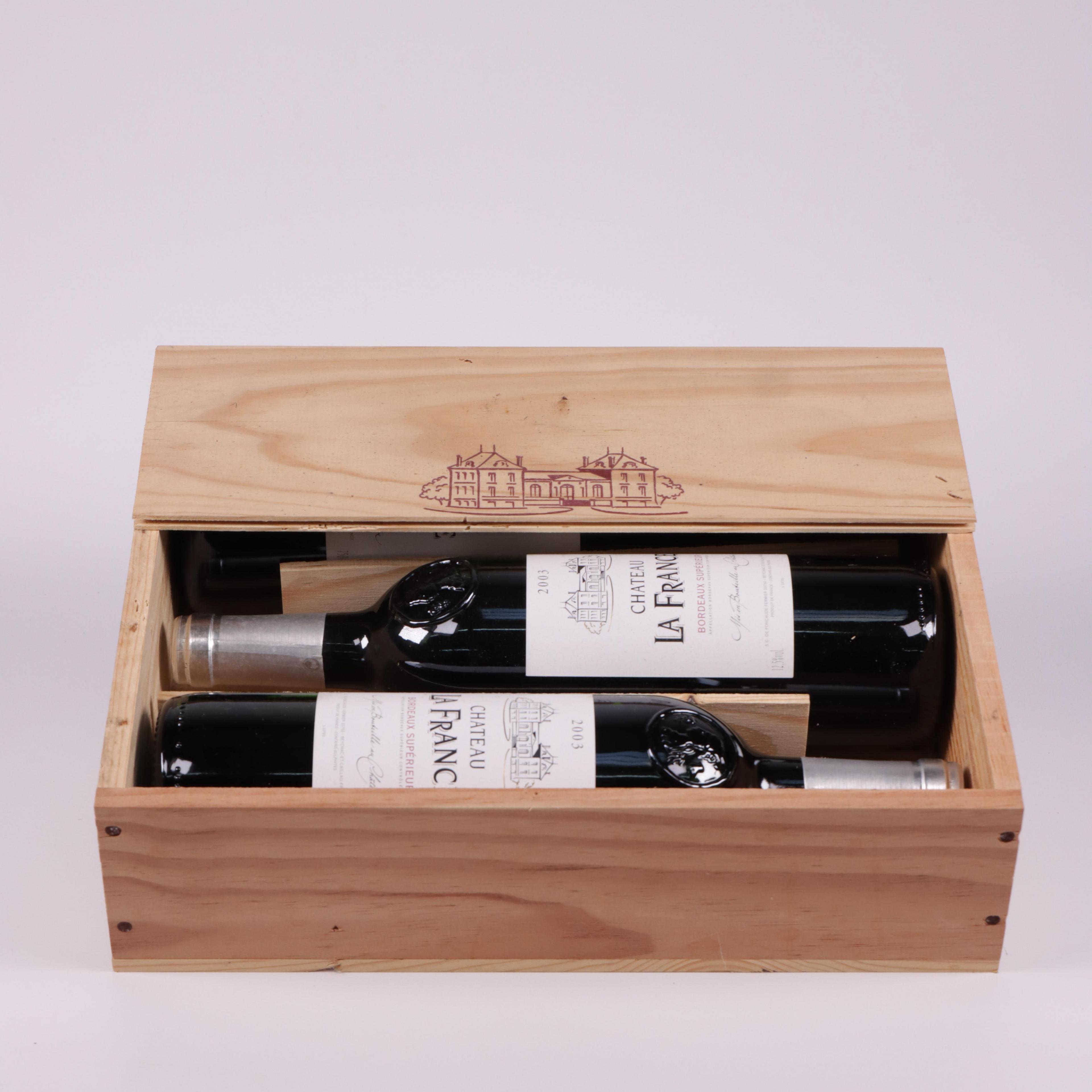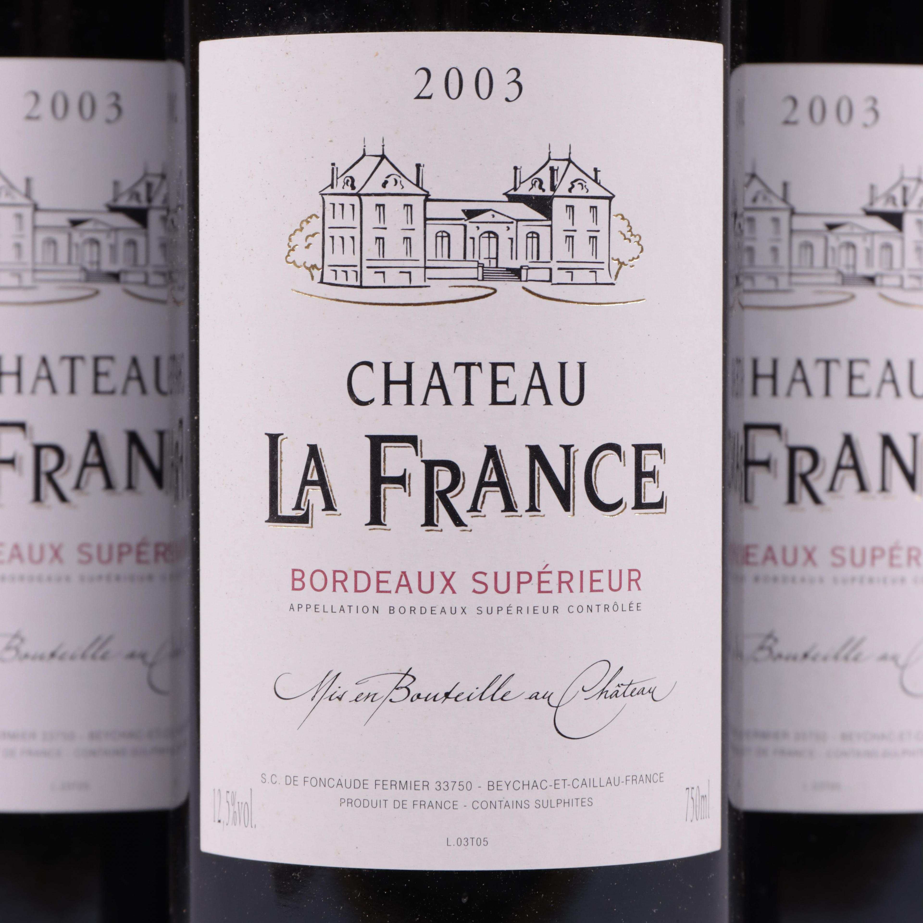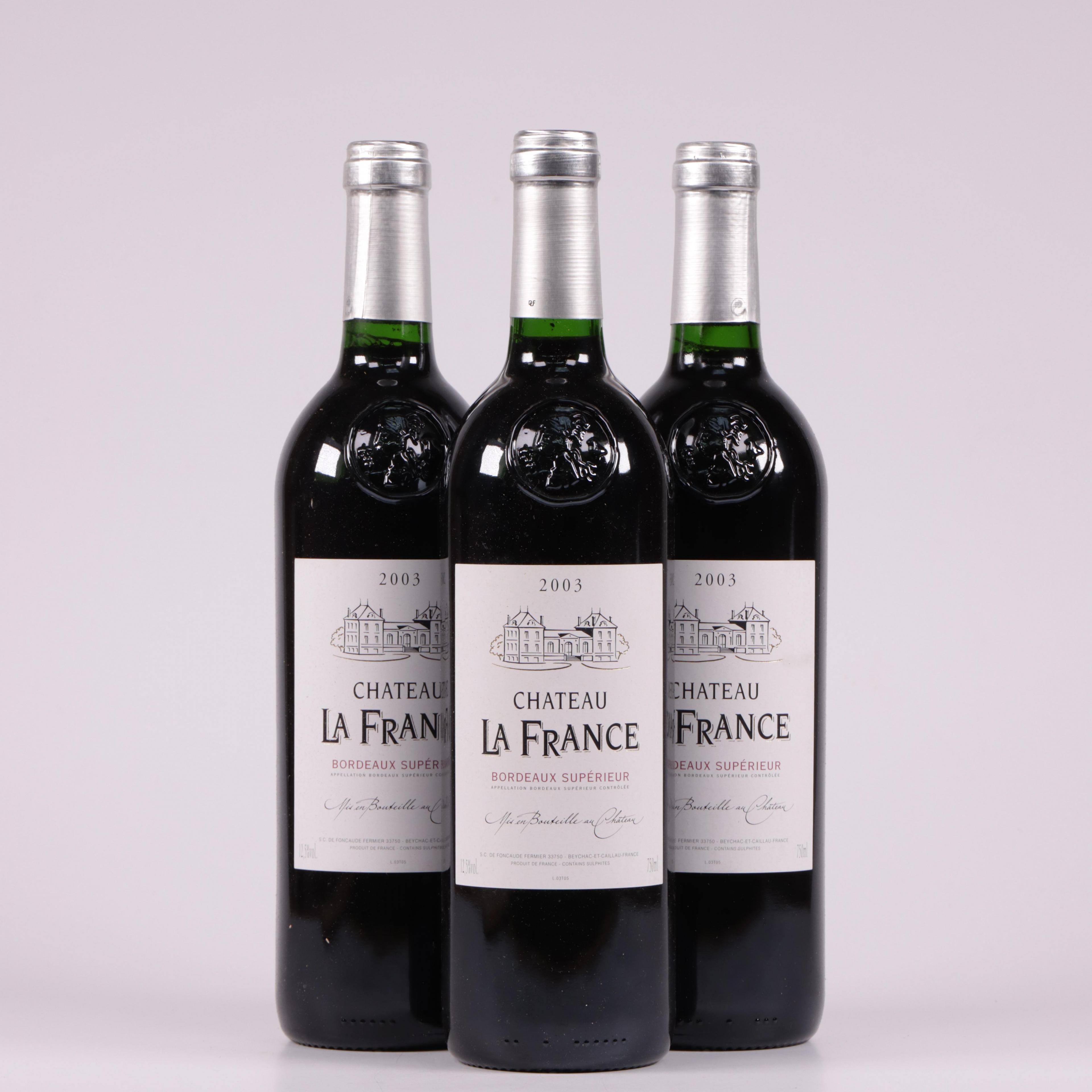 Drie flessen wijn, rood, Chateau La France, Bordeaux Superieur, 2003. In kist.