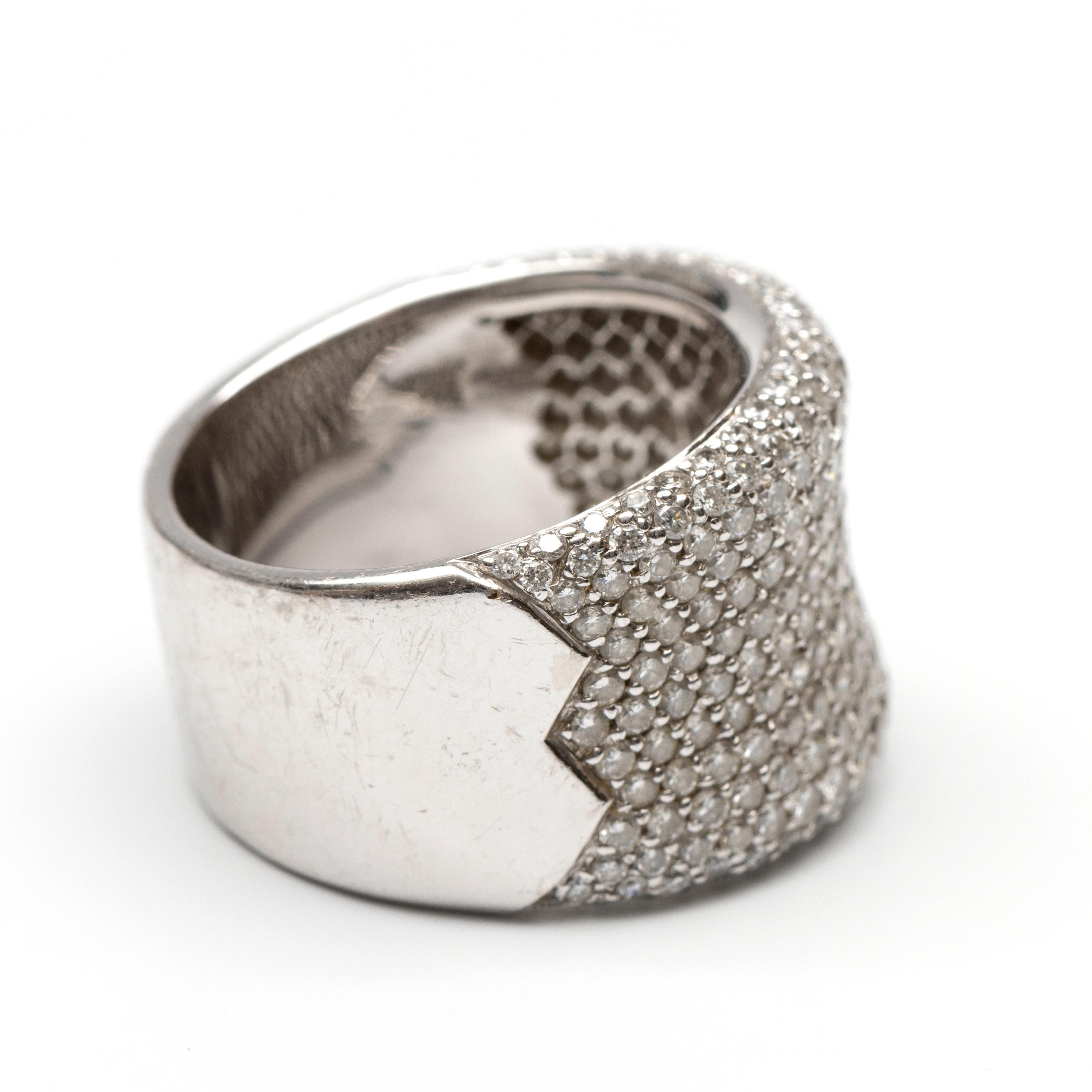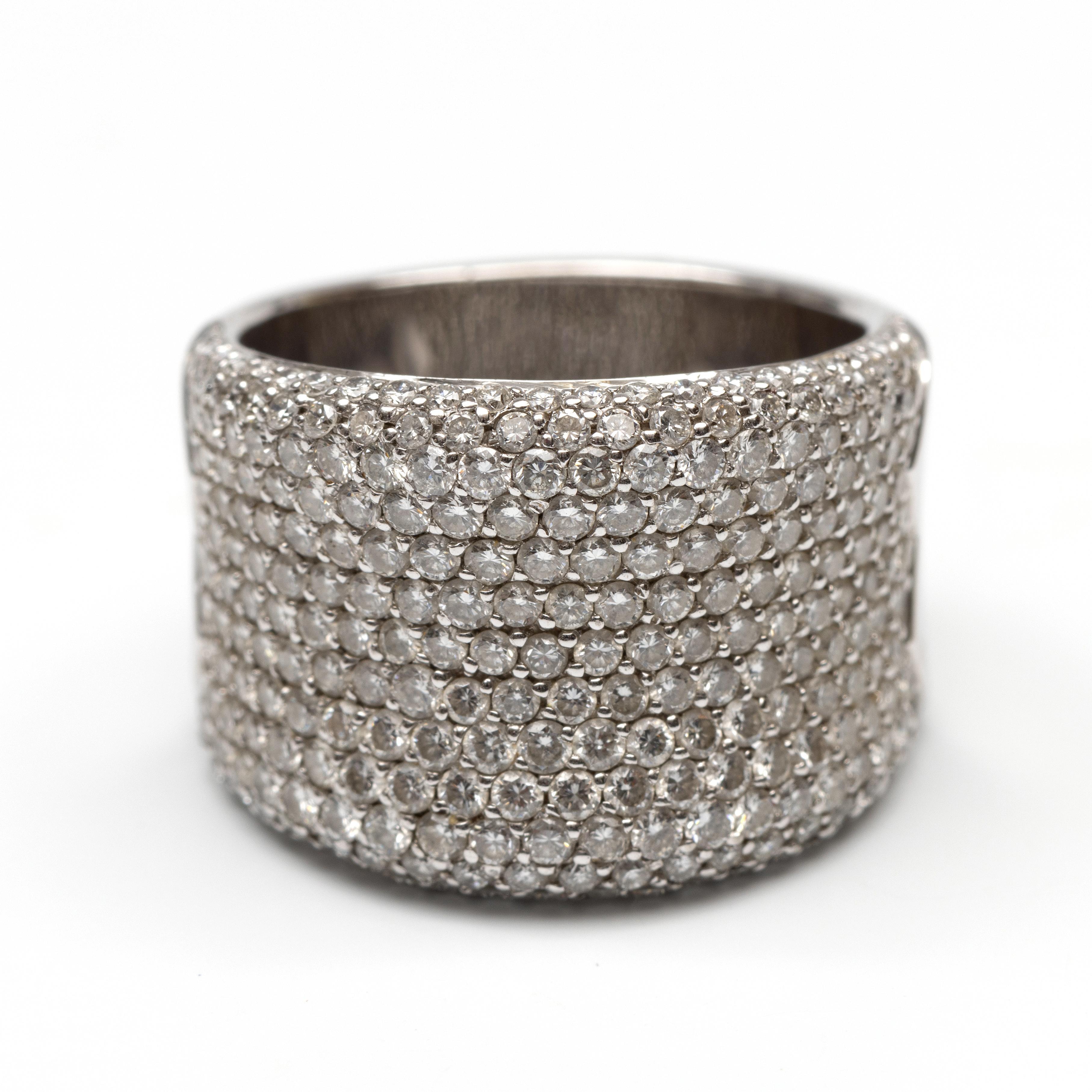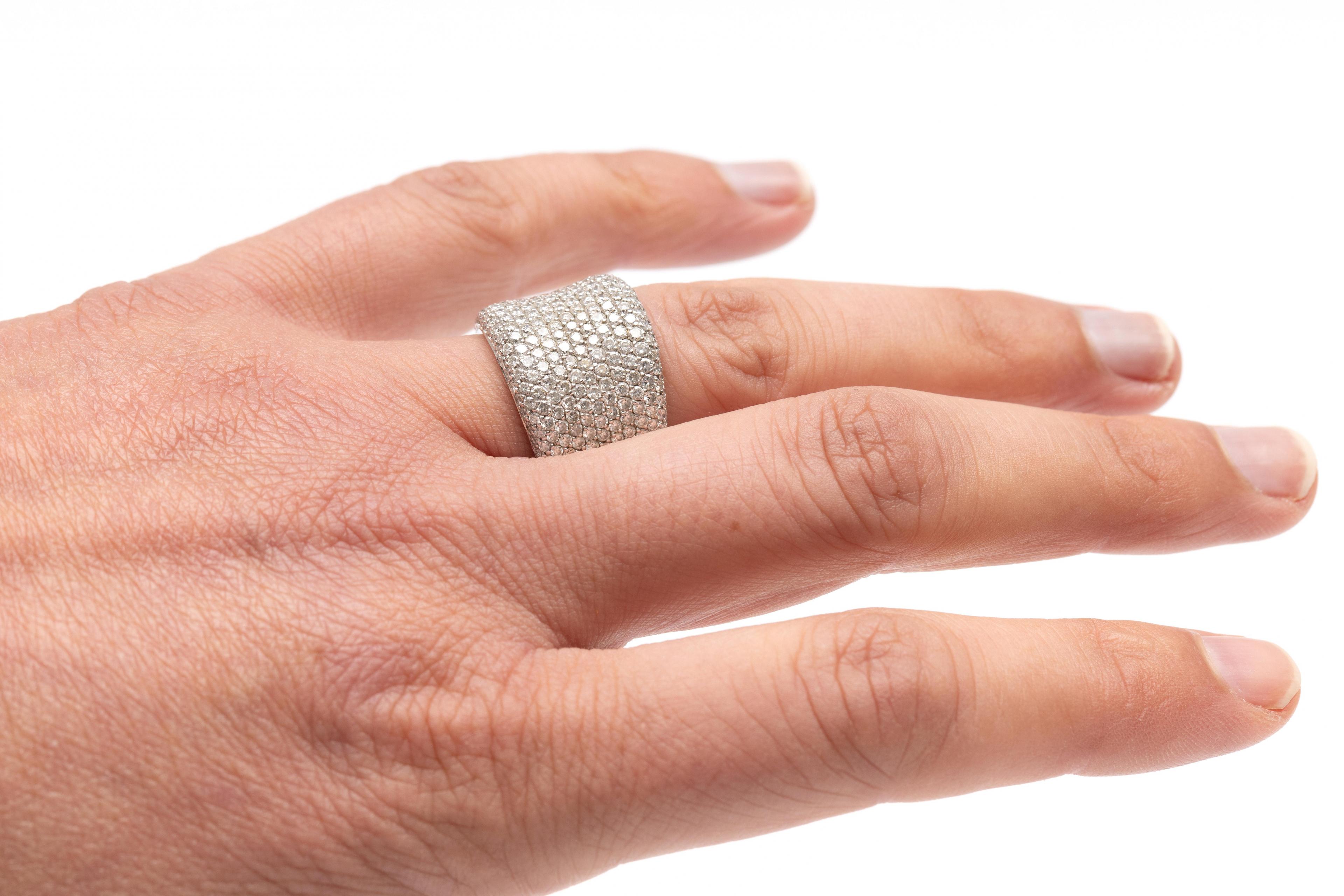 Platinum band ring. The top is slightly concave and pavé-set with brilliant-cut diamond weighing approximately 1.35 ct.