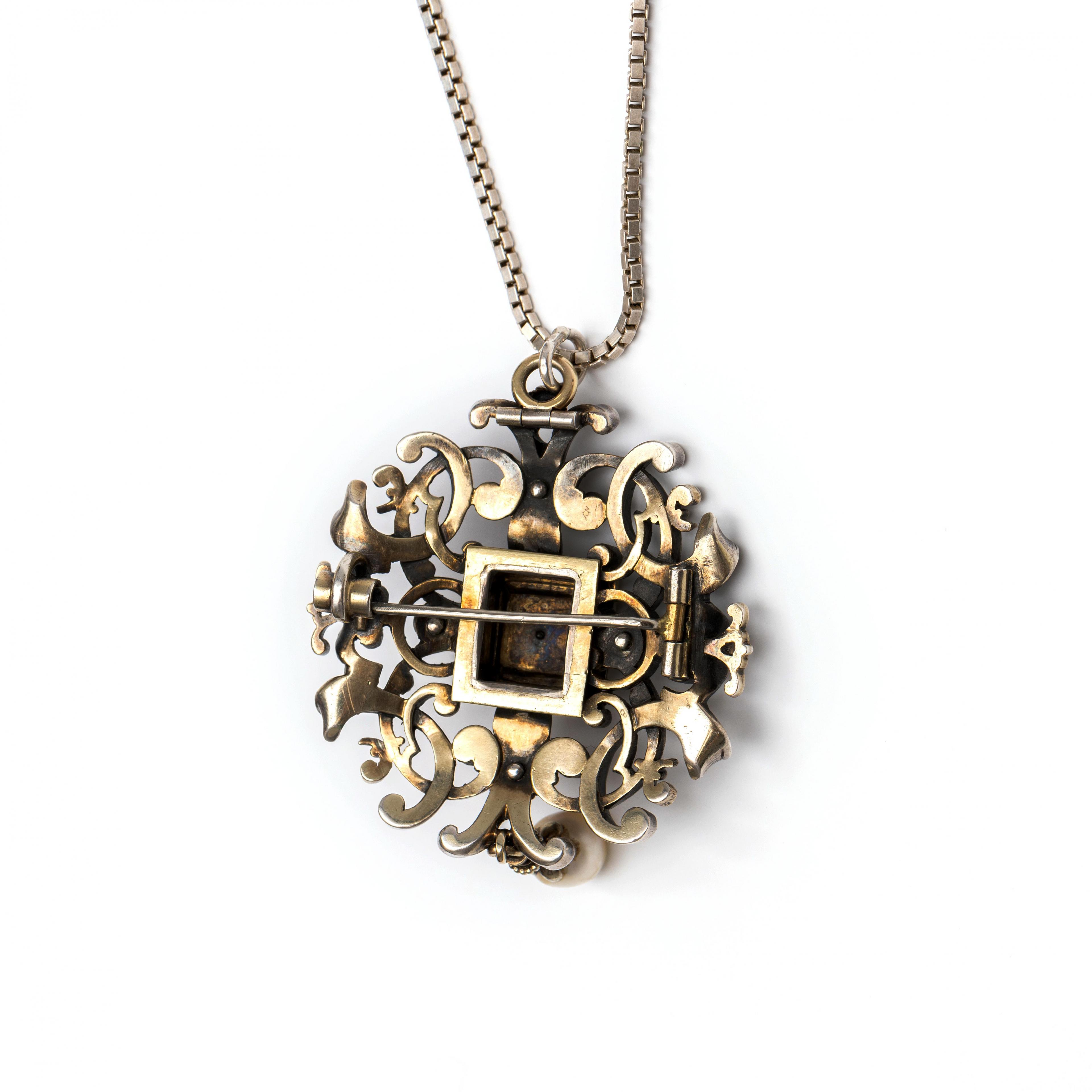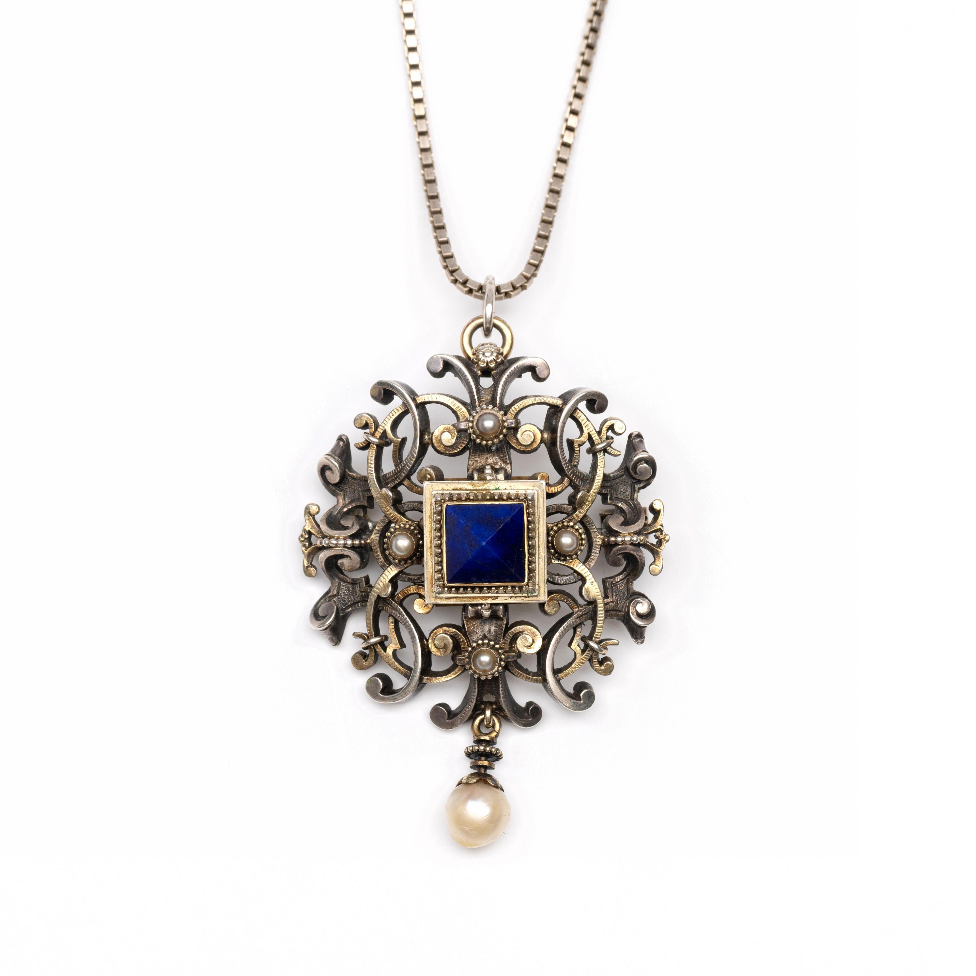 14 k. Gold and silver brooch, also a pendant, 19th century. In Neo-Renaissance style, composed of volutes and scrolls. Centrally set with a pyramid-cut lapis lazuli and half-pearls. A natural pearl dangles loosely at the bottom (no certificate available). On a silver box link necklace.