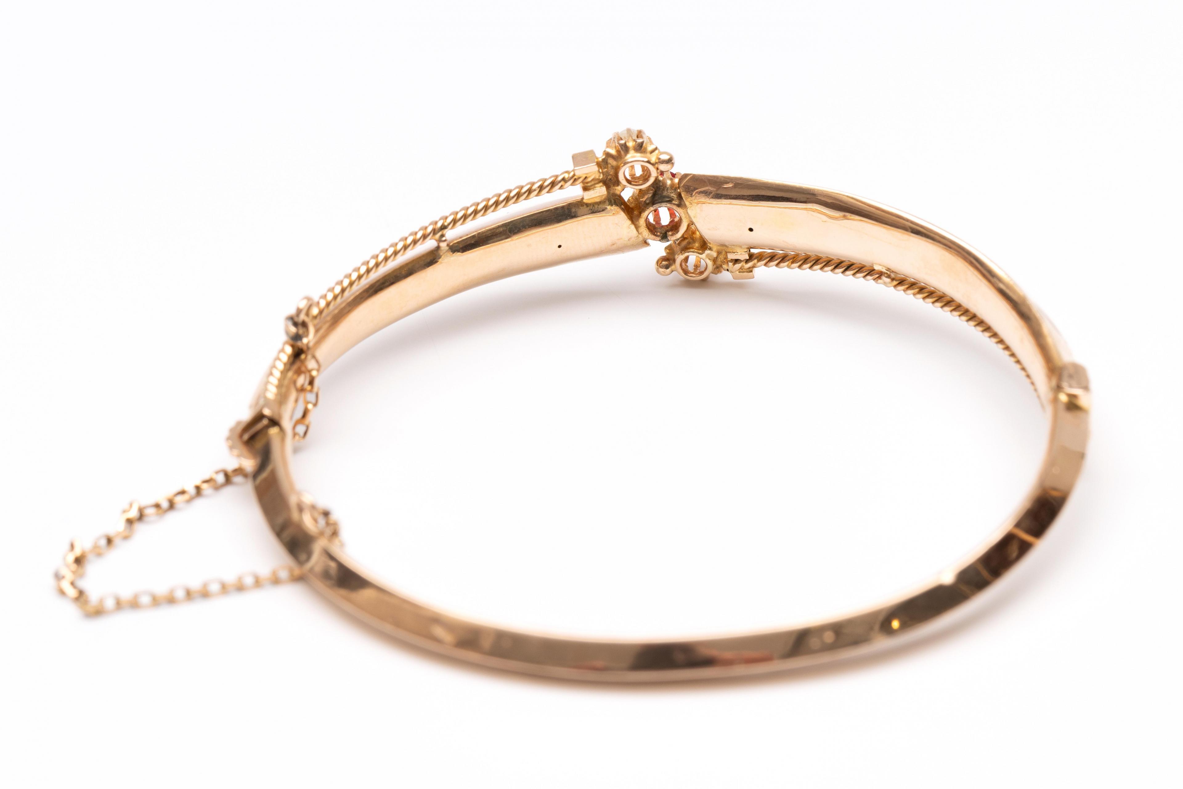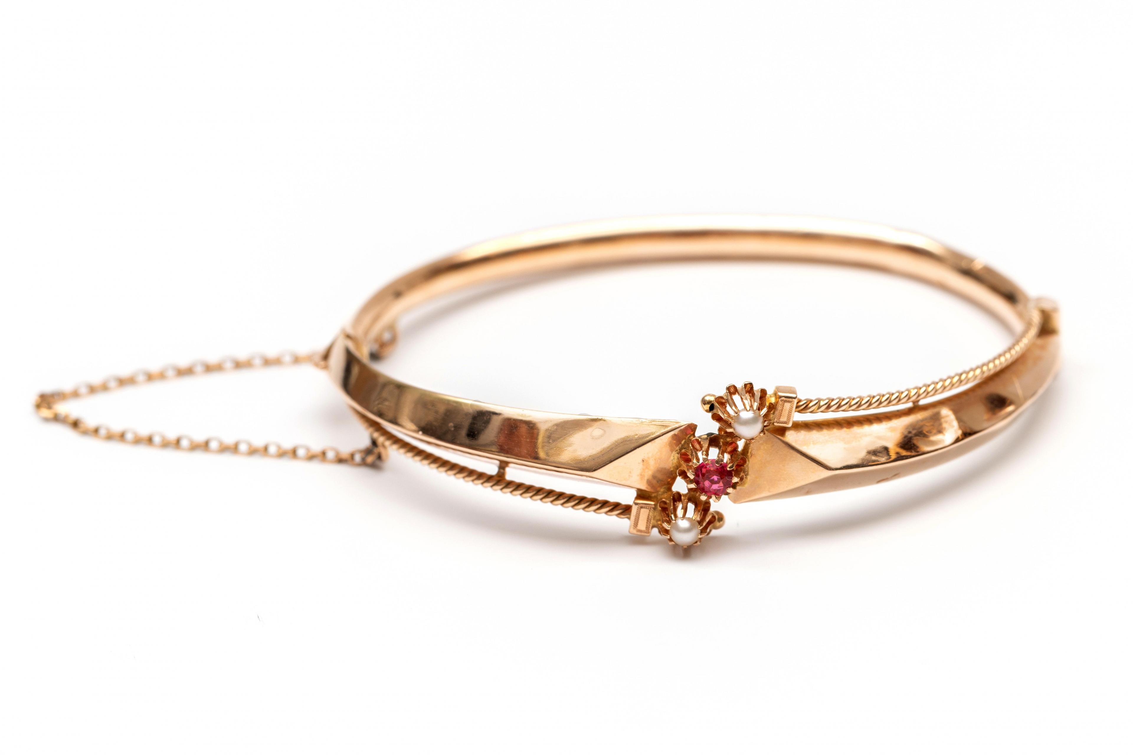 14 k. Gold rigid bracelet, 19th century. The top with two twisted wires ending in a split pearl between which a faceted ruby