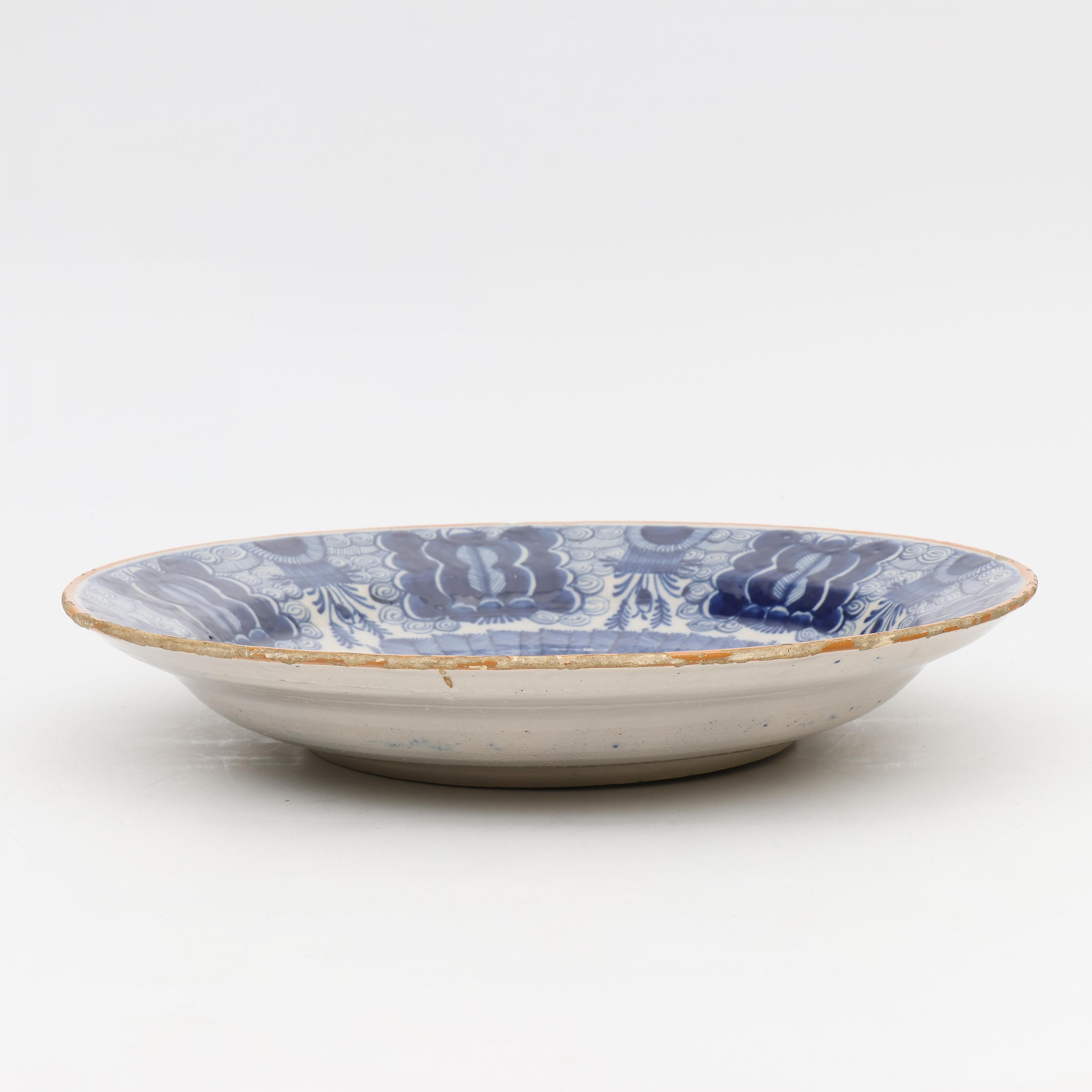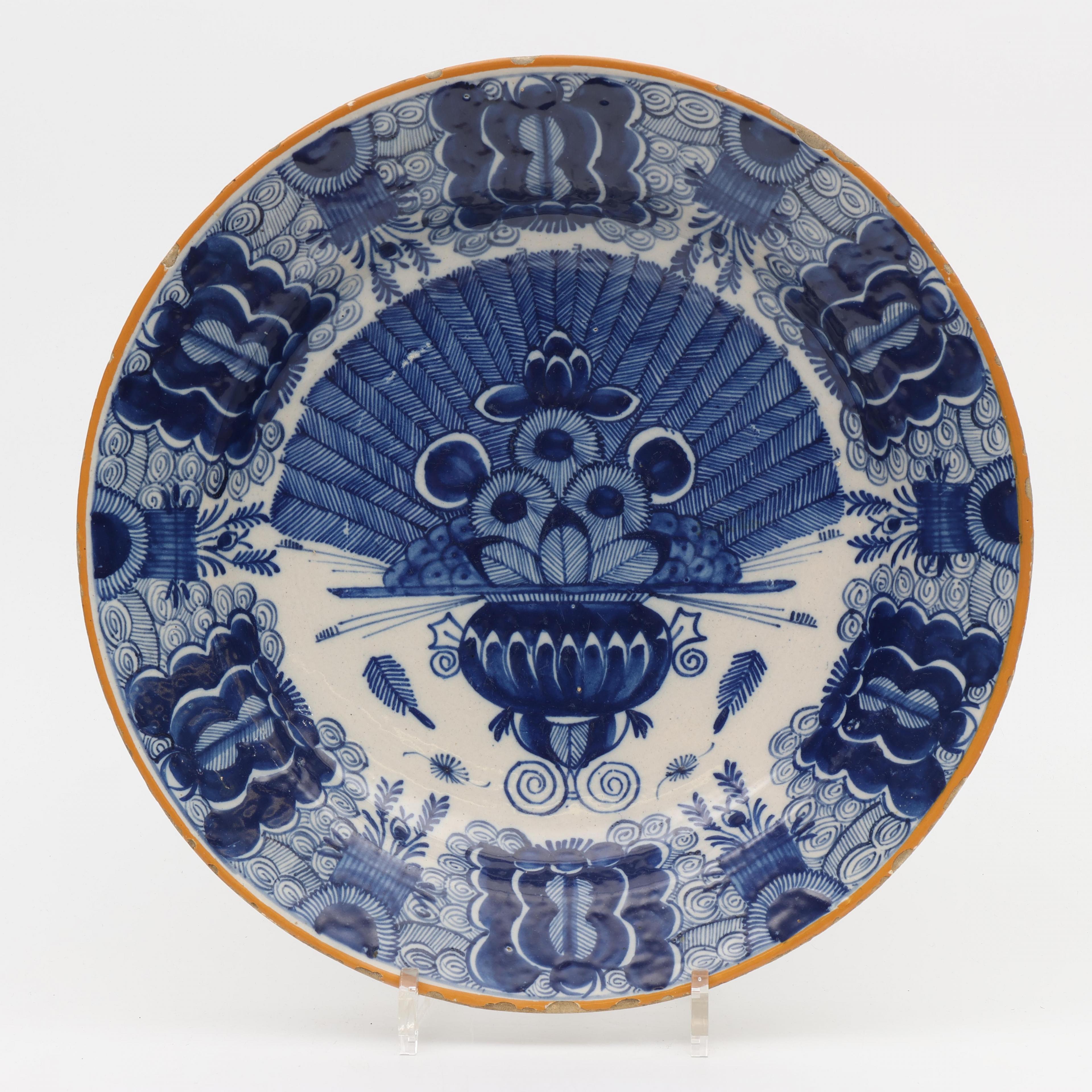 Delft, blauw wit aardewerk pauwenschotel, 18e eeuw;