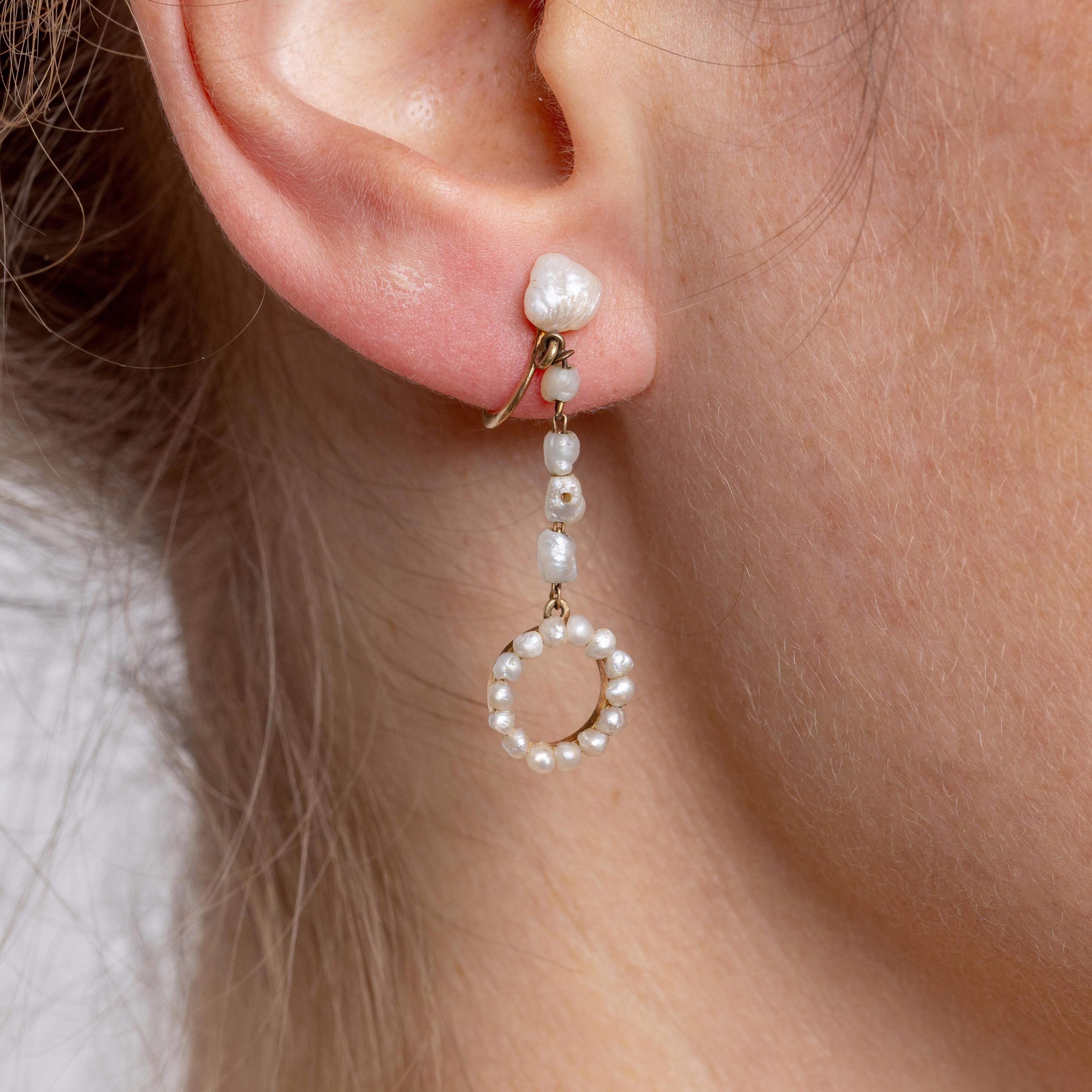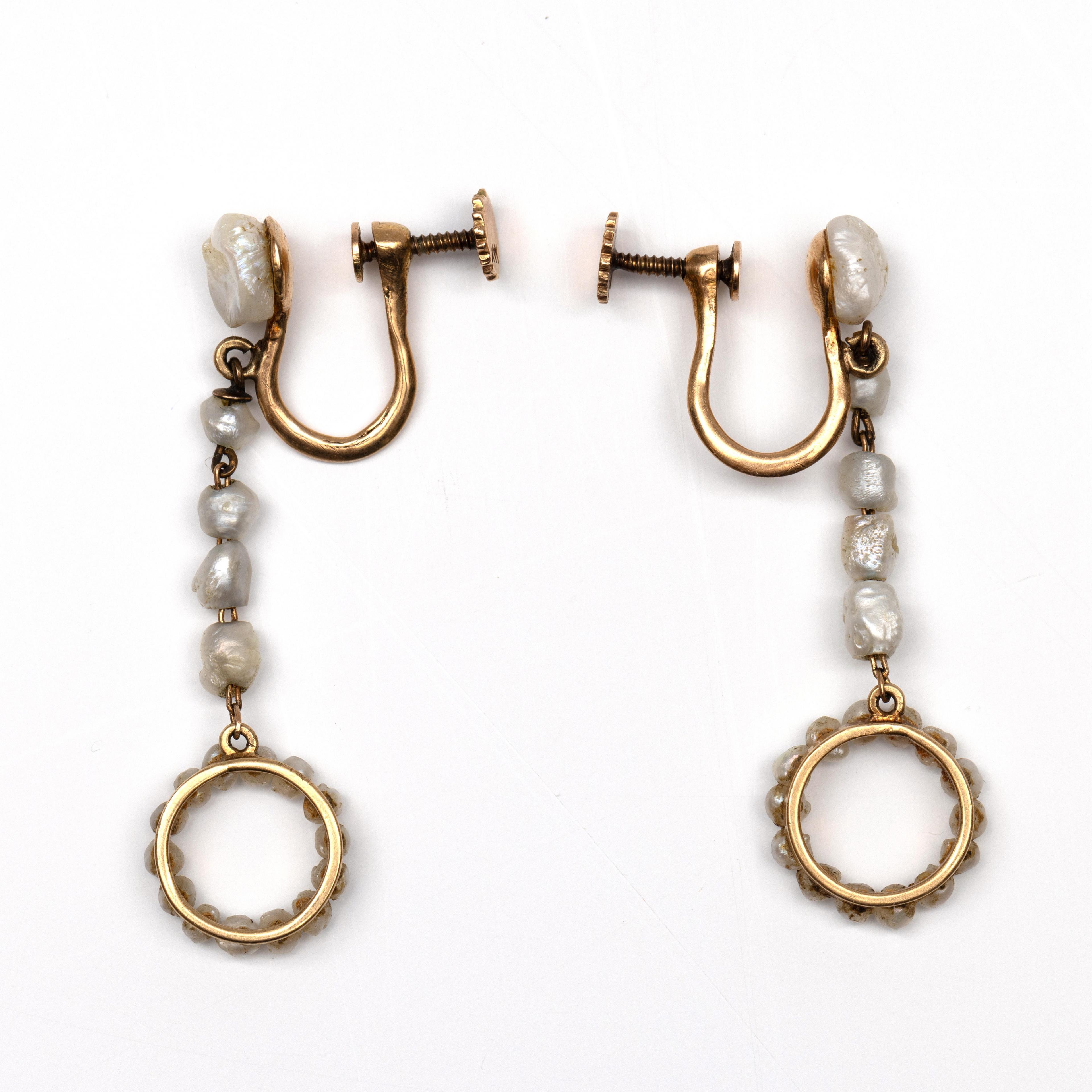 Gold ear screws, circa 1900. With a circle at the bottom. Set with natural freshwater pearls, probably Mississippi pearls. No certificate available.
