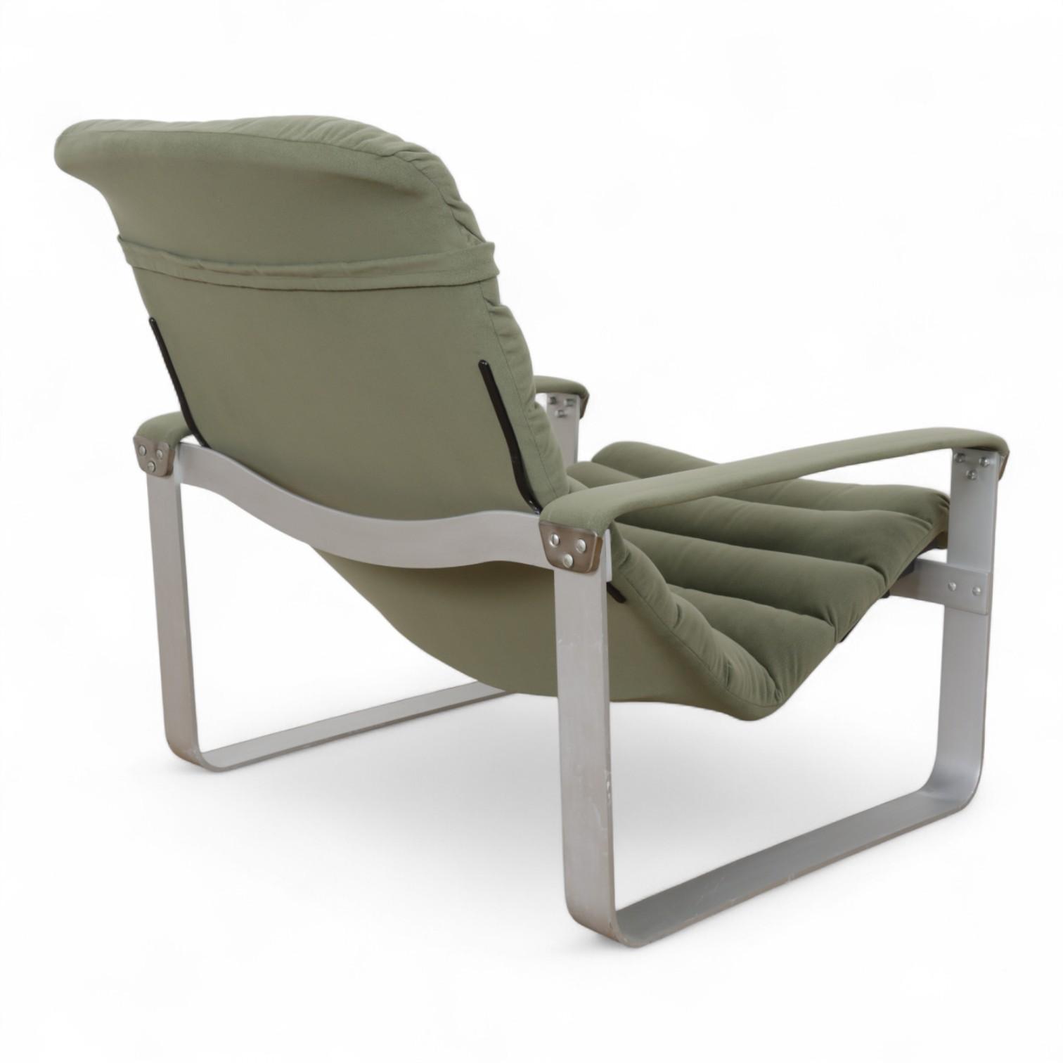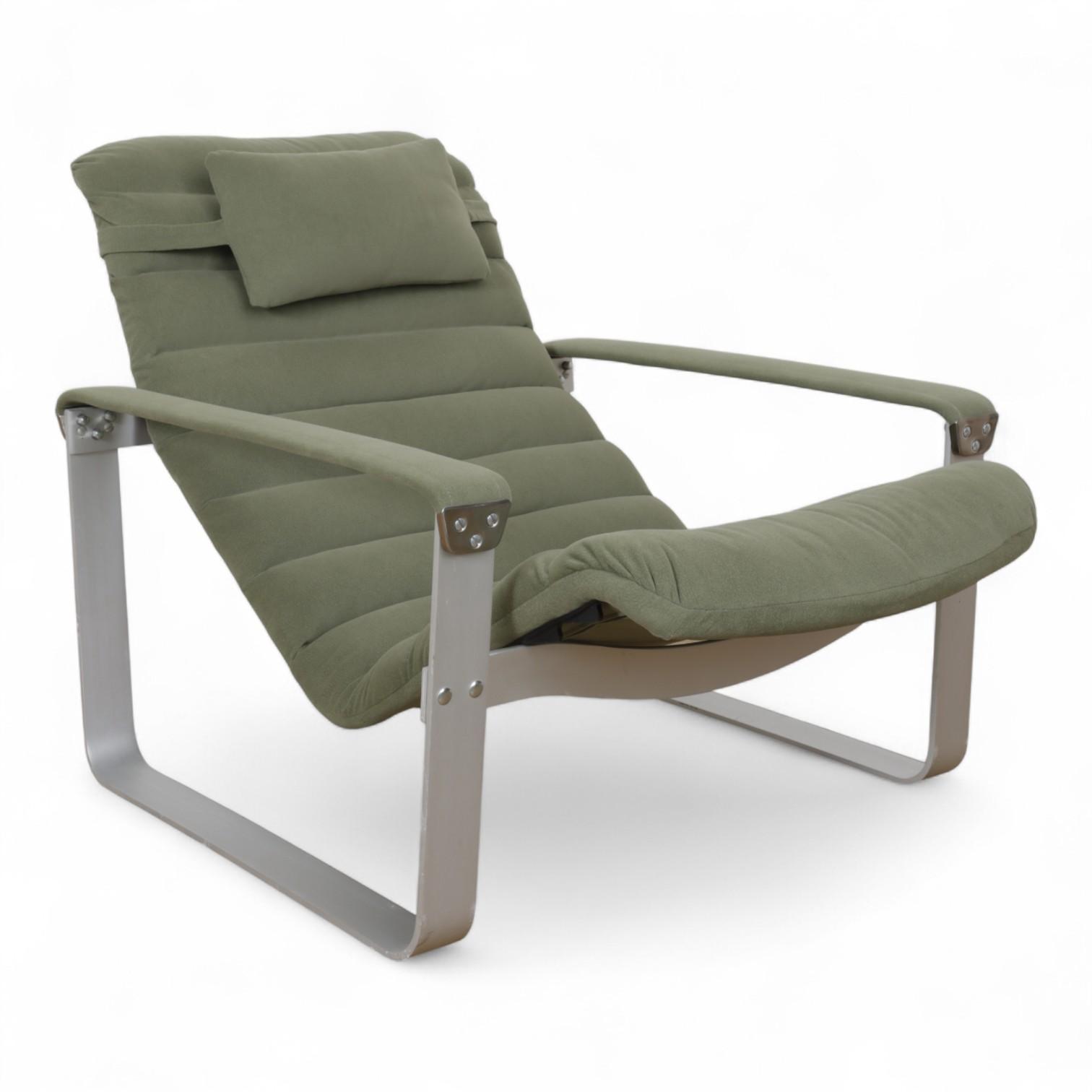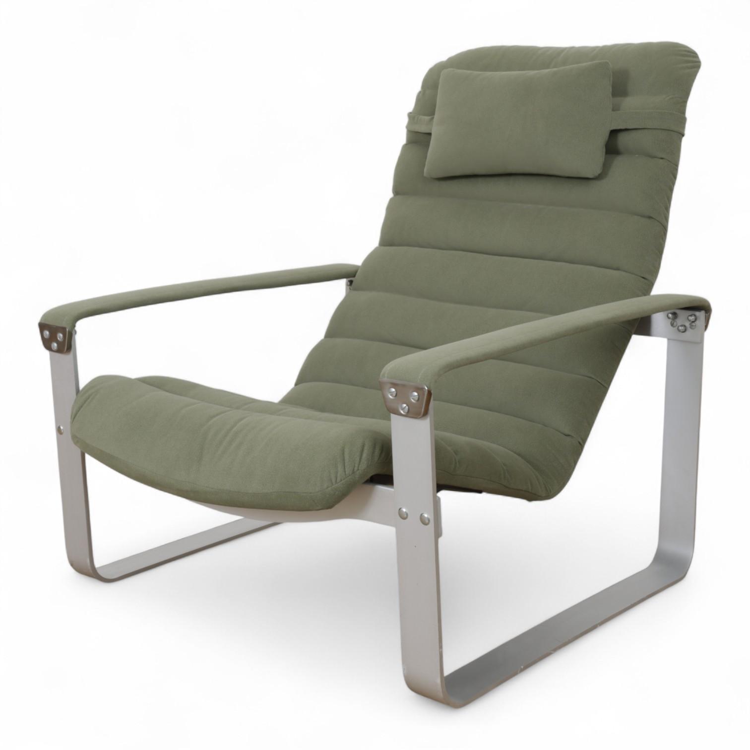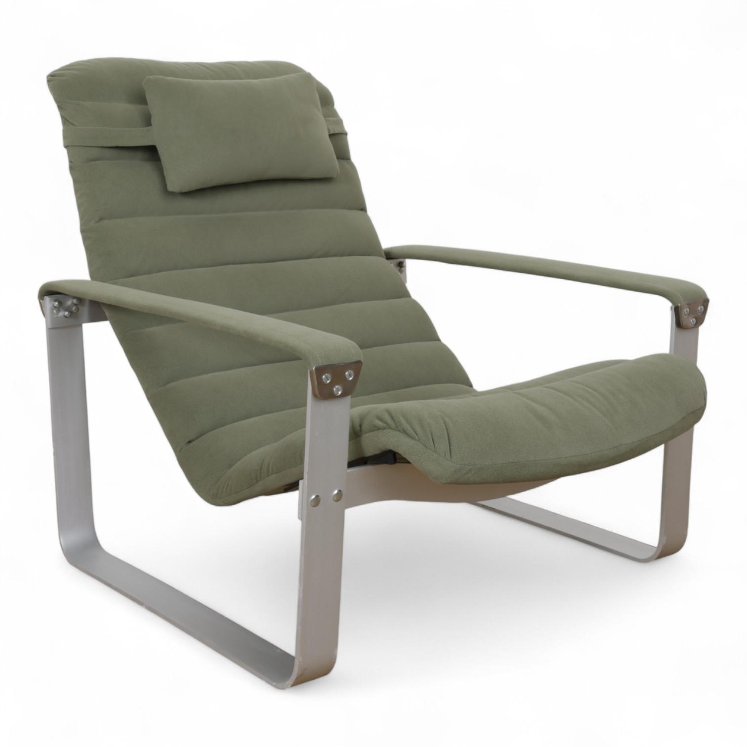 Zitgedeelte bekleed groene stoffering, los op aluminium onderstel. Met los hoofdkussen. Verstelbaar in drie standen