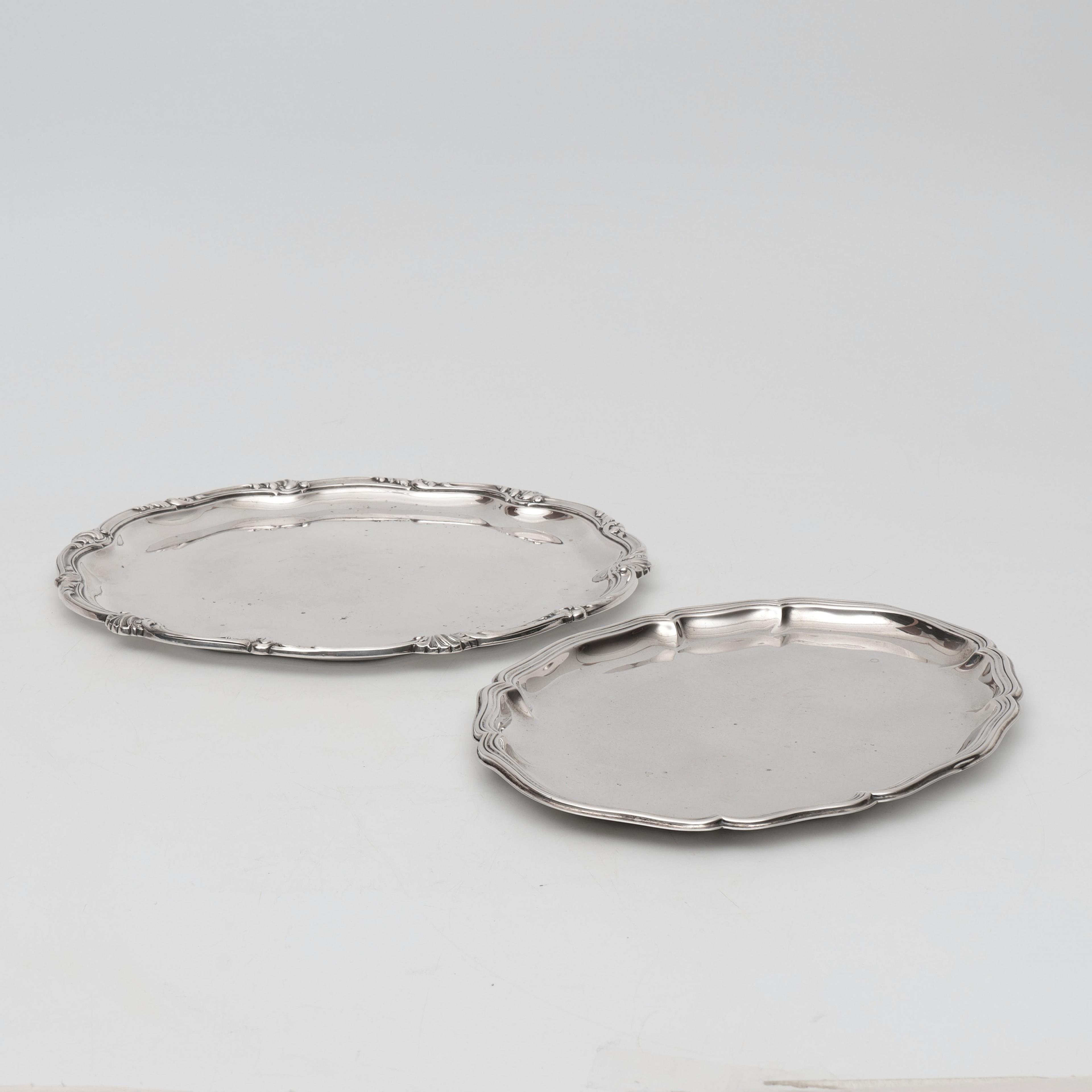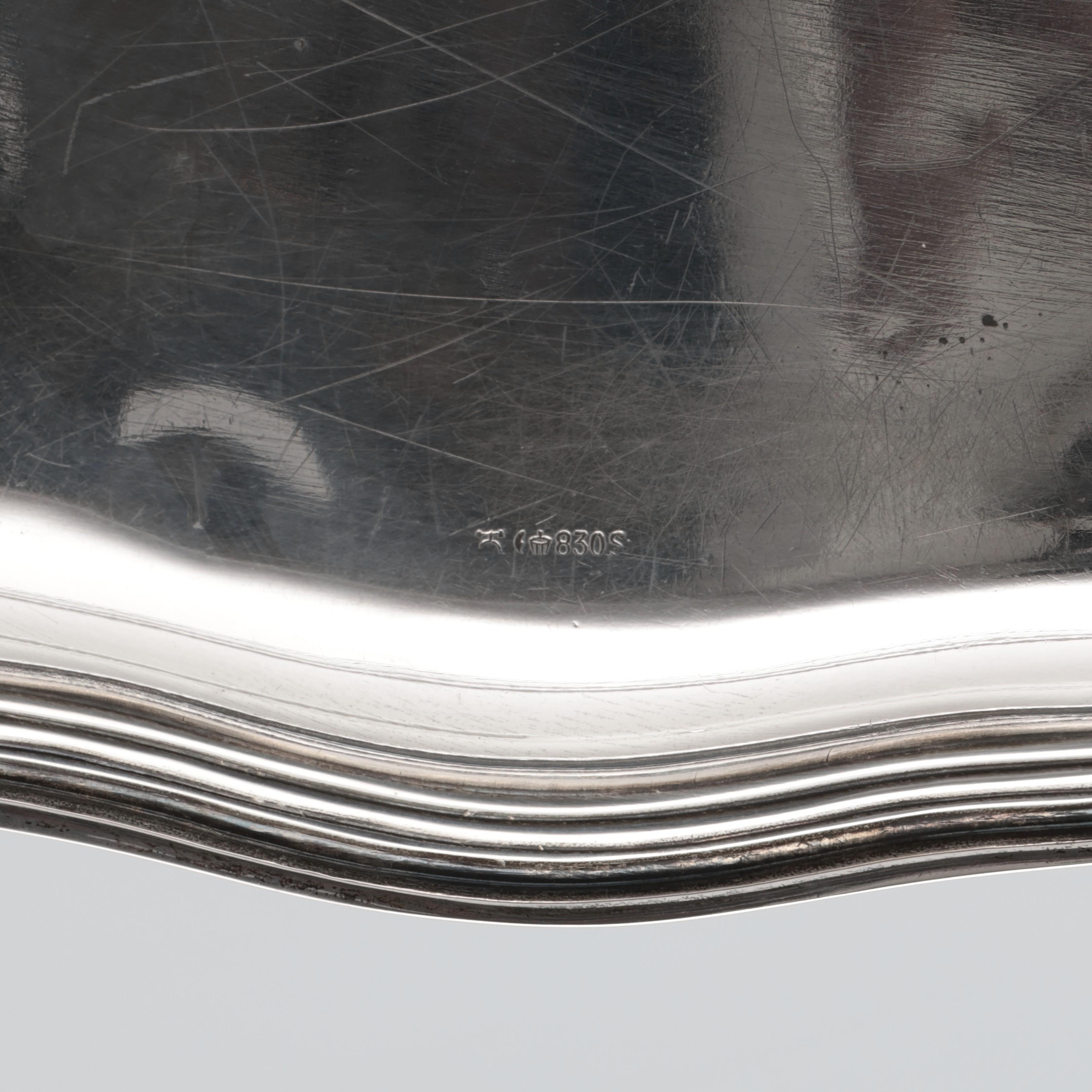 rond model met gecontourneerde verhoogde rand versierd met acanthusblad motieven, mt. H. Böhm Schwäbisch Gmünd vanaf 1887, gemerkt 800, het ovale blad met filetranden versierd en mt. W.H. Wilkens & Söhne Bremen-Hemeling vanaf 1810, 830s, 2e gehalte,