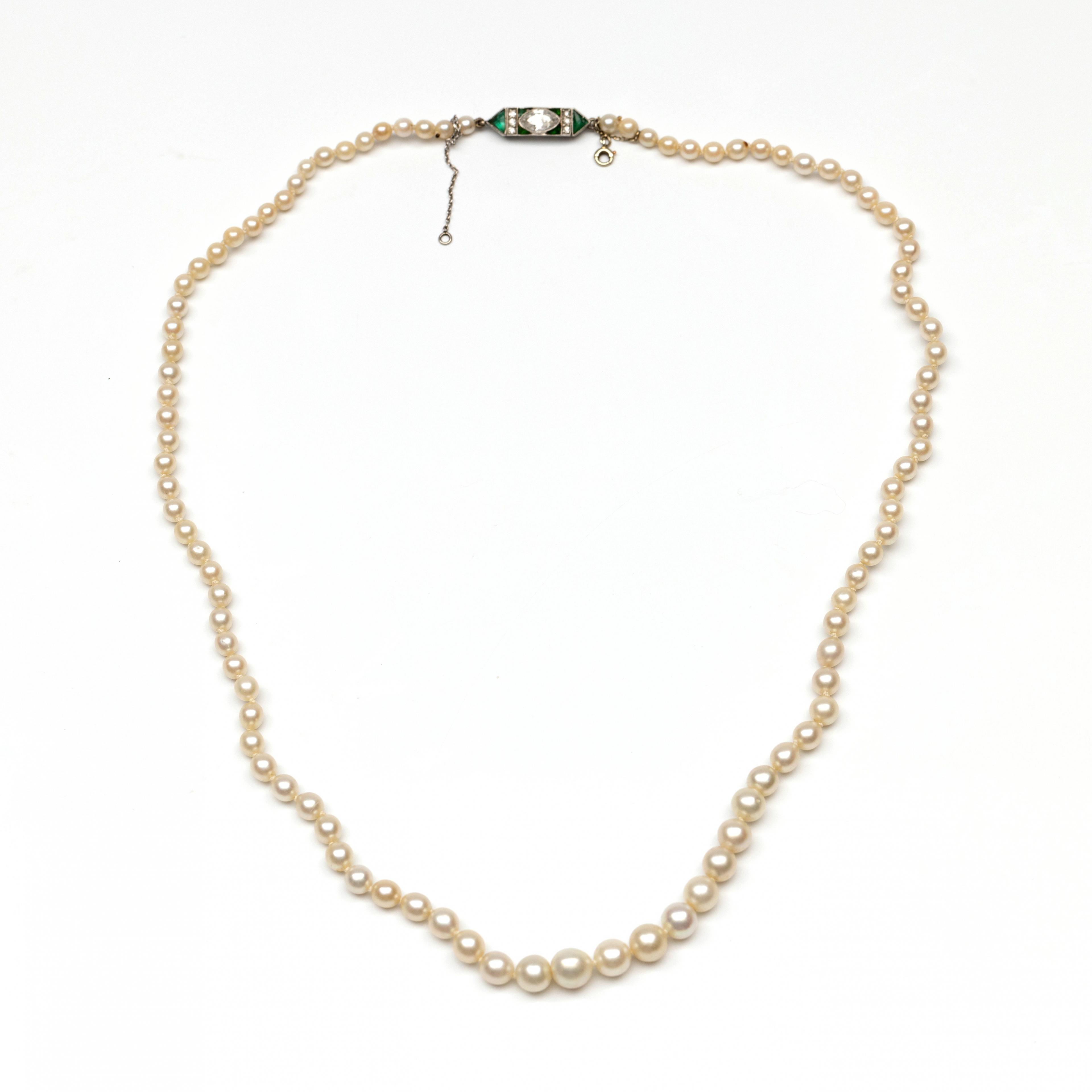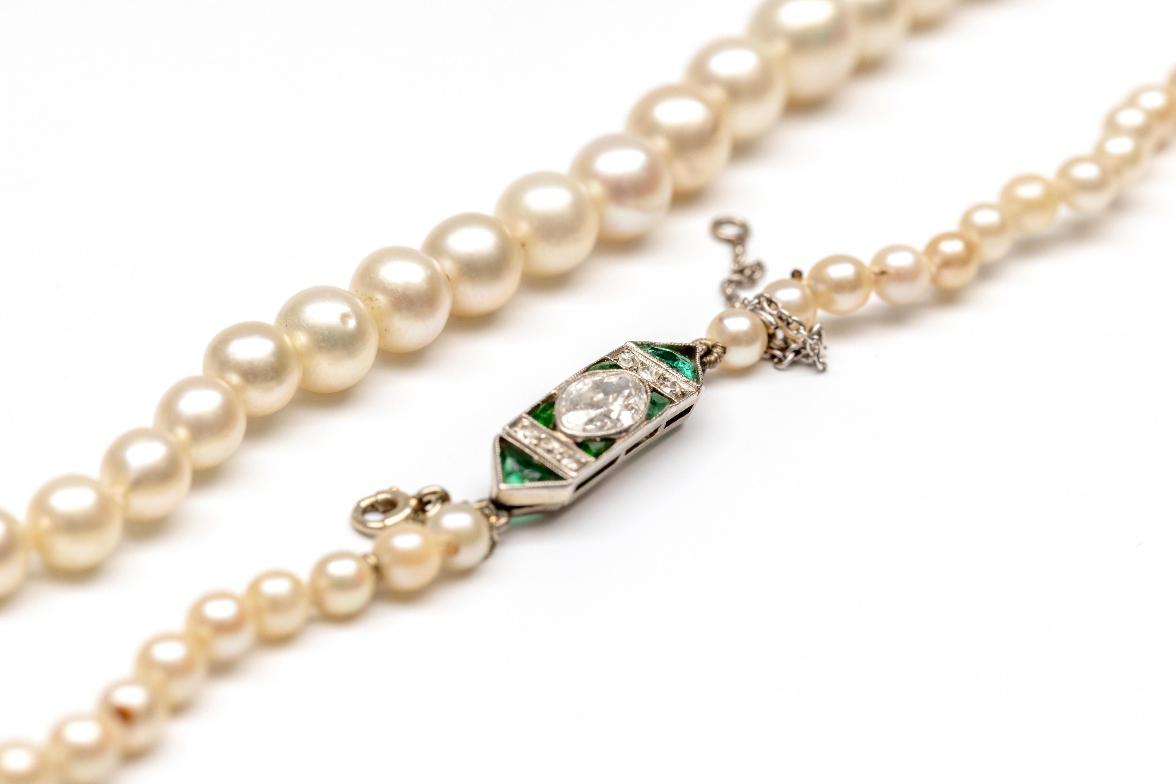 Pearl necklace and chute. Made of cultured pearls, two pearls of natural origin, with a diameter of 7.5-3.5 mm, decreasing in size from the center. On a platinum box clasp, Art Deco. Set with a marquise-cut diamond of approximately 0.45 ct, six small single-cut diamonds, and a calibrated emerald. With a certificate from the Netherlands Gemstone Laboratory, dated May 2025, number P255925.