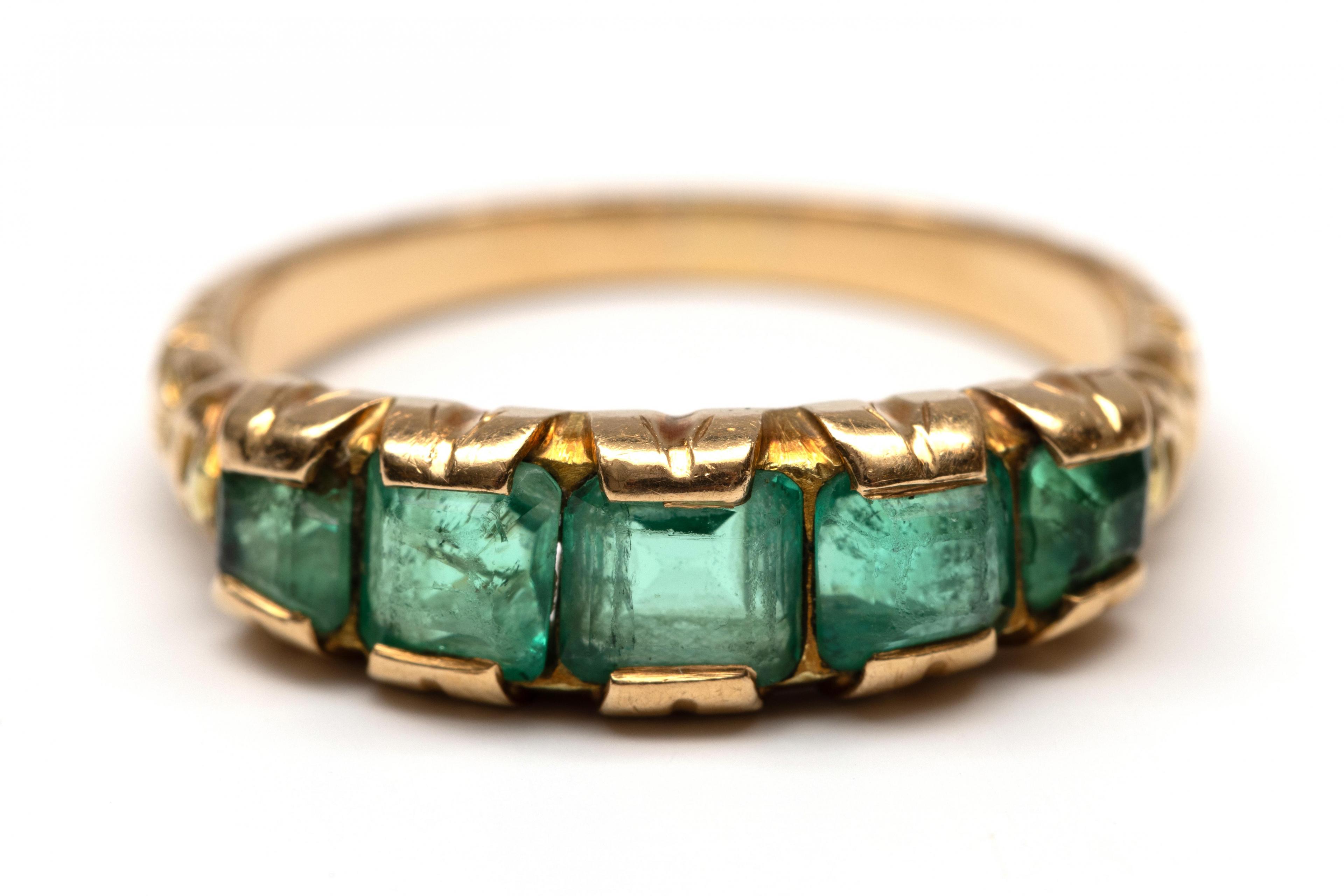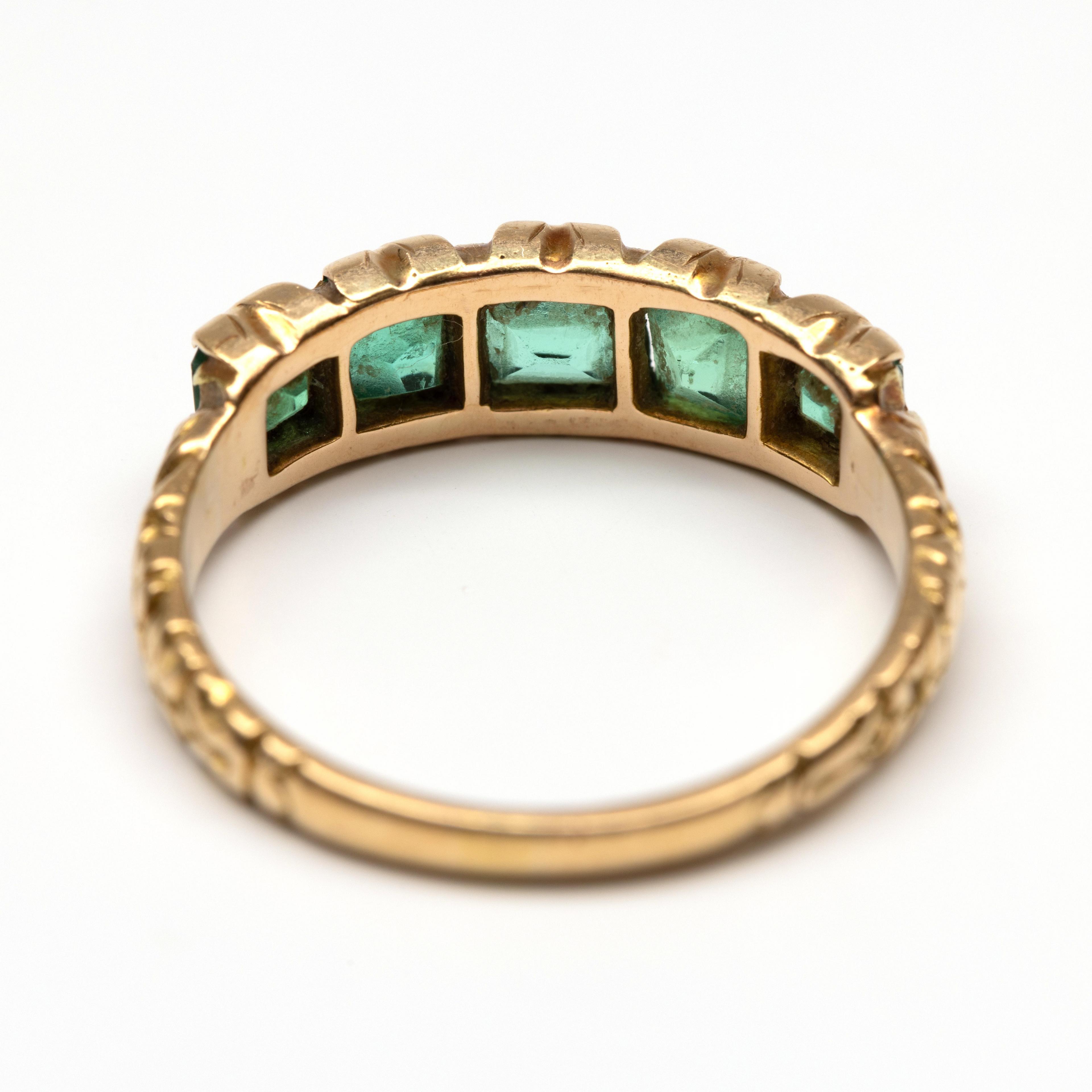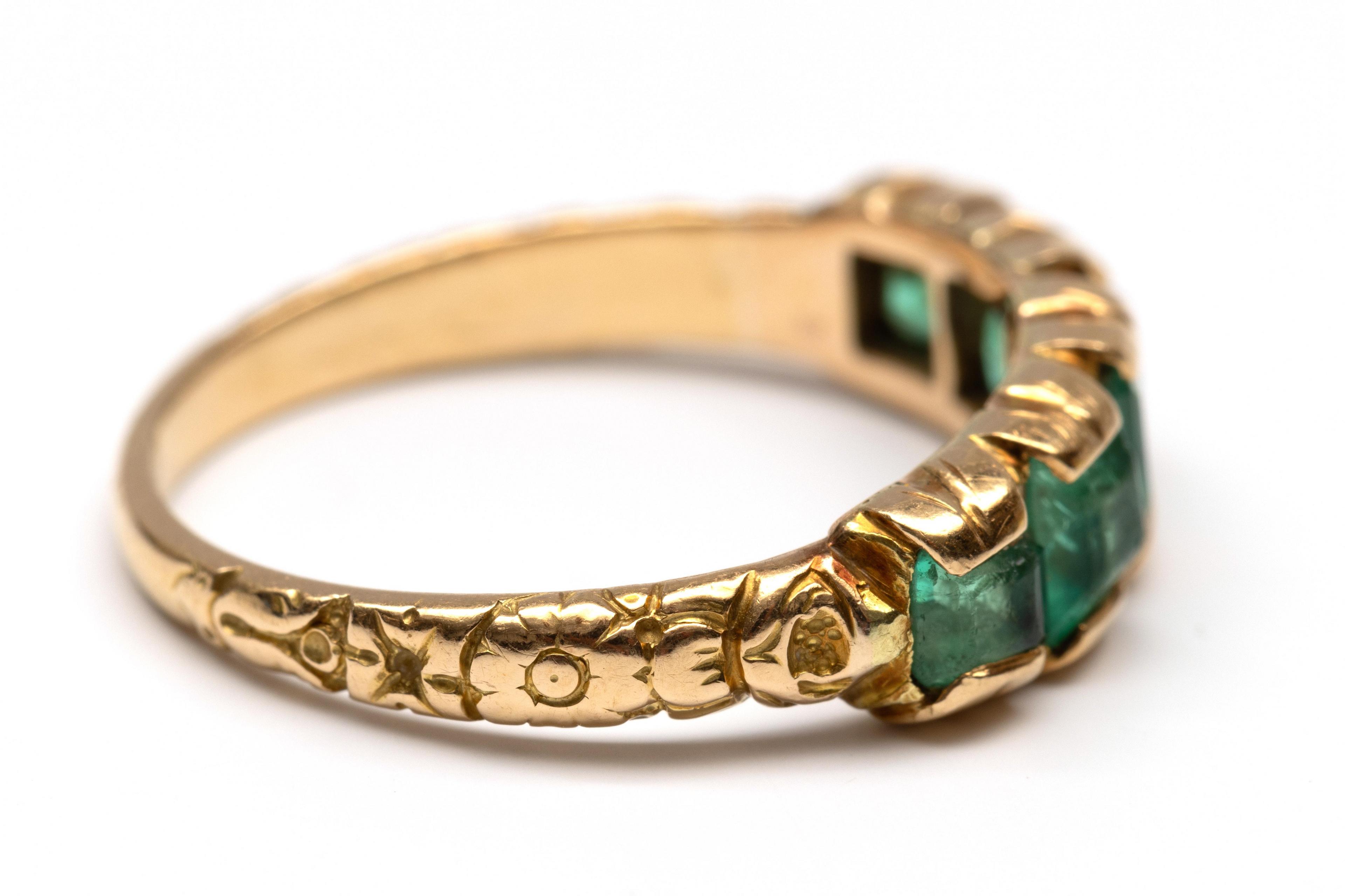 Gold ring set with five square-cut emeralds, decreasing in size from the center. The shoulders decorated with floral motifs.