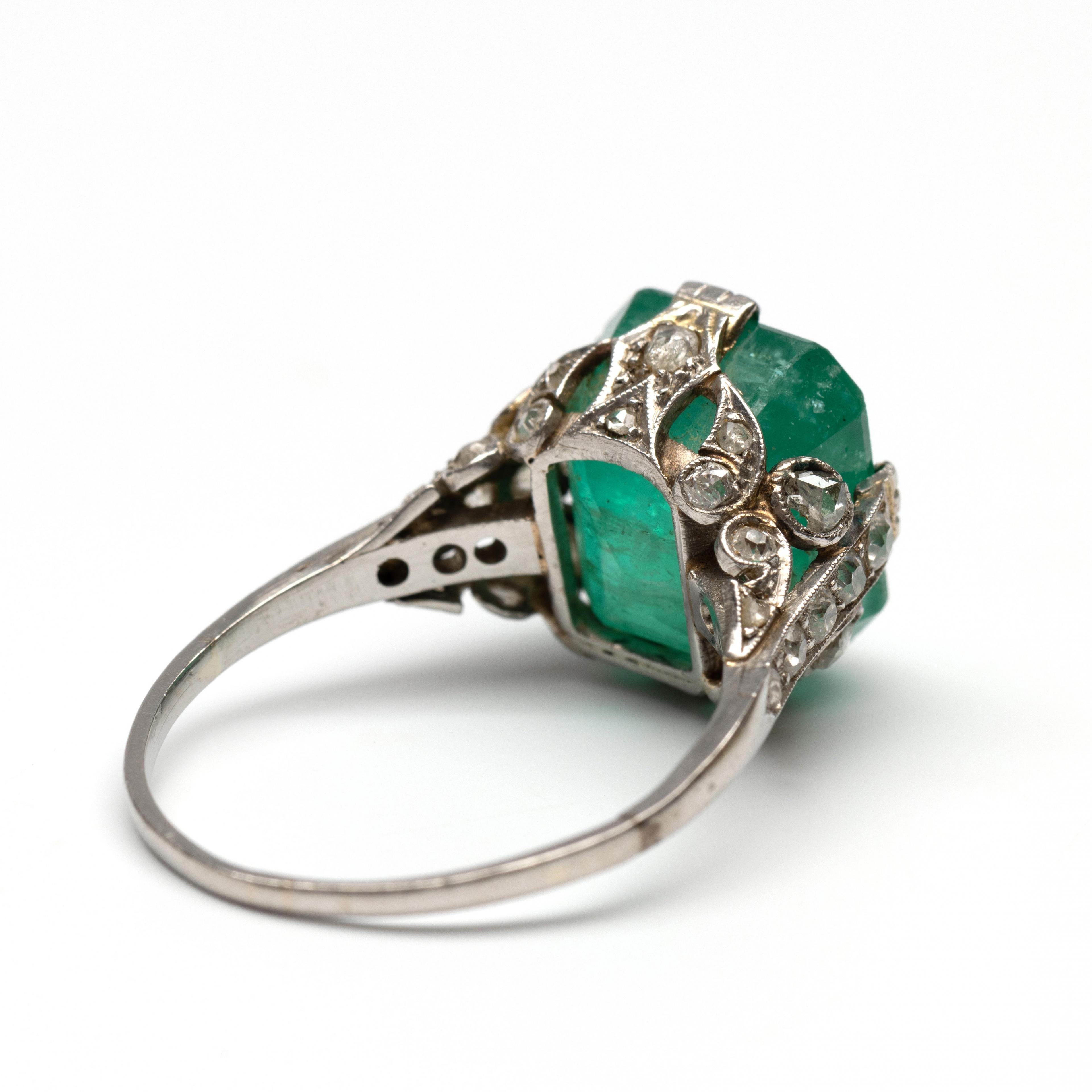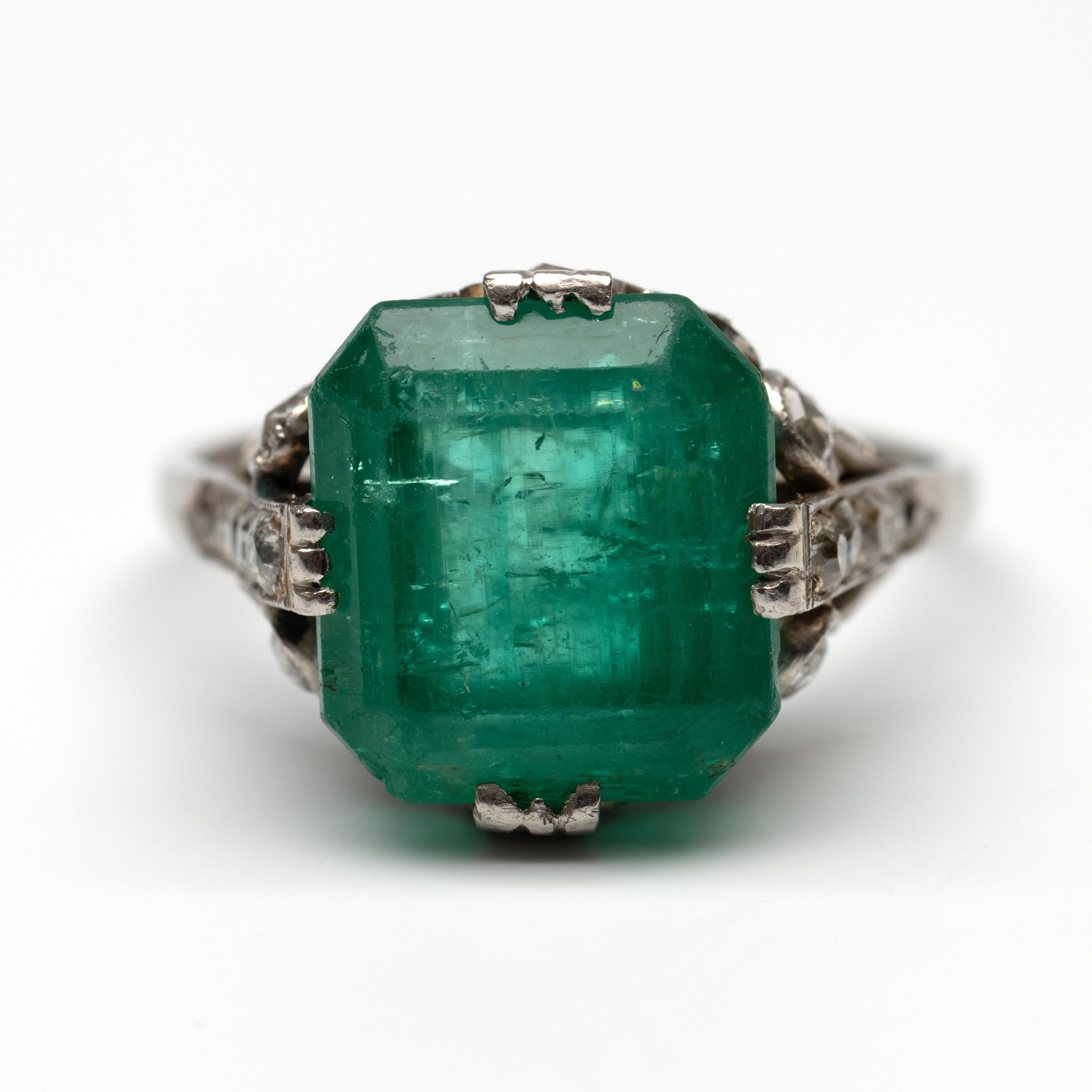 Art Deco platinum ring. Set with a emerald-cut emerald of approximately 8.00 ct. (12.1 x 11.1 x 8.7). The shoulders and gallery are decorated with scrollwork motifs and set with small rose-cut diamonds.