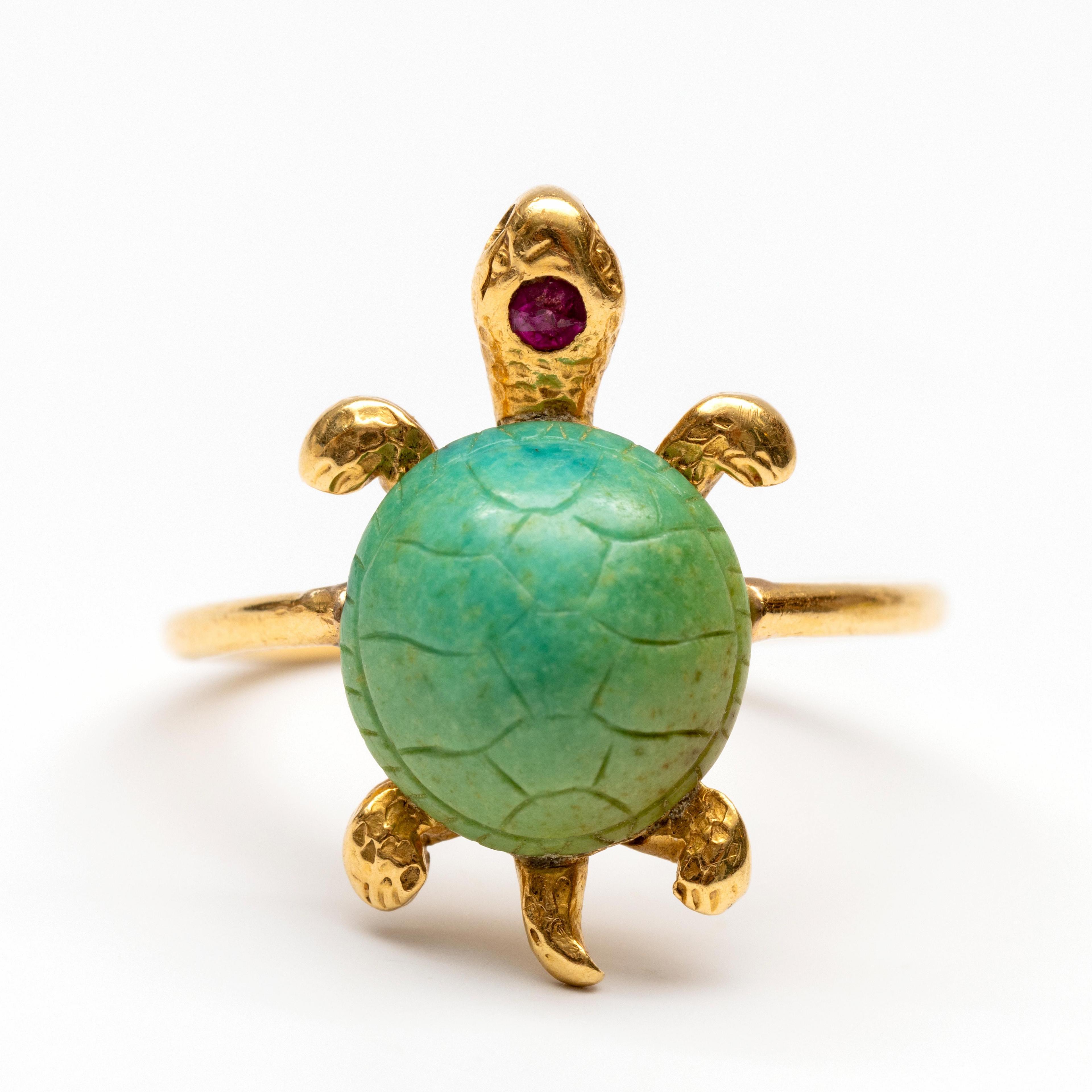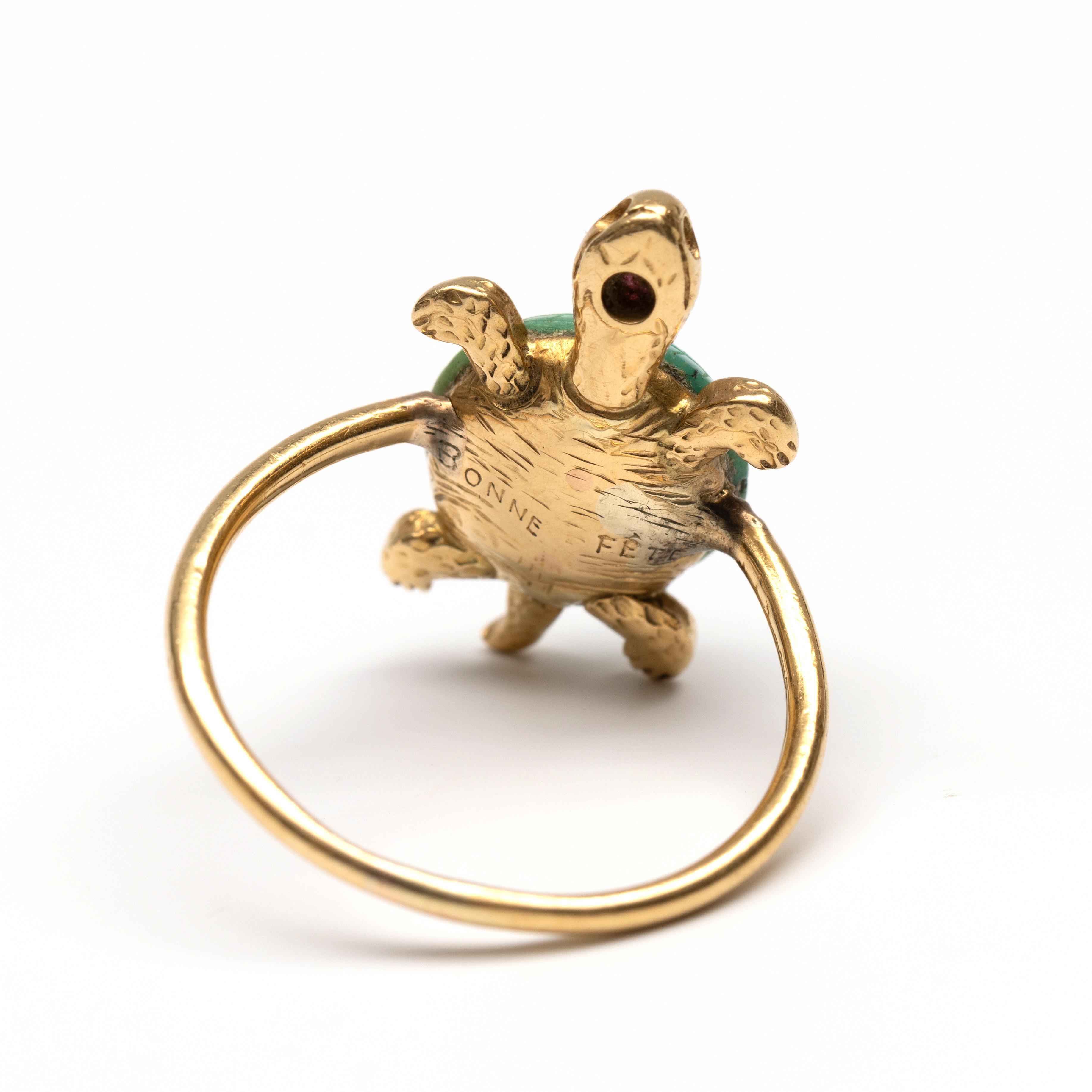 Gold ring in the shape of a turtle. The shell is set with a carved turquoise, the head with a faceted ruby. The belly is engraved with the text "Bonne fête"
