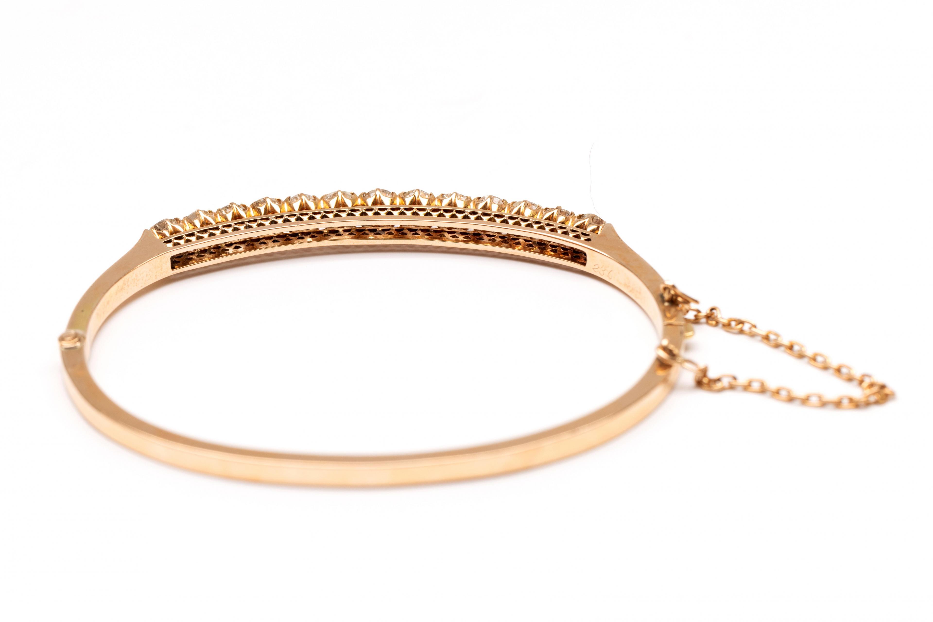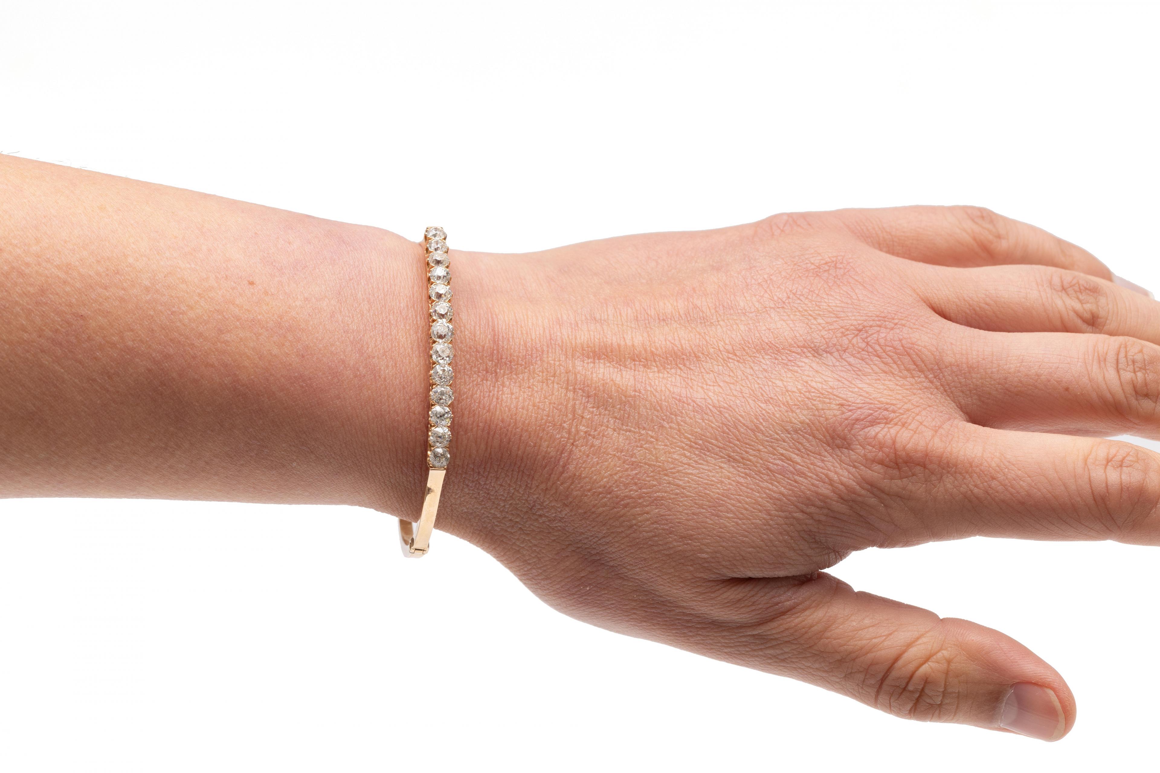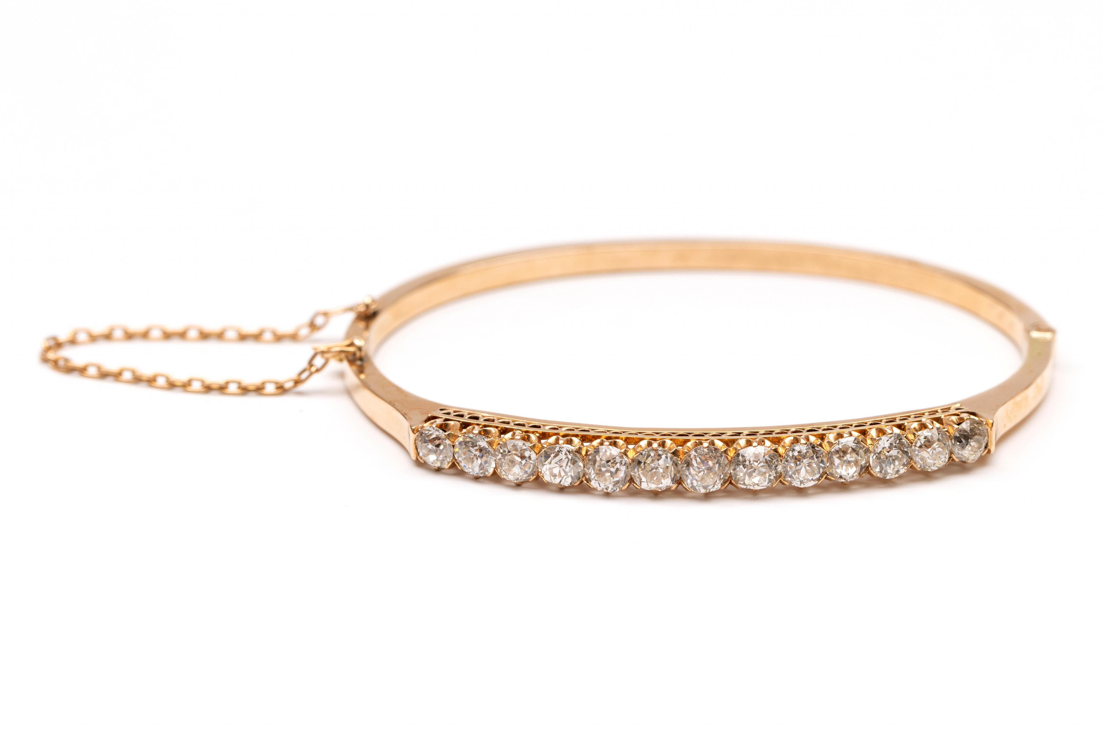 14 k. Gold rigid bracelet, 19th century. The top set with thirteen old brilliant-cut diamonds with a total weight of approximately 2.80 ct.