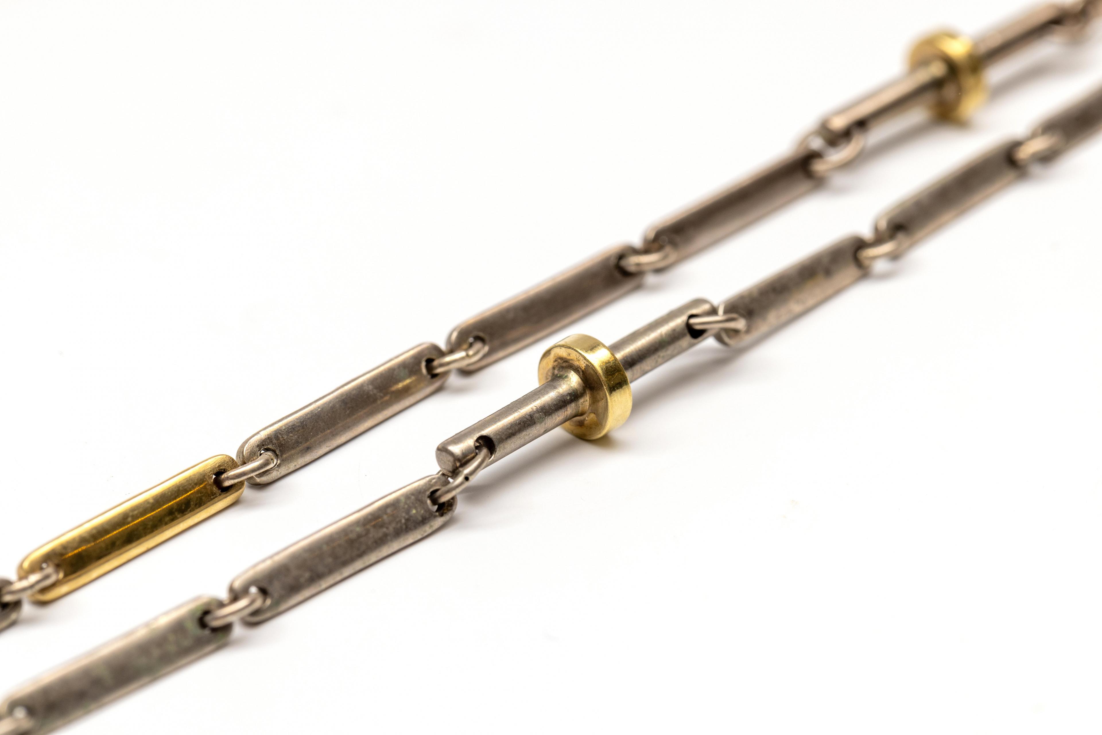 Opgebouwd uit een herhalend patroon van twee keer drie zilveren waartussen een gouden rechthoekige schakel, afgewisseld met een cilindervormige zilveren schakel waaromheen een gouden 'wiel'. Meesterteken G.J. Kok & Zoon, Rotterdam, 1968-1990