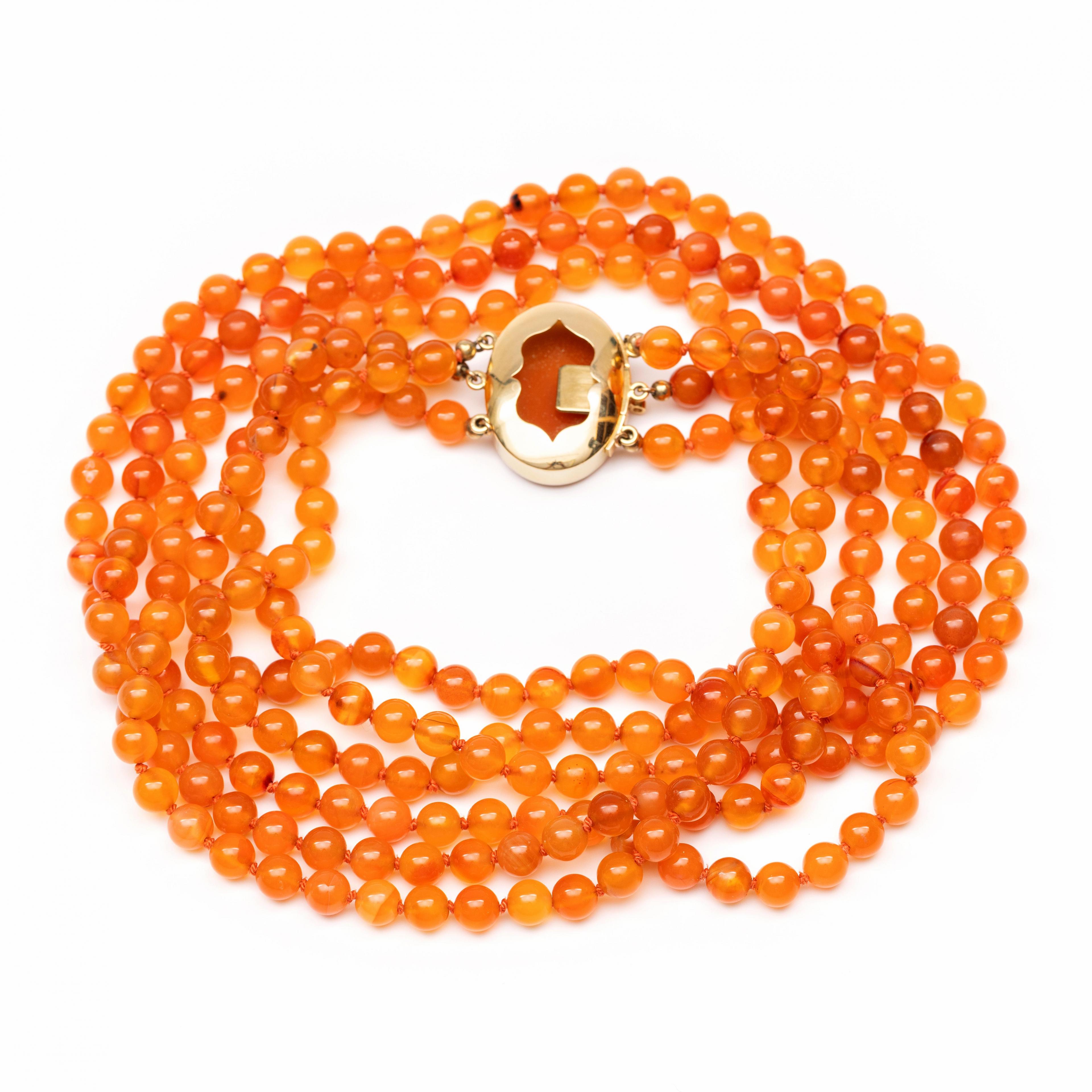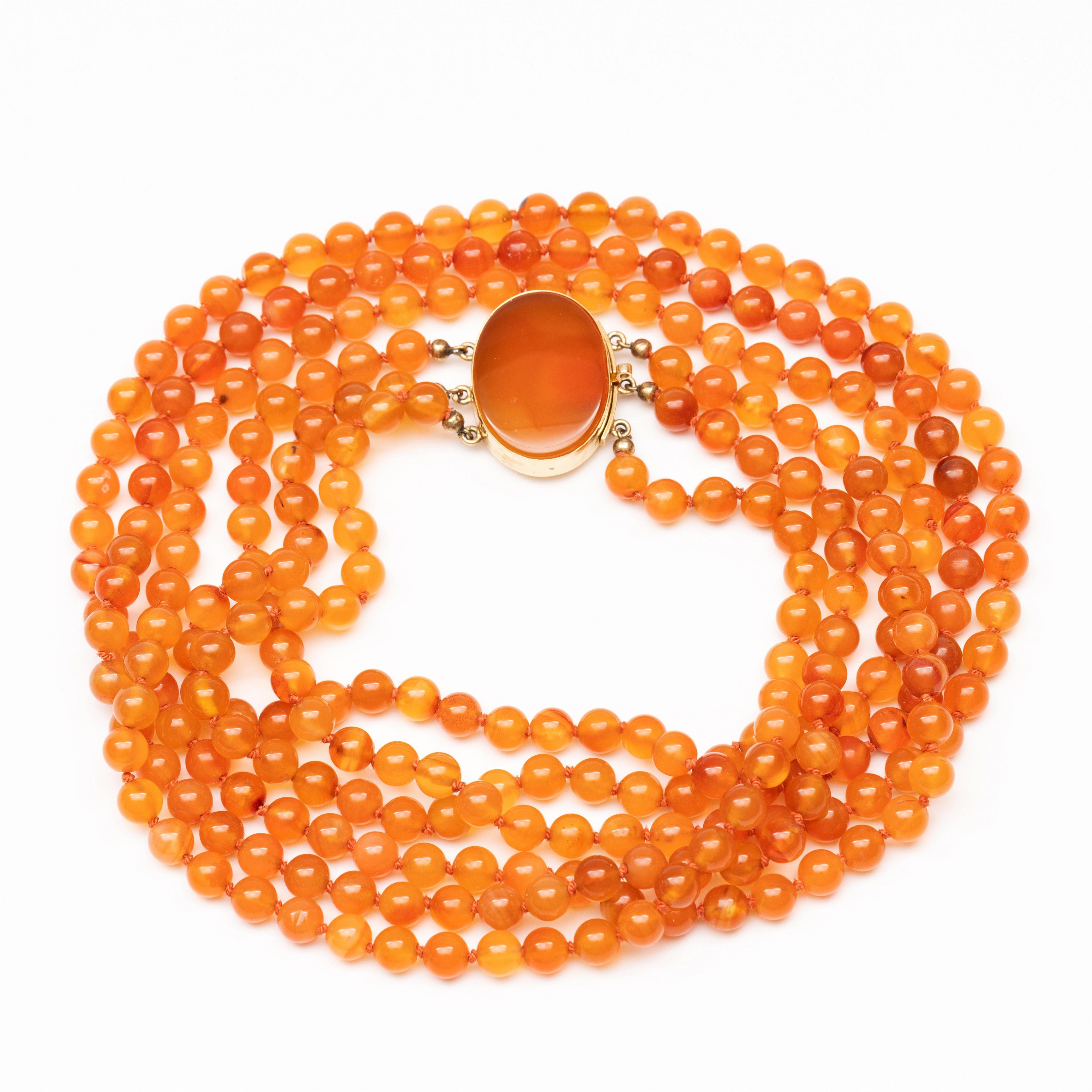 van drie slagen ronde kralen (diam. 7 -7,5 mm) aan een 14 kt. gouden baksluiting bezet met een ovale cabochon geslepen kornalijn. Hierbij drie losse kralen