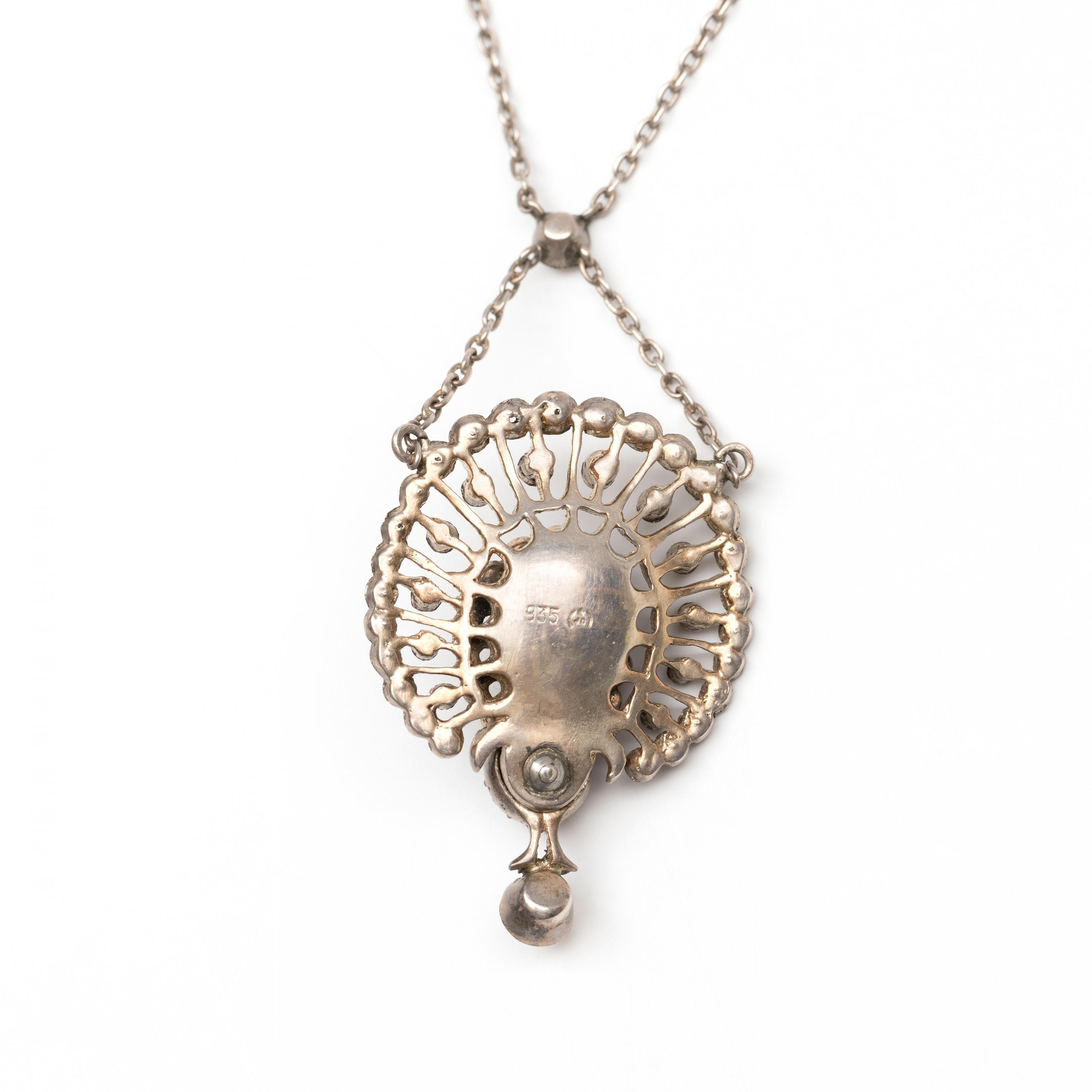 Silver necklace with a peacock pendant at the bottom, set with paste and blue enamel. The eyes are made of imitation ruby.