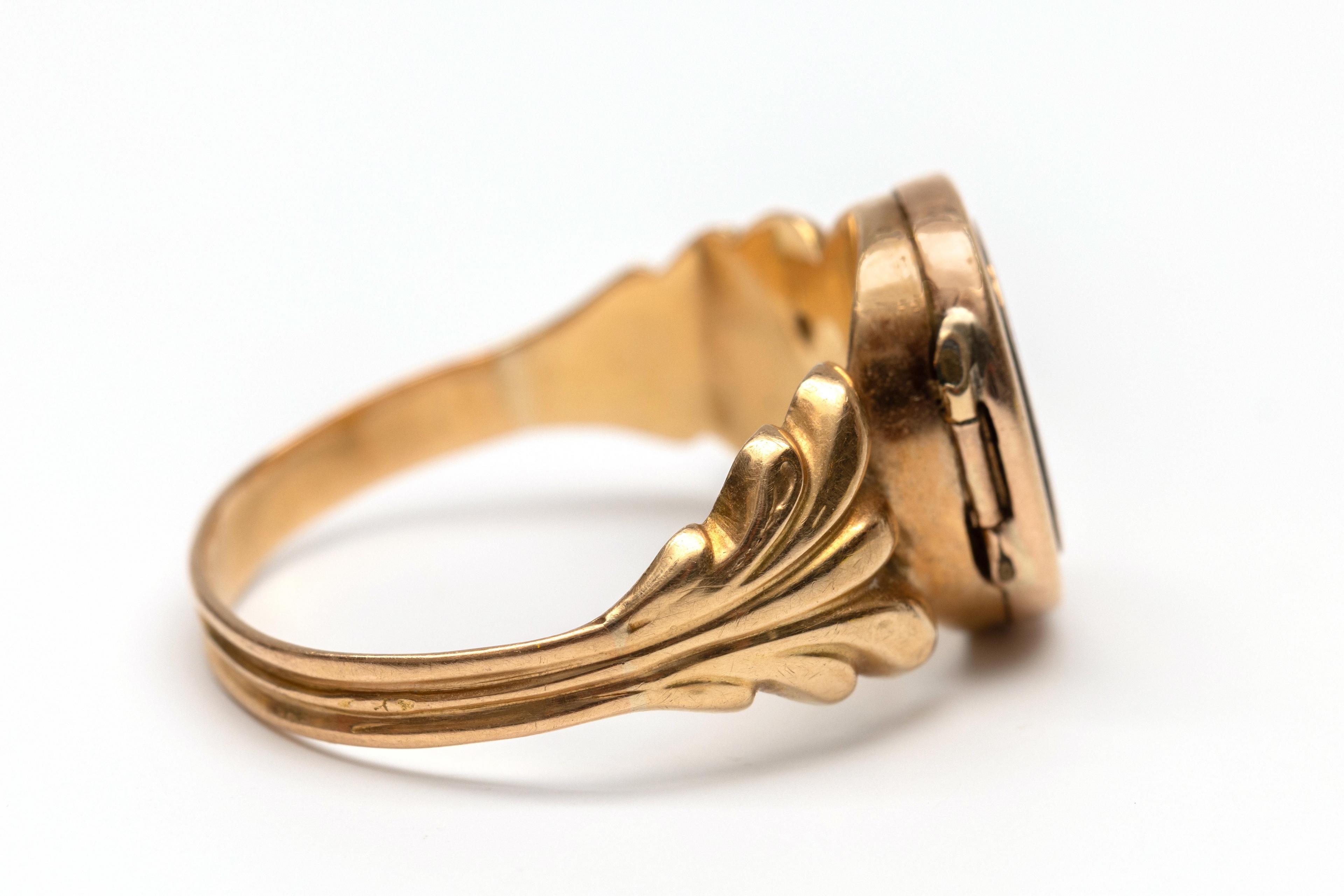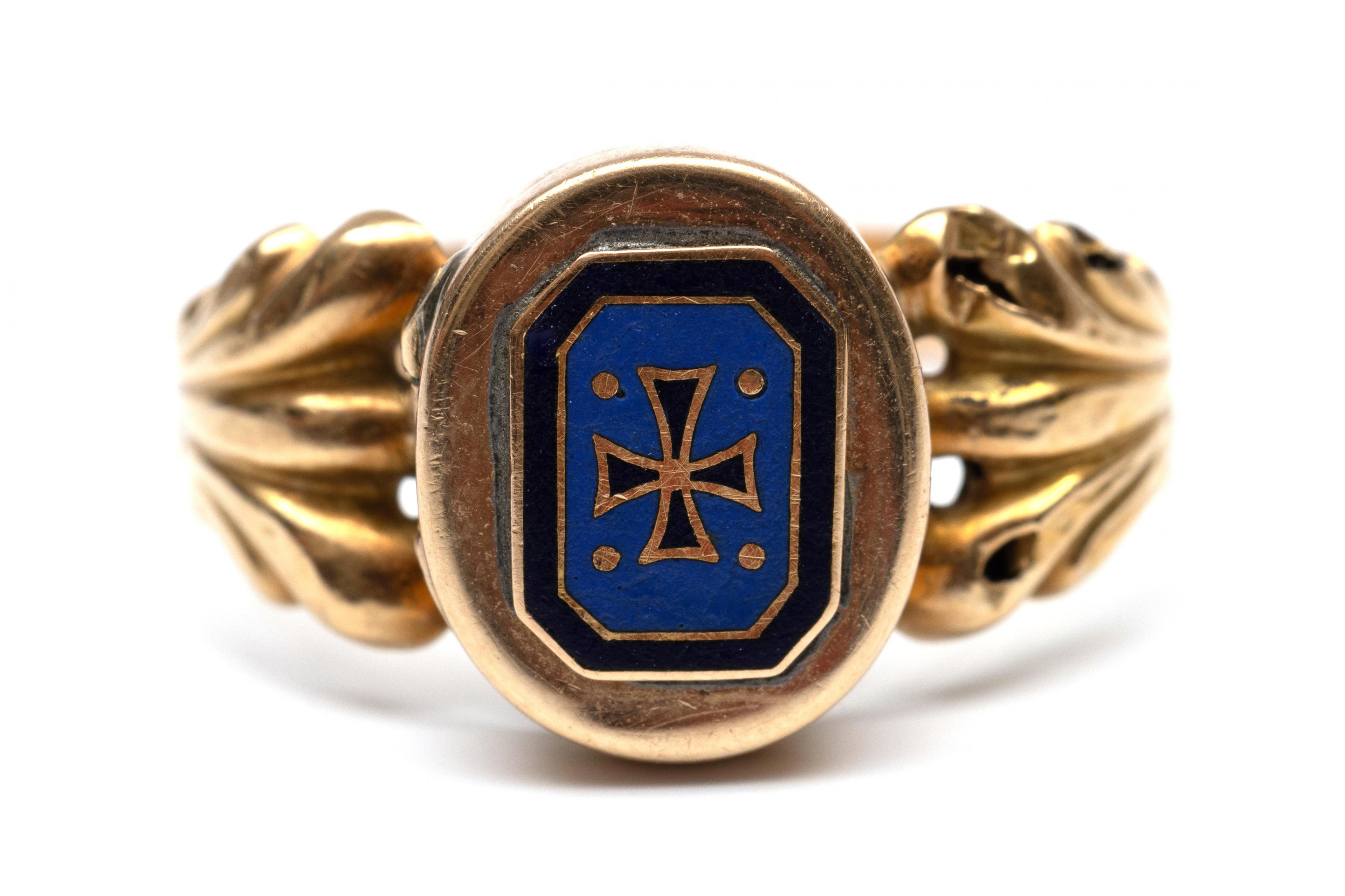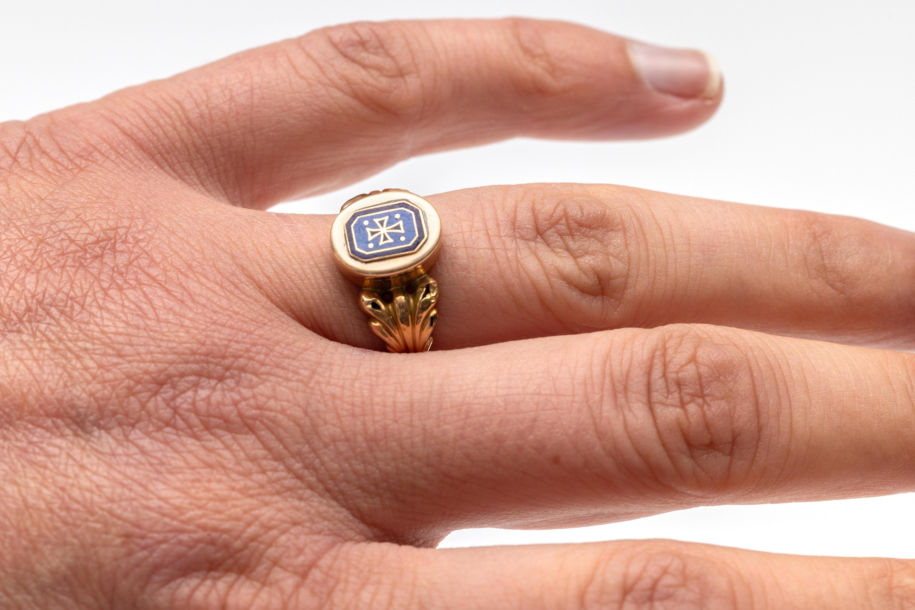 Gold poison ring, 19th century. With a locket at the top (impossible to open) bearing a blue and black enameled cartouche with a Maltese cross. The shoulder decorated with a palmette motif.