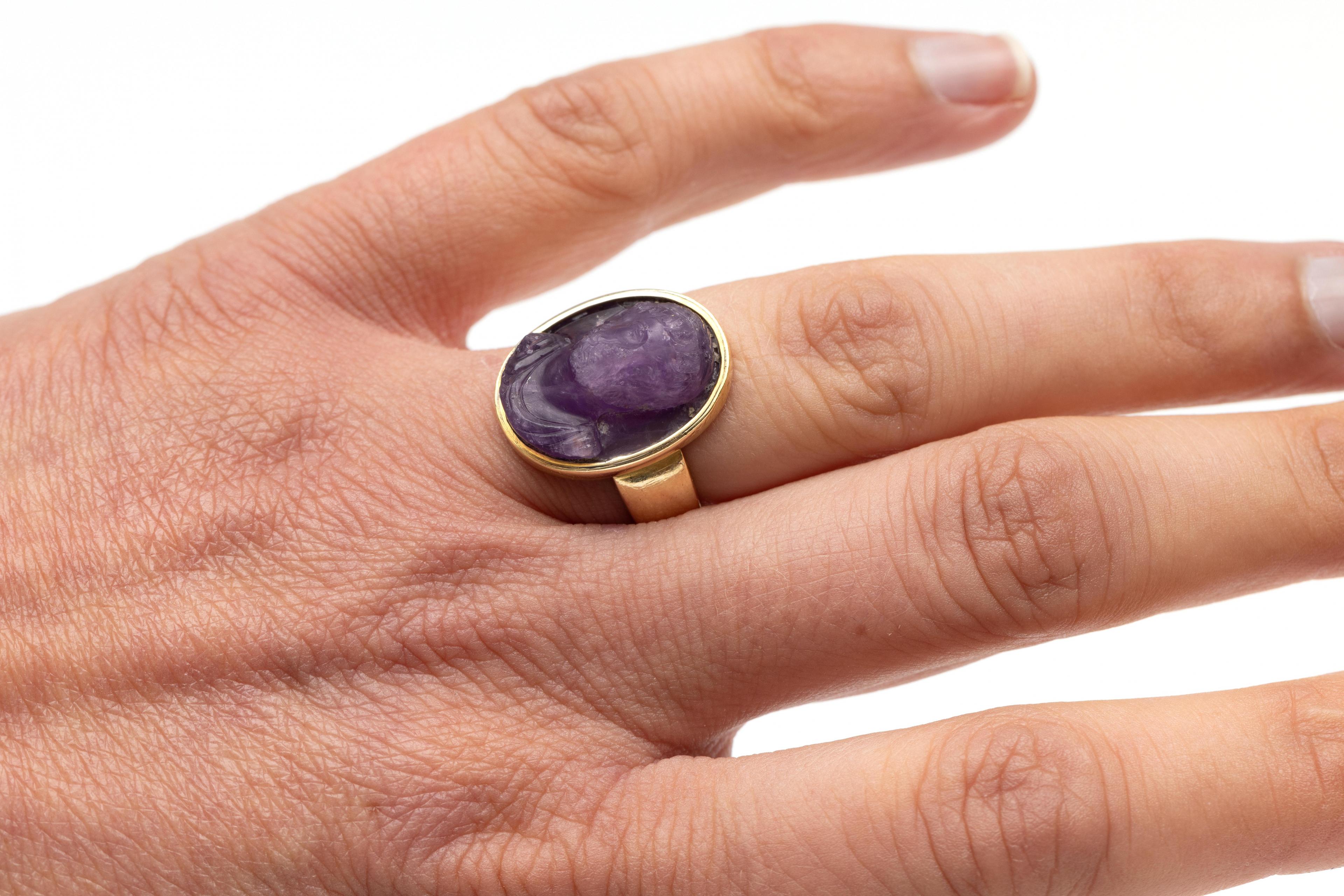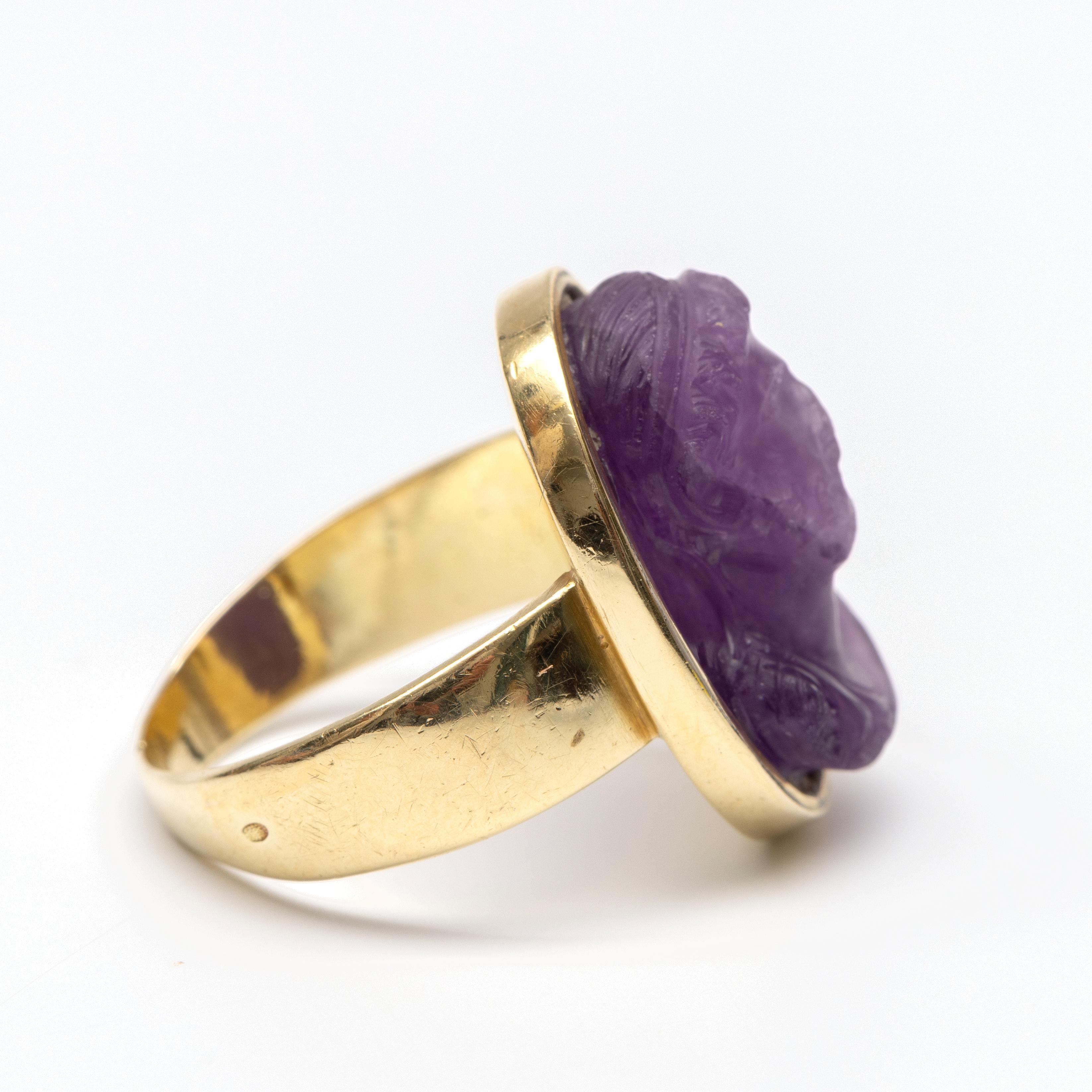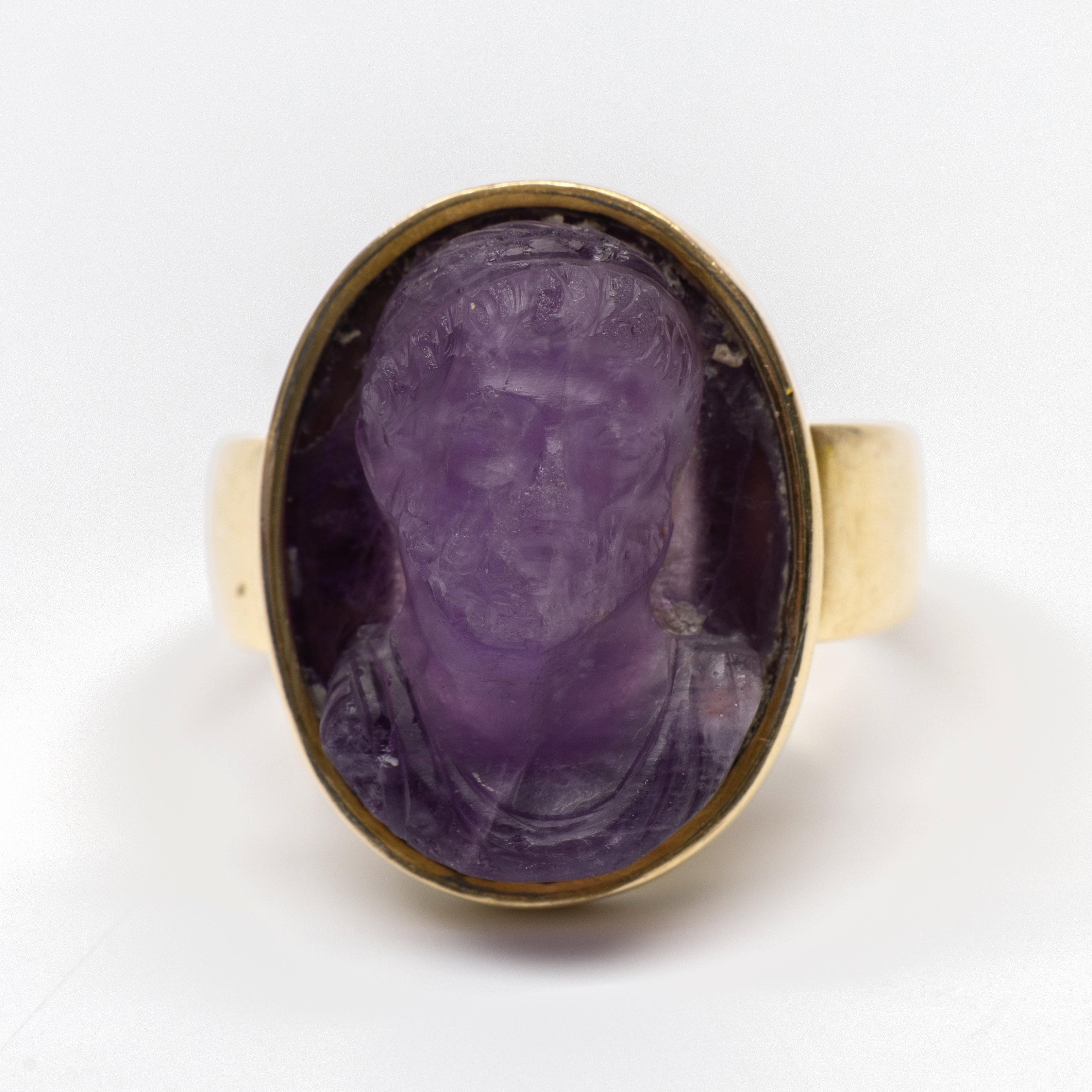 14 k. gold ring, set with an amethyst cameo depicting a classical man with a beard