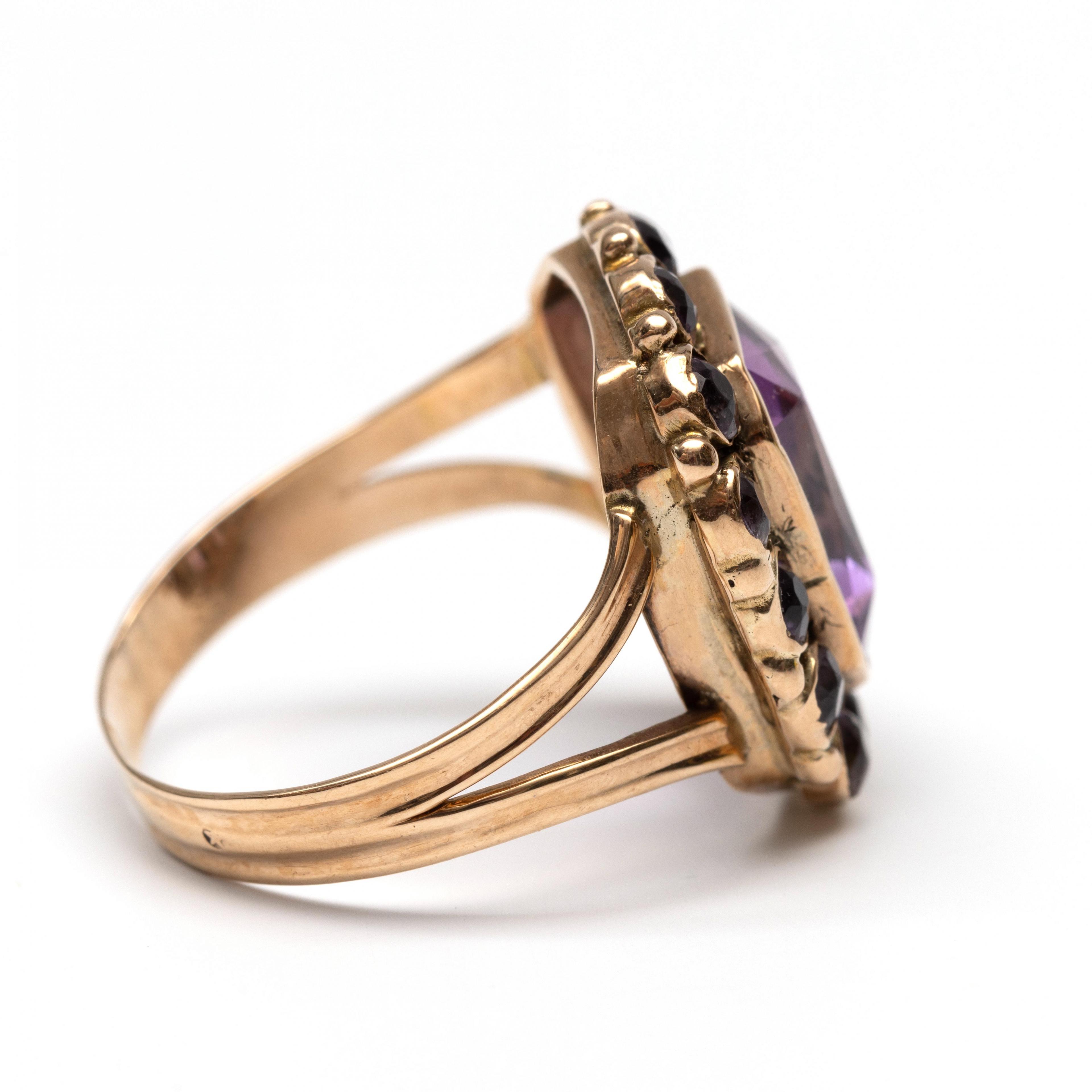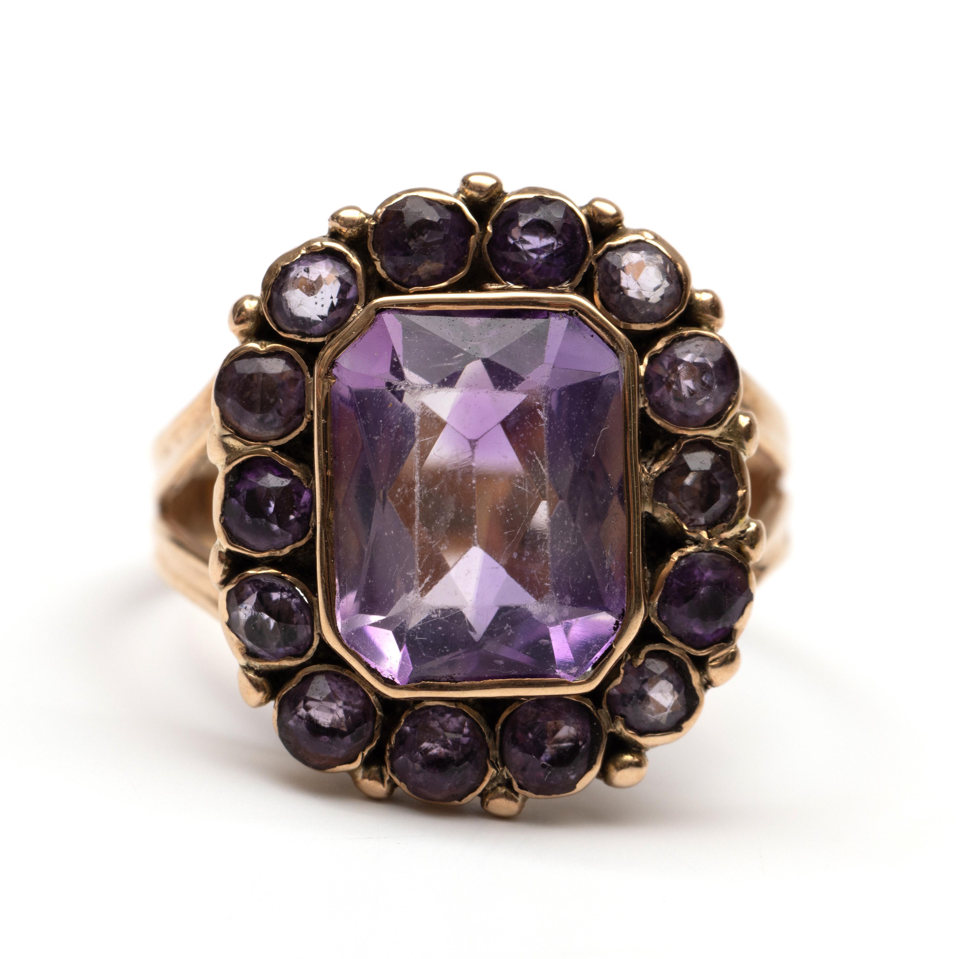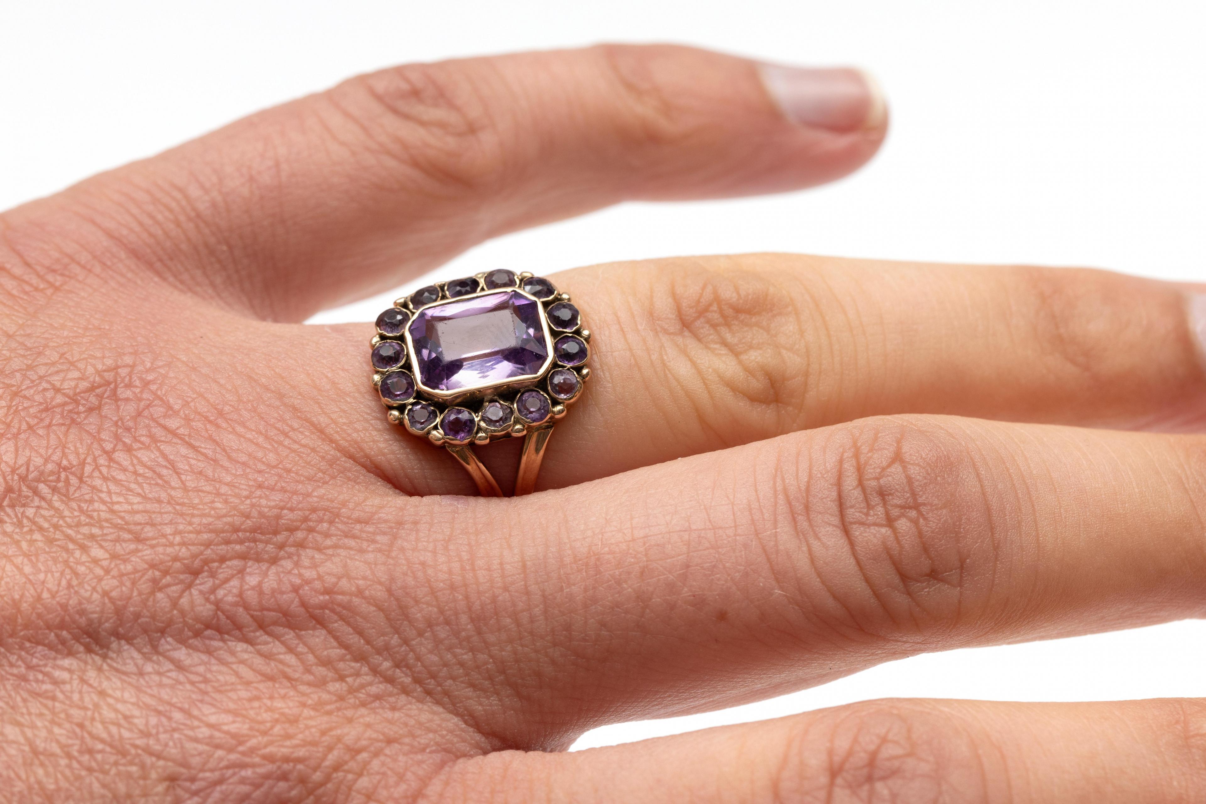Below Dutch legal gold alloy ring. Set with an octagonal faceted amethyst surrounded by small round faceted amethysts.
