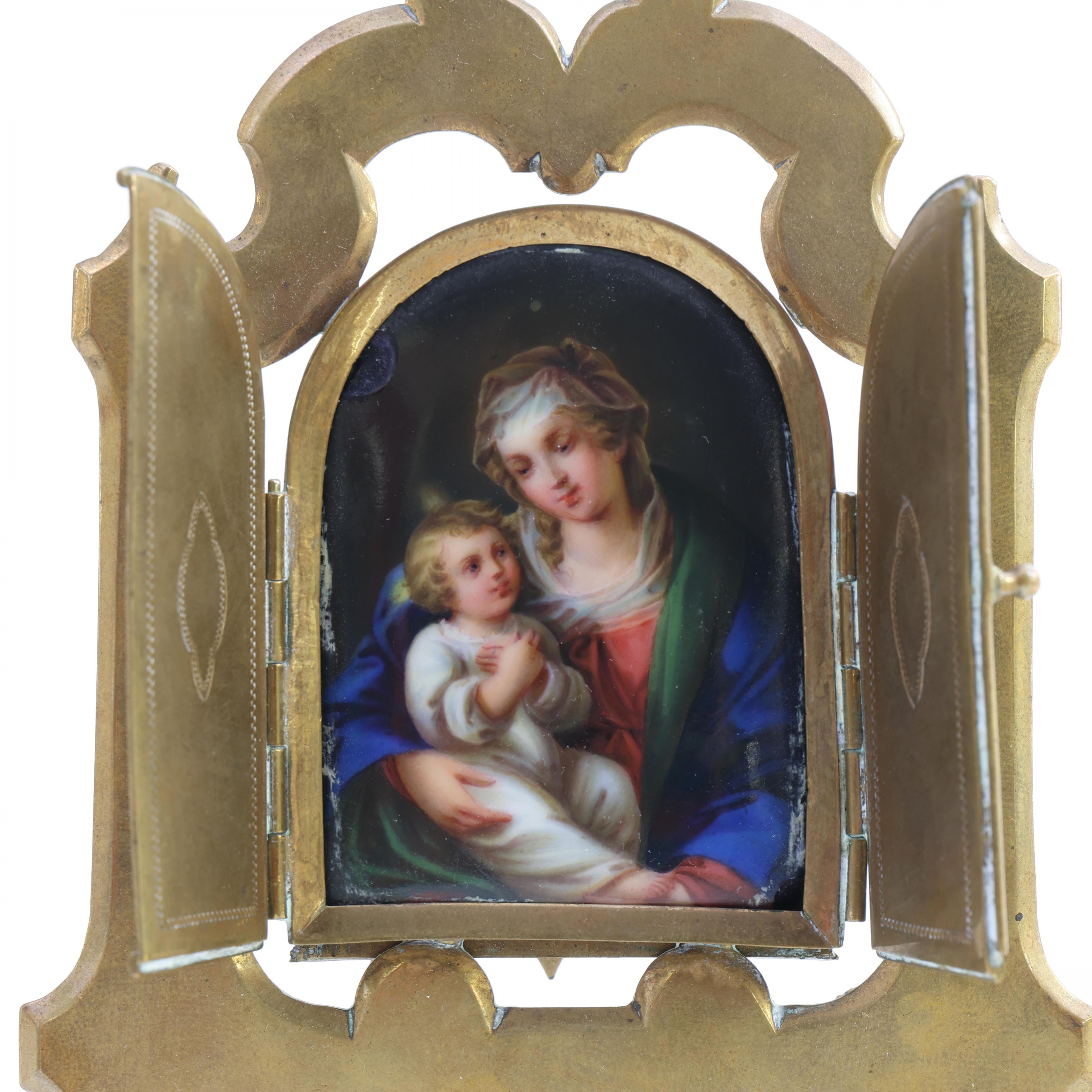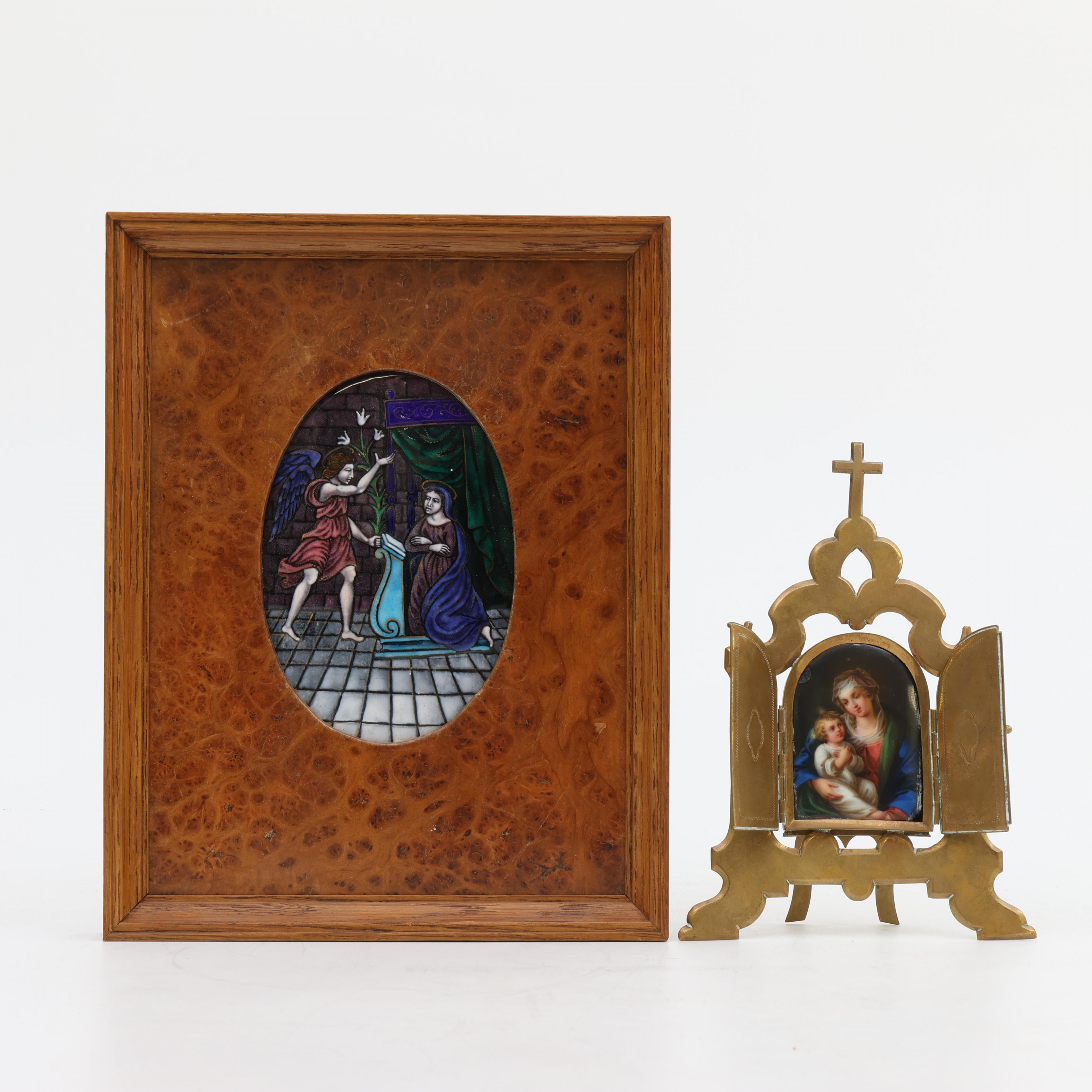 Voorstellende de Aartsengel Gabriël en de Maagd Maria. In houten lijst. Hierbij Weense geëmailleerde plaquette van Maria met kind in koperen standaard.