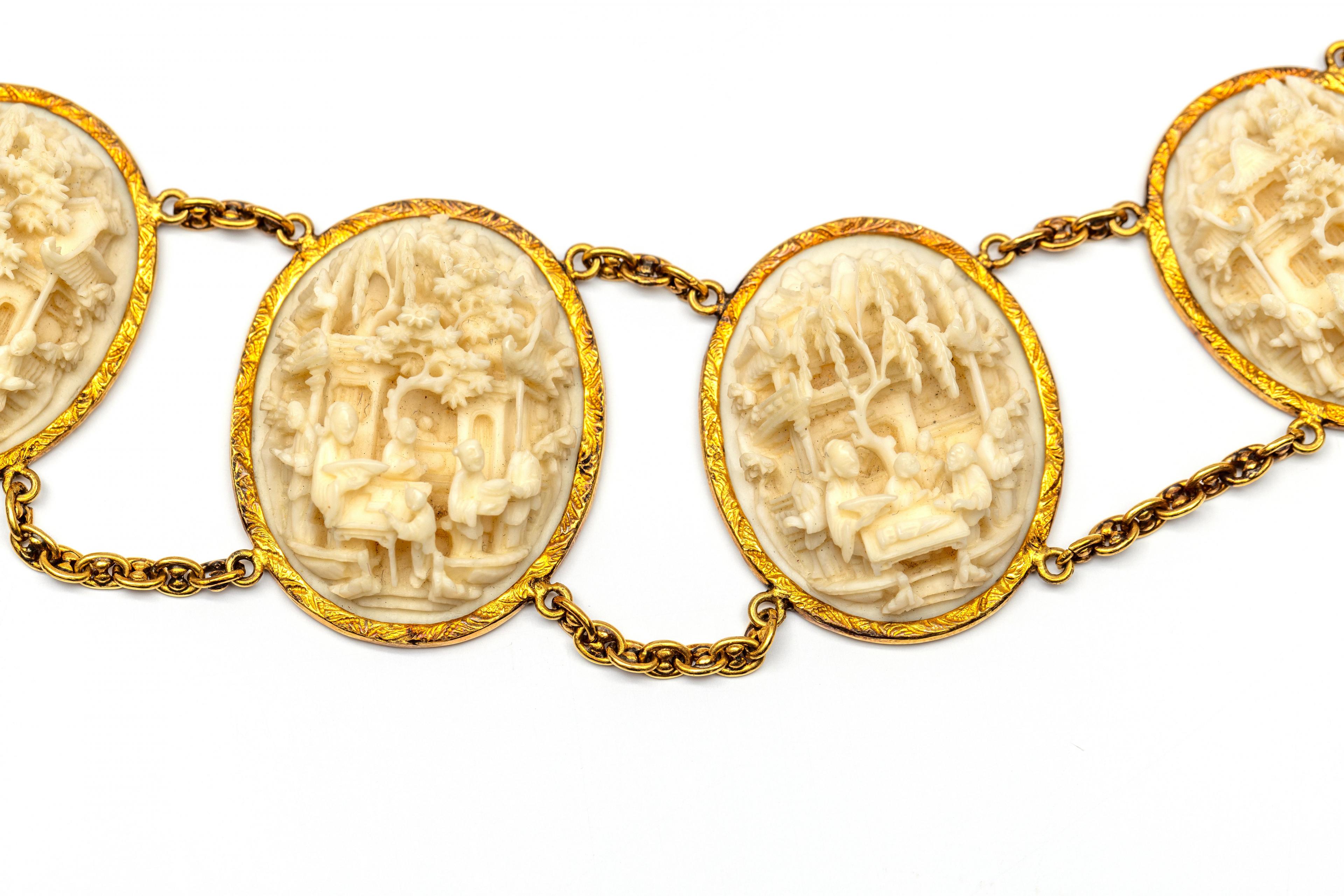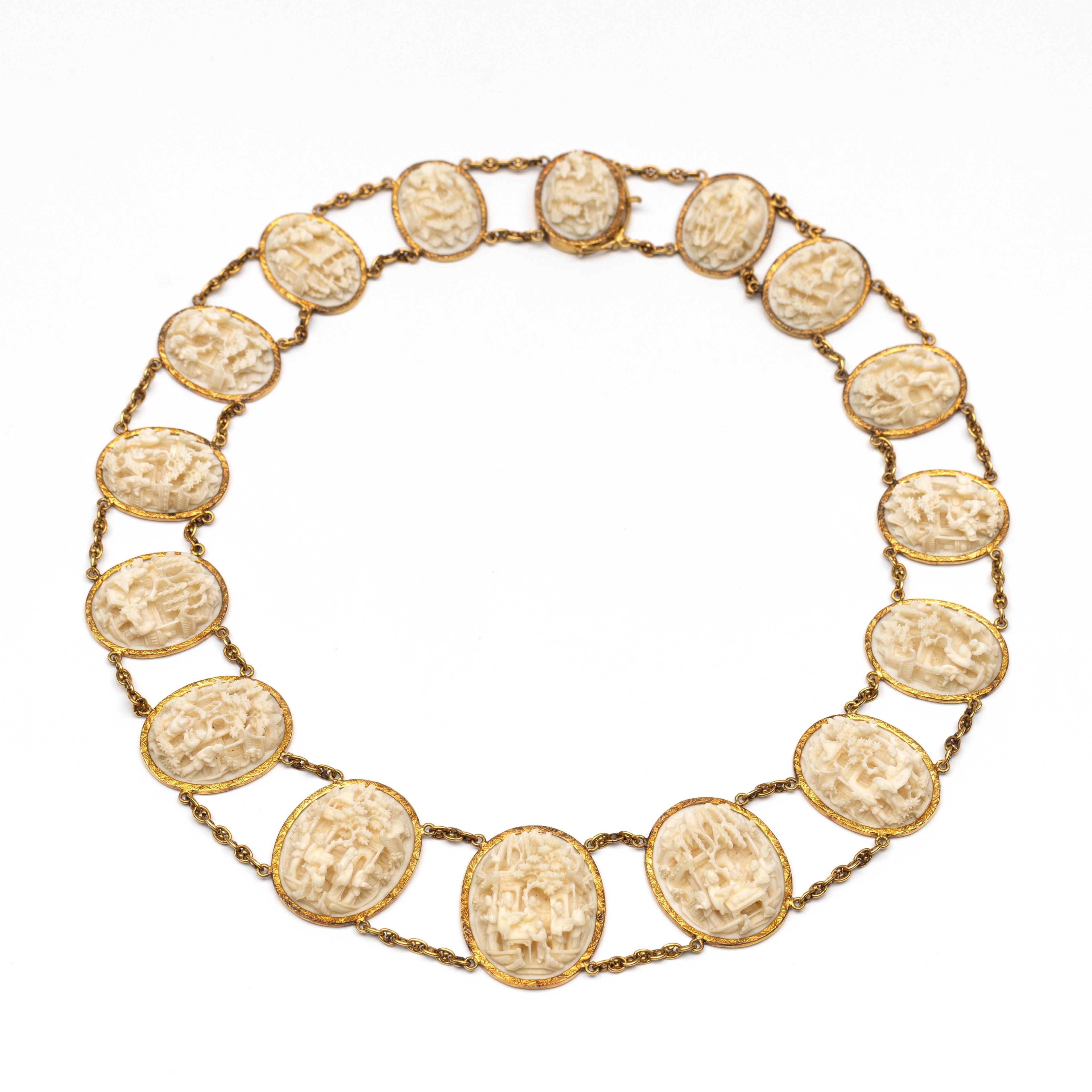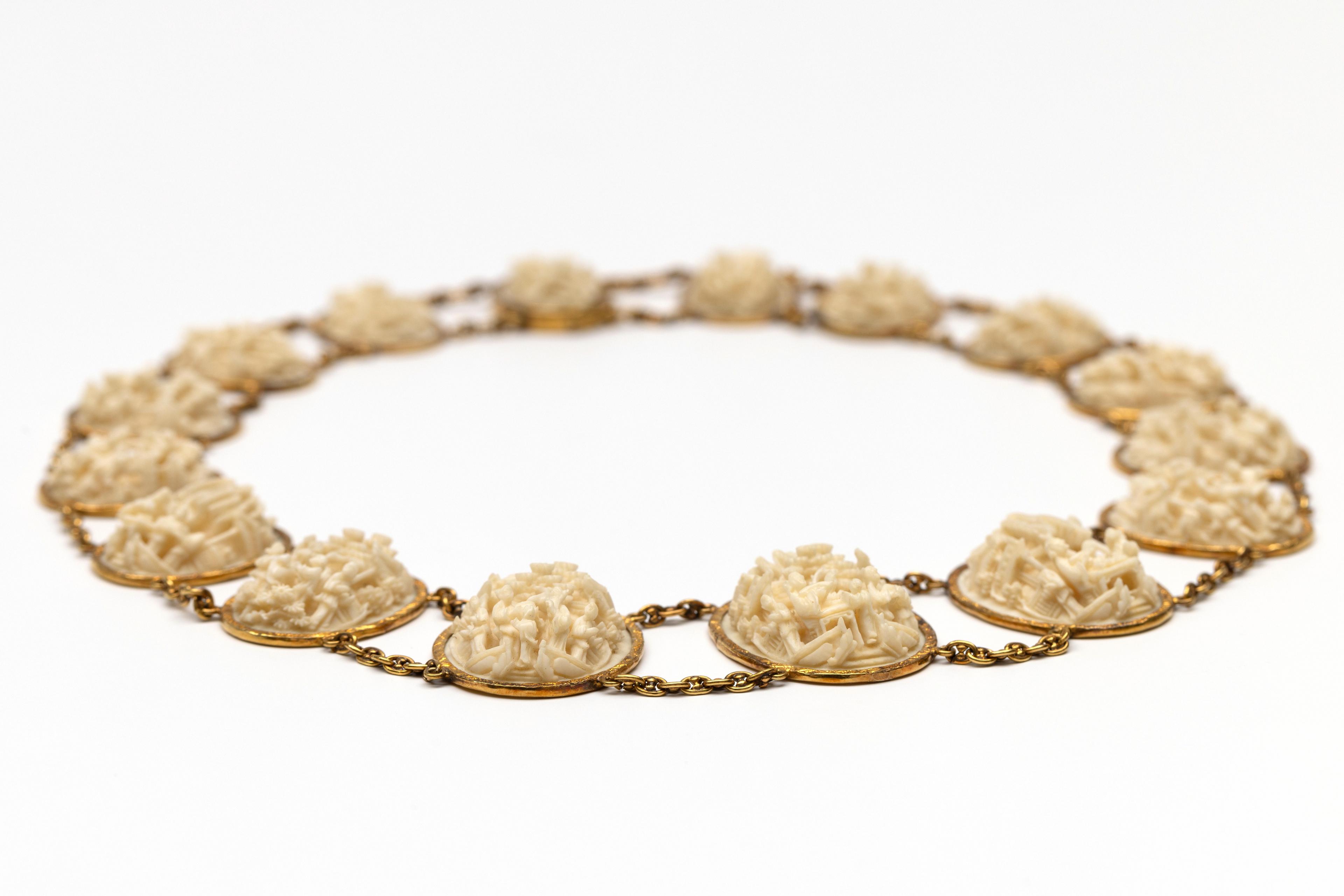 18 k. Gold necklace ‘en esclavage’, ca. 1830. Composed of oval plaques of carved Canton ivory, with a presentation of the figures in landscapes with houses, descending in size from the centre. With CITES Certificate 25NL339036/20. NOTE: This lot can not be exported outside EU