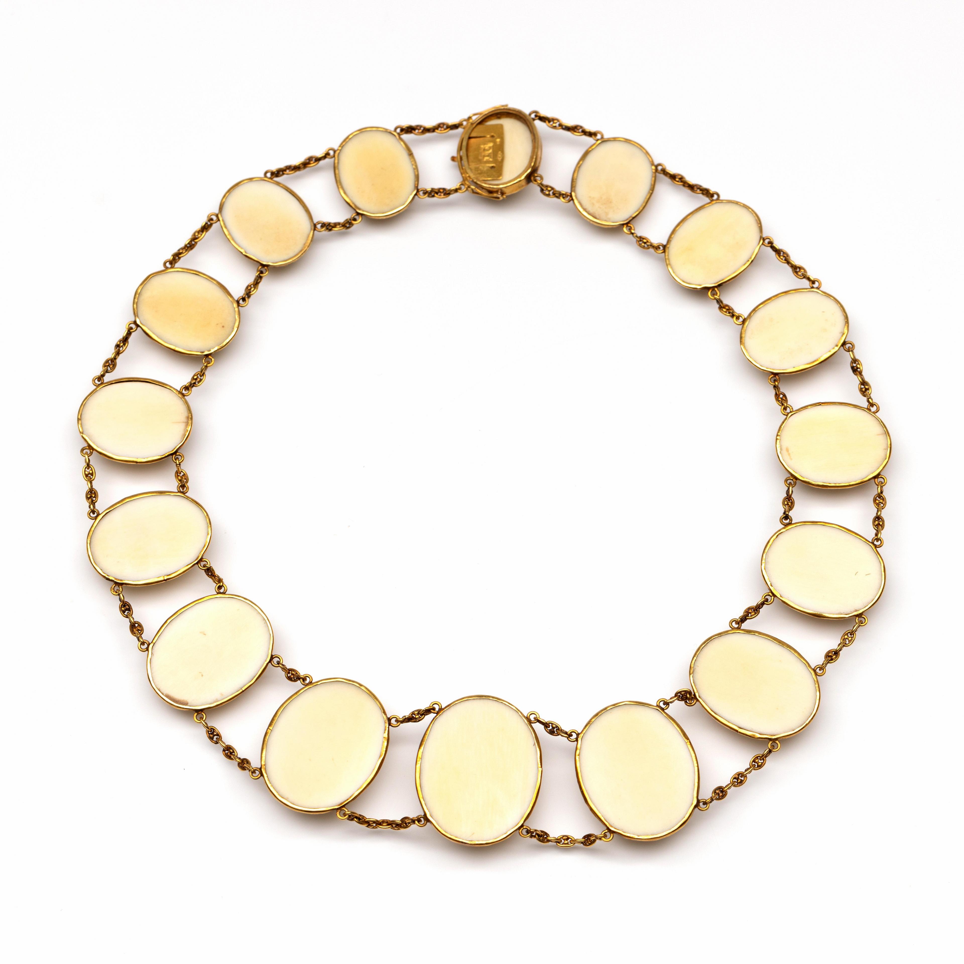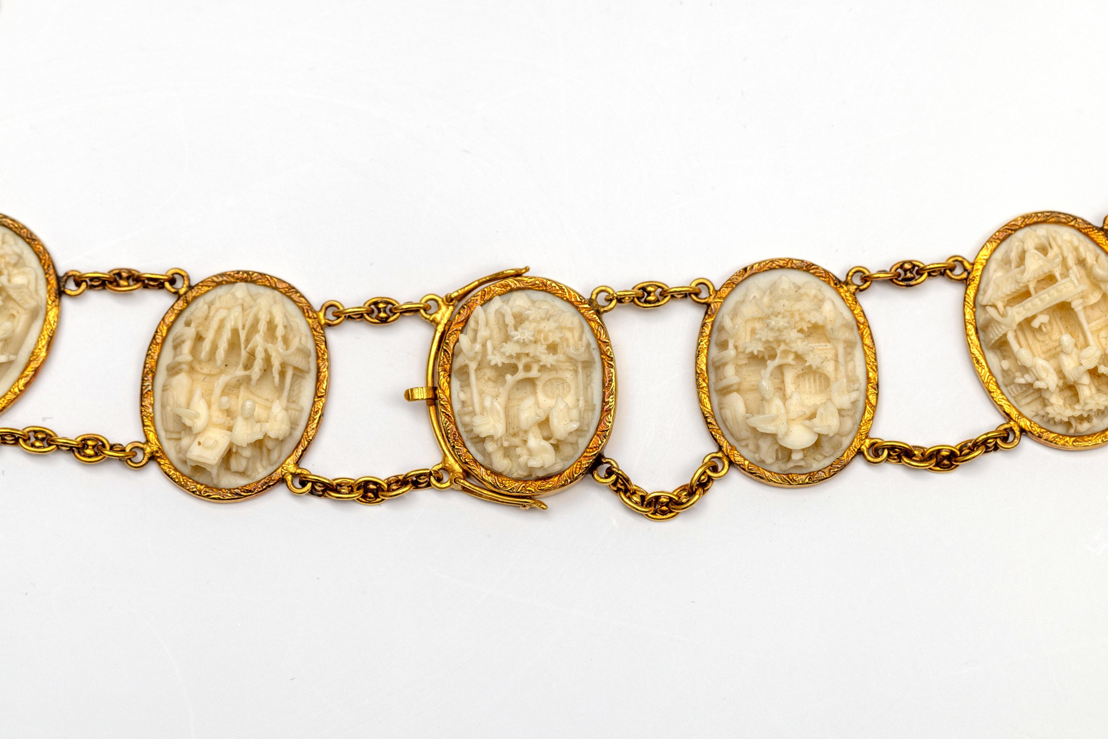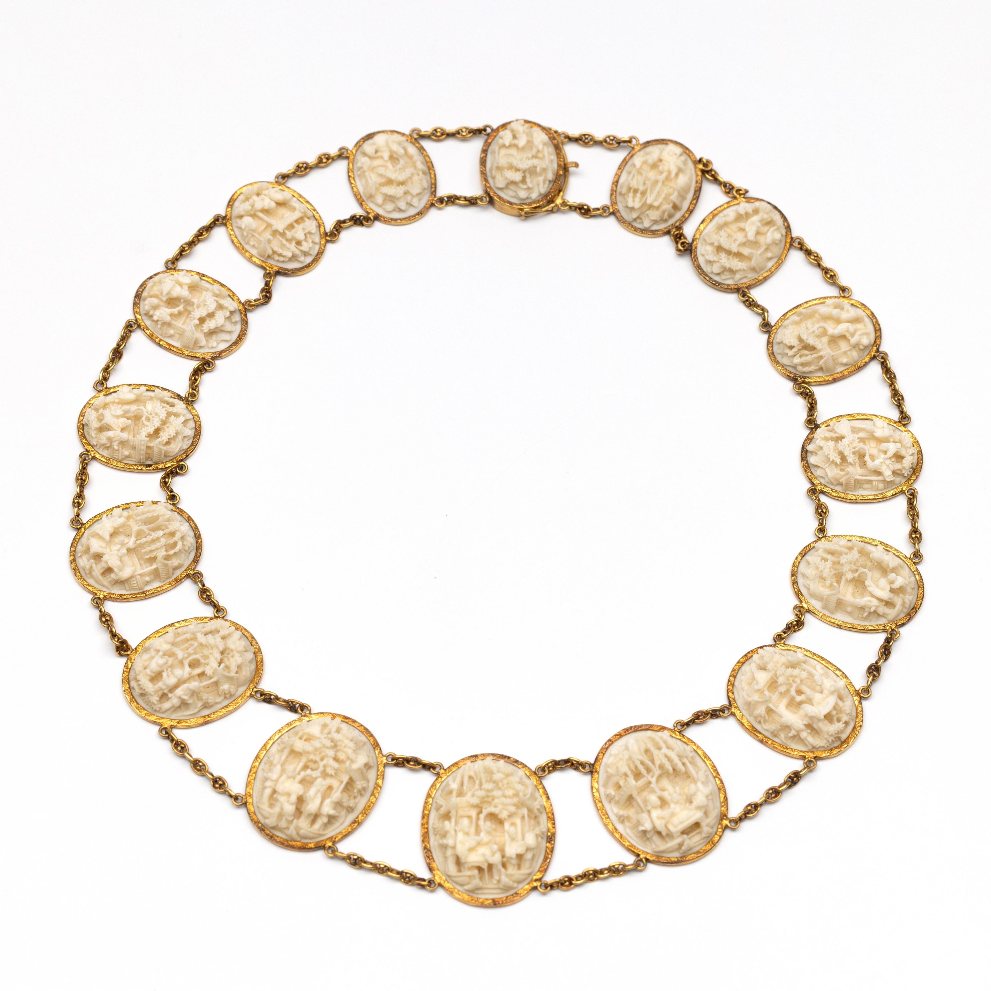 18 k. Gold necklace ‘en esclavage’, ca. 1830. Composed of oval plaques of carved Canton ivory, with a presentation of the figures in landscapes with houses, descending in size from the centre. With CITES Certificate 25NL339036/20. NOTE: This lot can not be exported outside EU