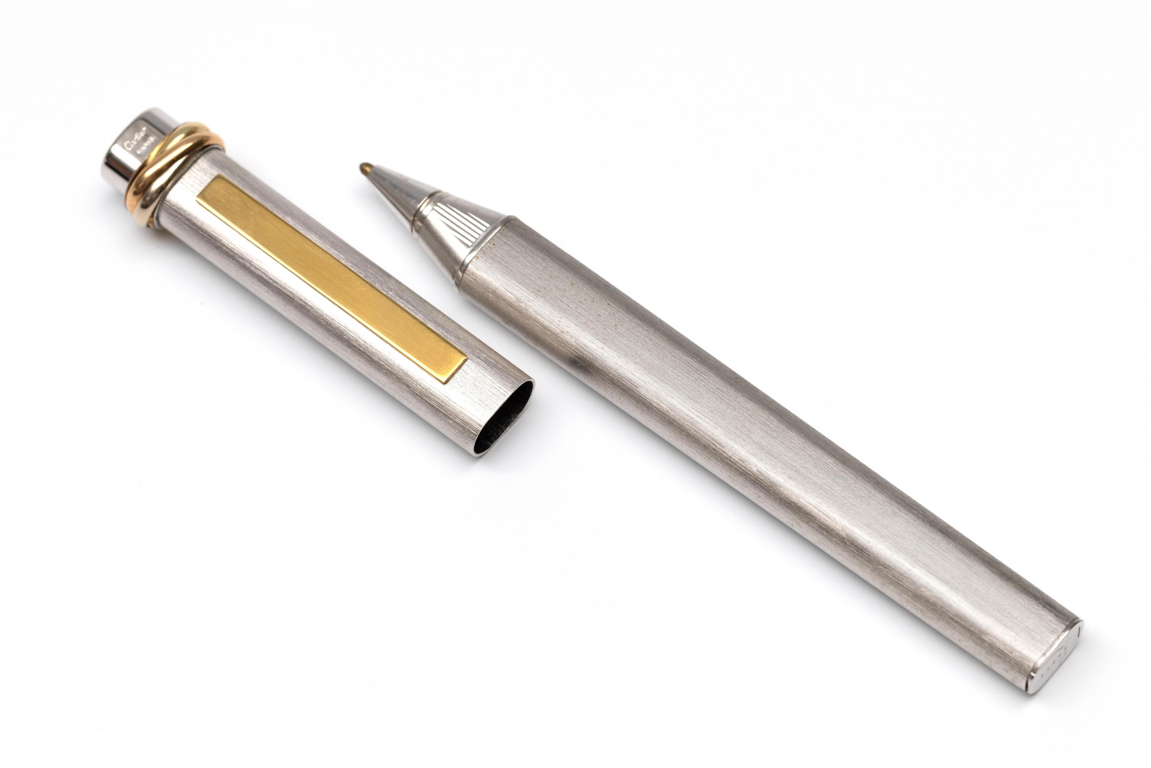 Cartier, steel wristwatch and ballpoint. The watch model Santos Ronde, 8191, quartz. With a cream-coloured dial with Roman numerals. The bezel and details on the strap in 18 k. gold. Includes three spare links and a warranty certificate dated August 1982. The ballpoint pen Les Must De Cartier, Vendôme Trinity with gold-coloured details. In box.