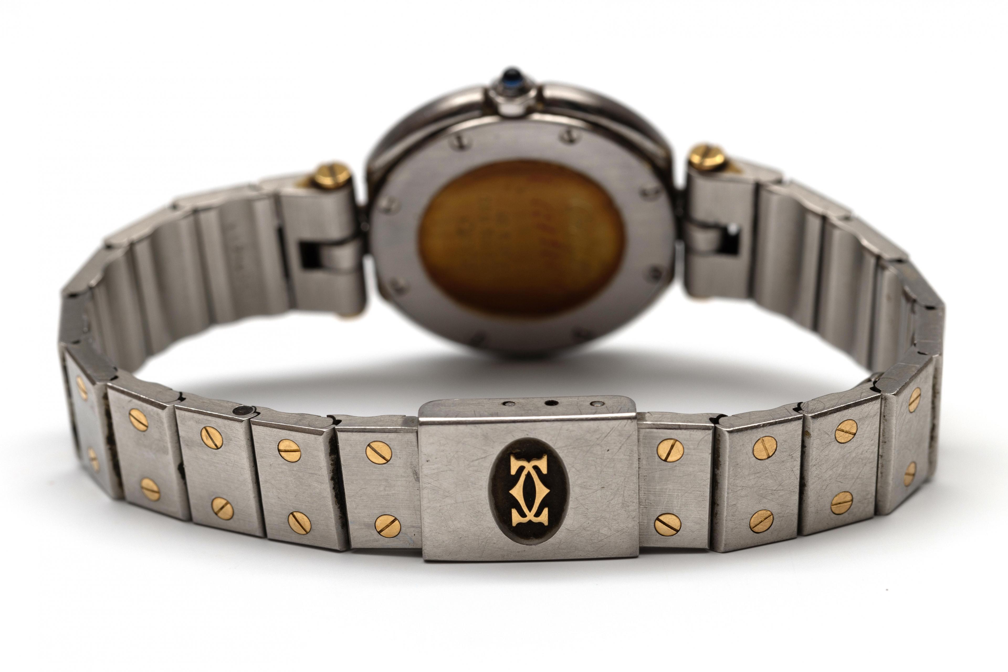 Het horloge model Santos Ronde, 8191, quartz. Met crème kleurige wijzerplaat met romeinse cijfers. De lunette en details op de band in 18 kt. goud. Met drie extra schakels en garantiebewijs gedateerd augustus 1982. De ball point les must De Cartier, Vendôme Trinity met goudkleurige details. In doos