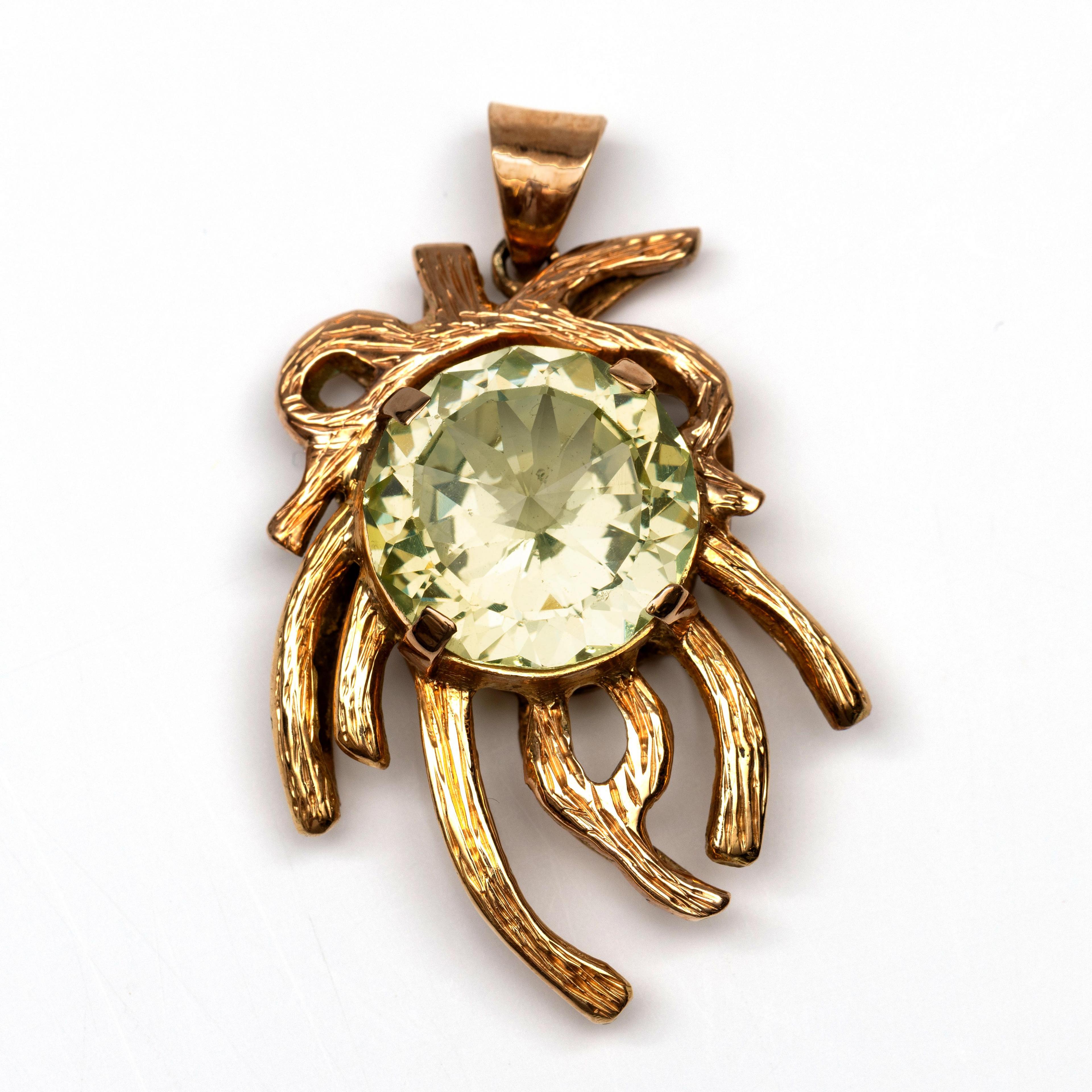 Gold pendant, 1970s. With curved bands, set with a round green synthetic spinel (diameter 14.7 mm)