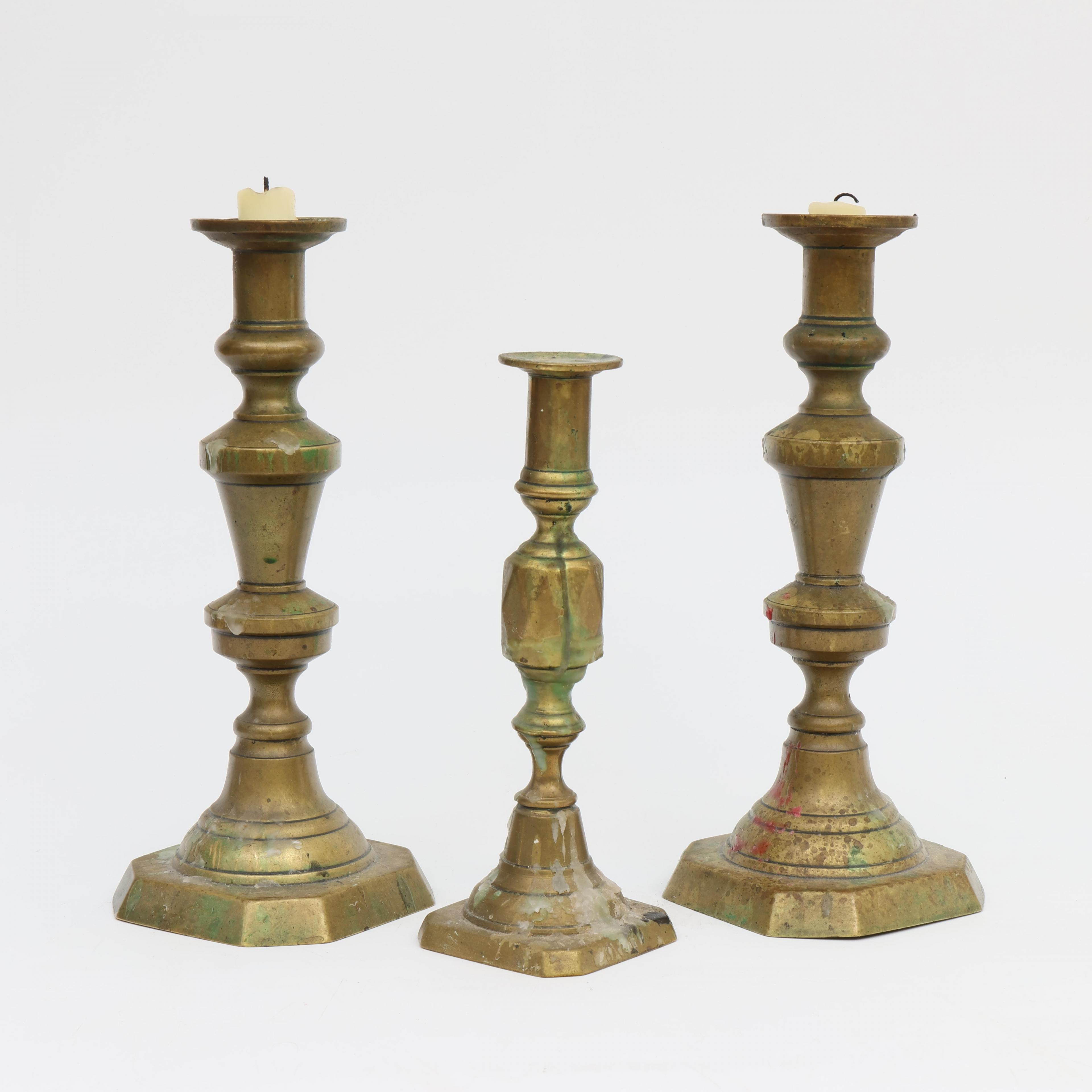 Engeland, drie koperen kandelaren, 19e eeuw;