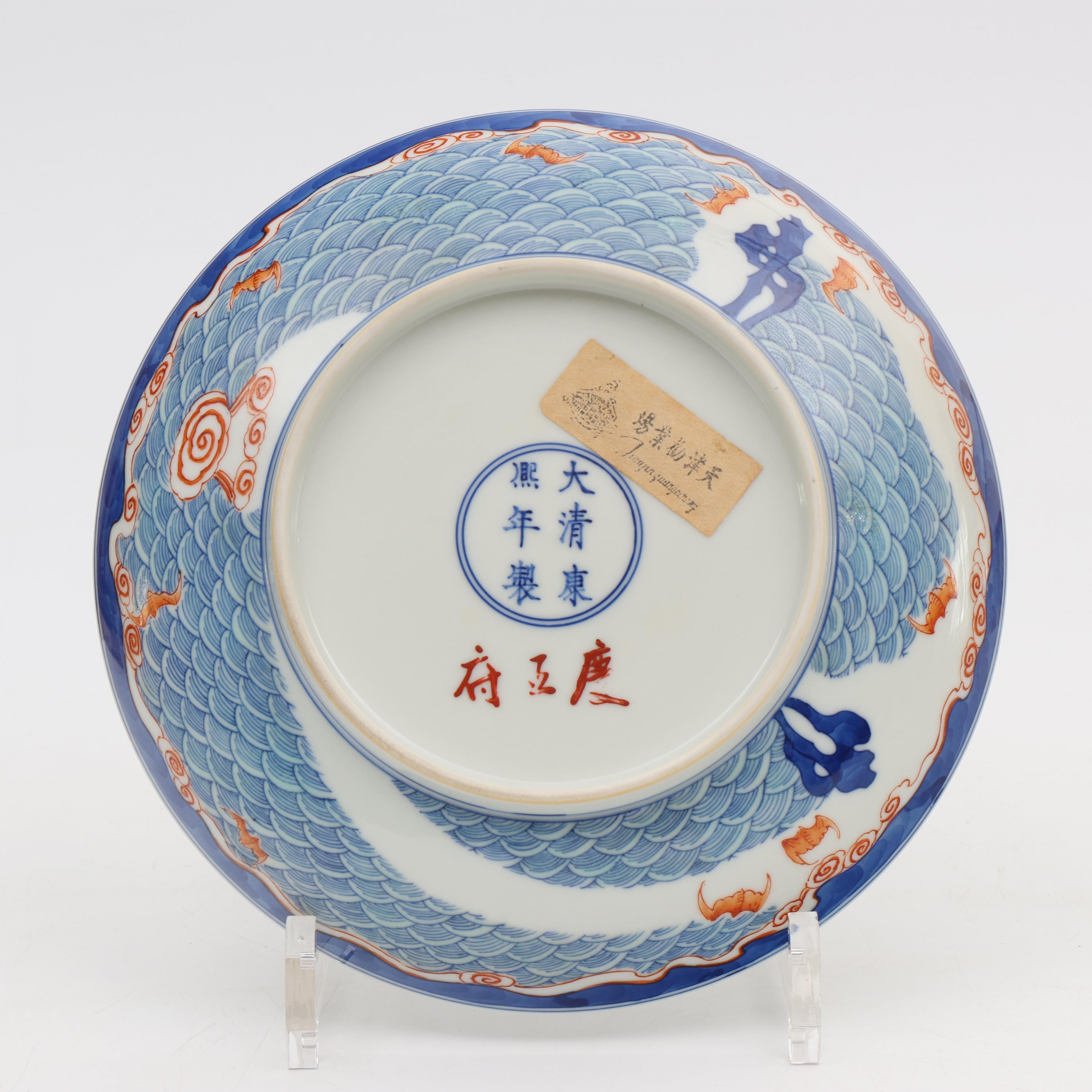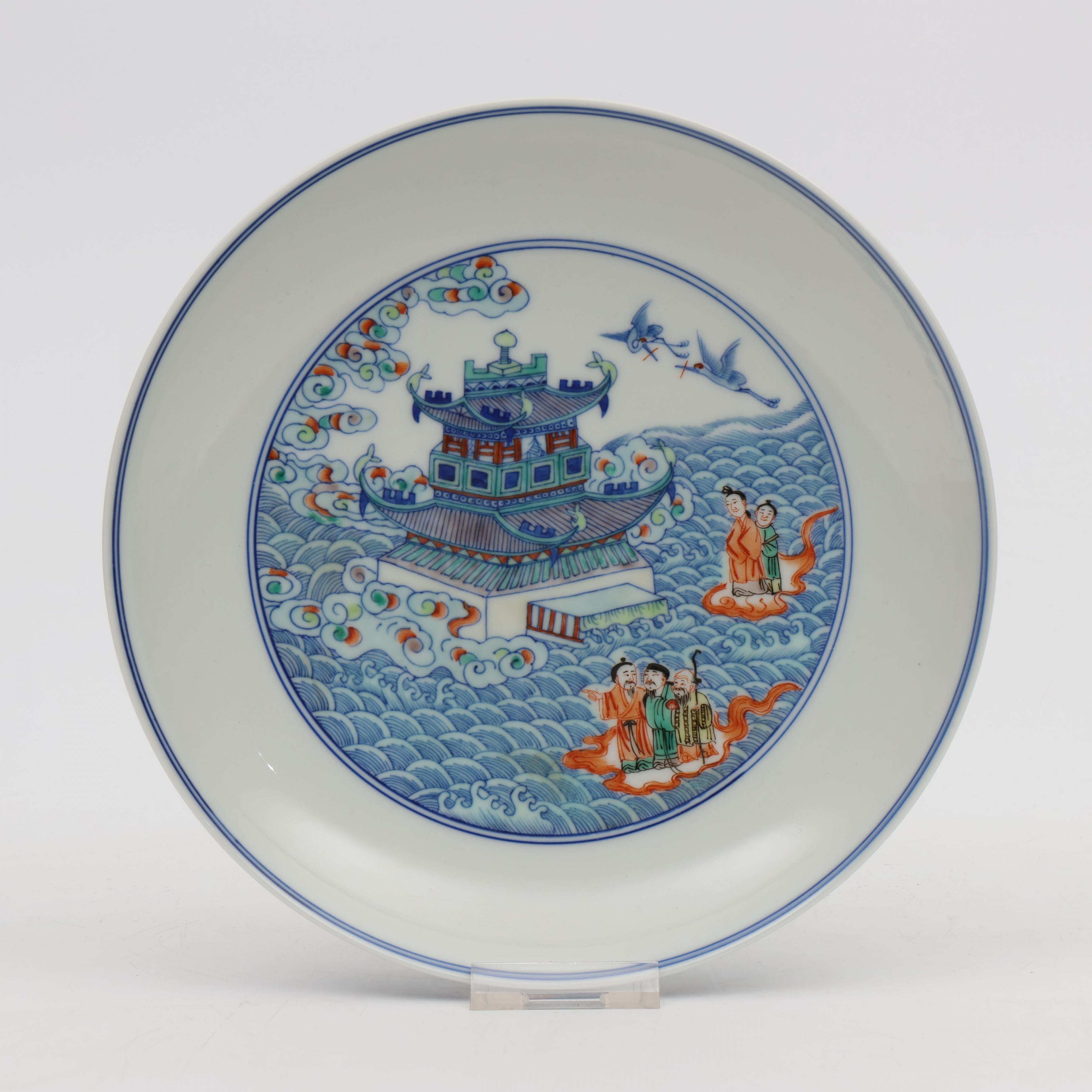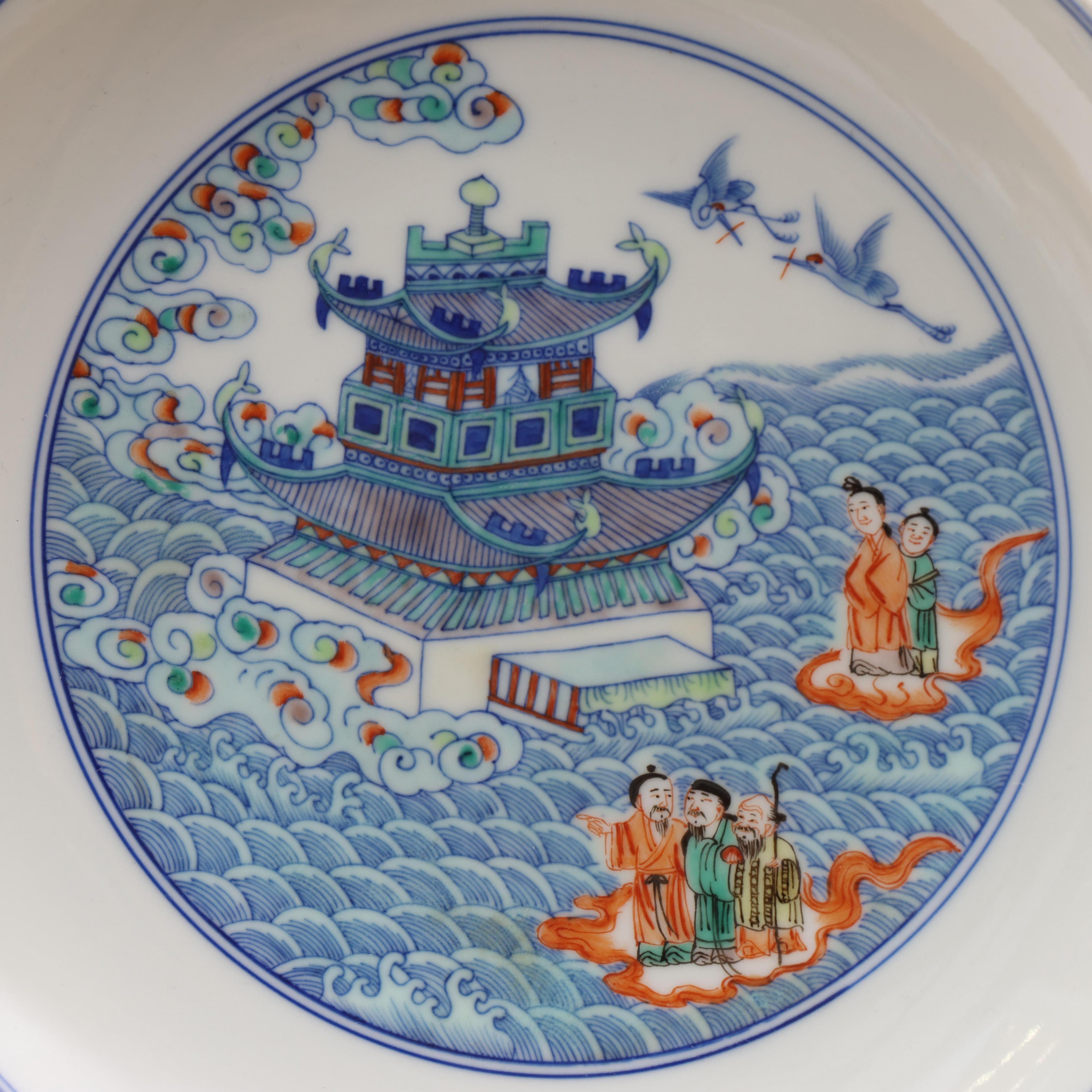 painted with immortals sailing to their palace, cranes above, with apocryphal Kangxi mark and label of the Tianjin Quan YeChang Market