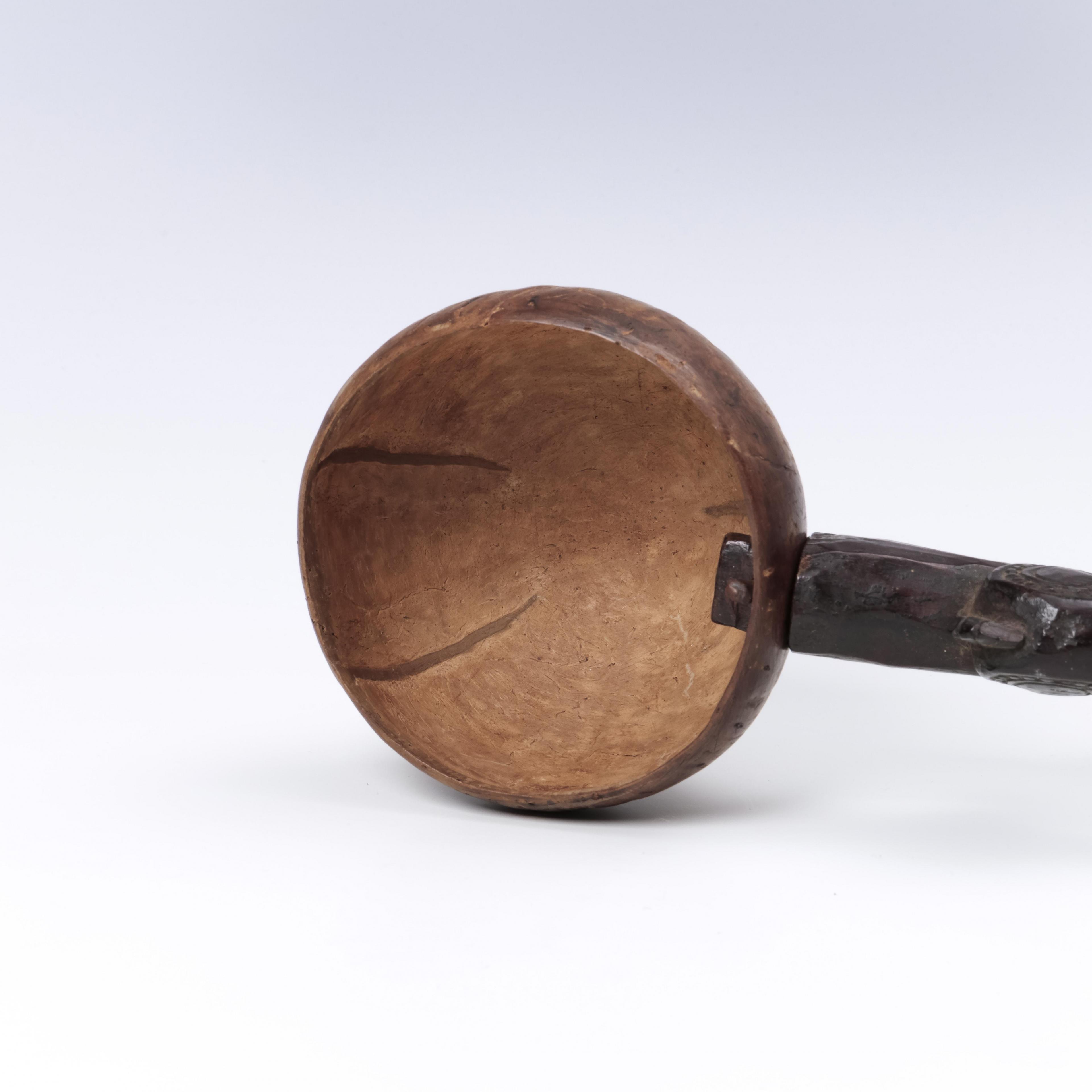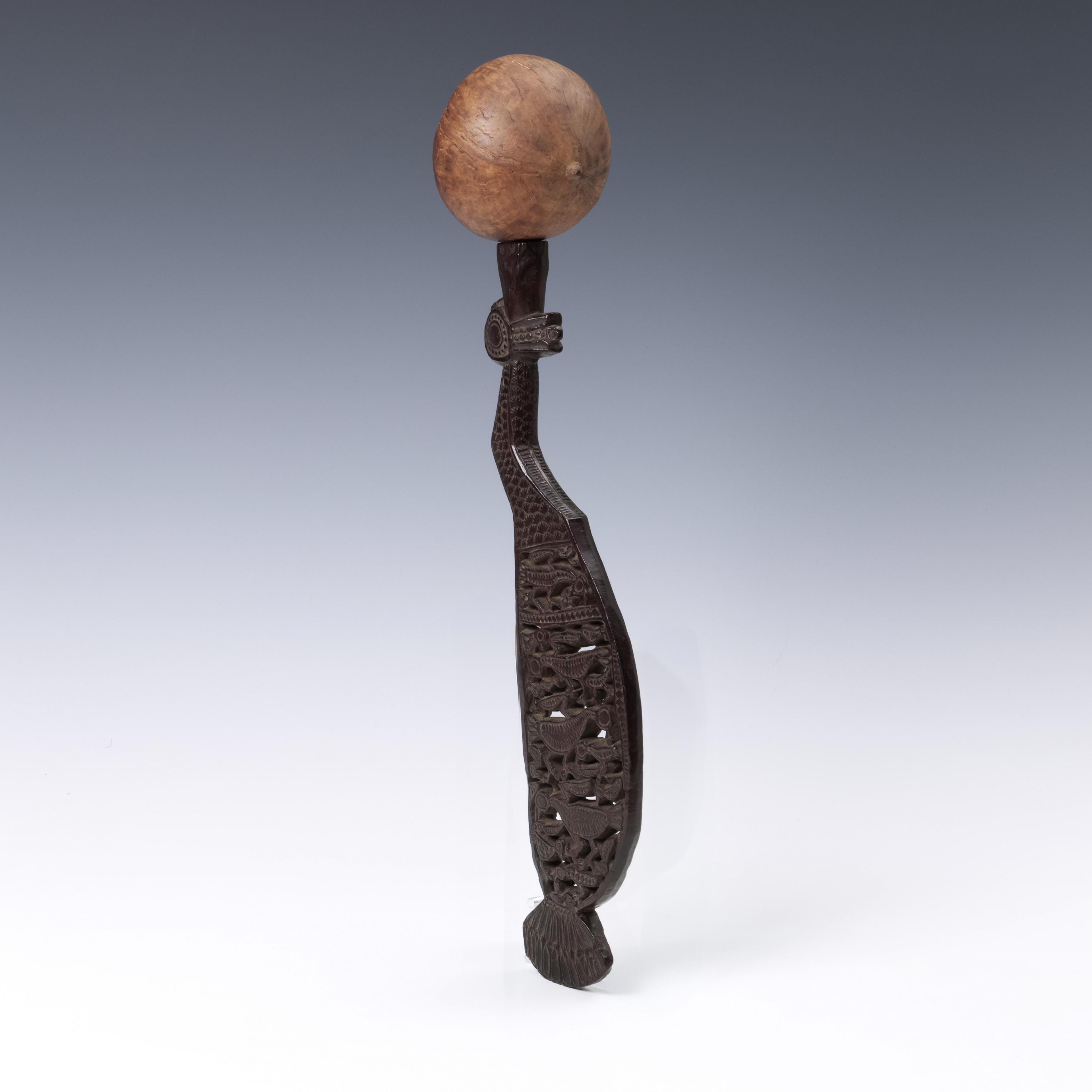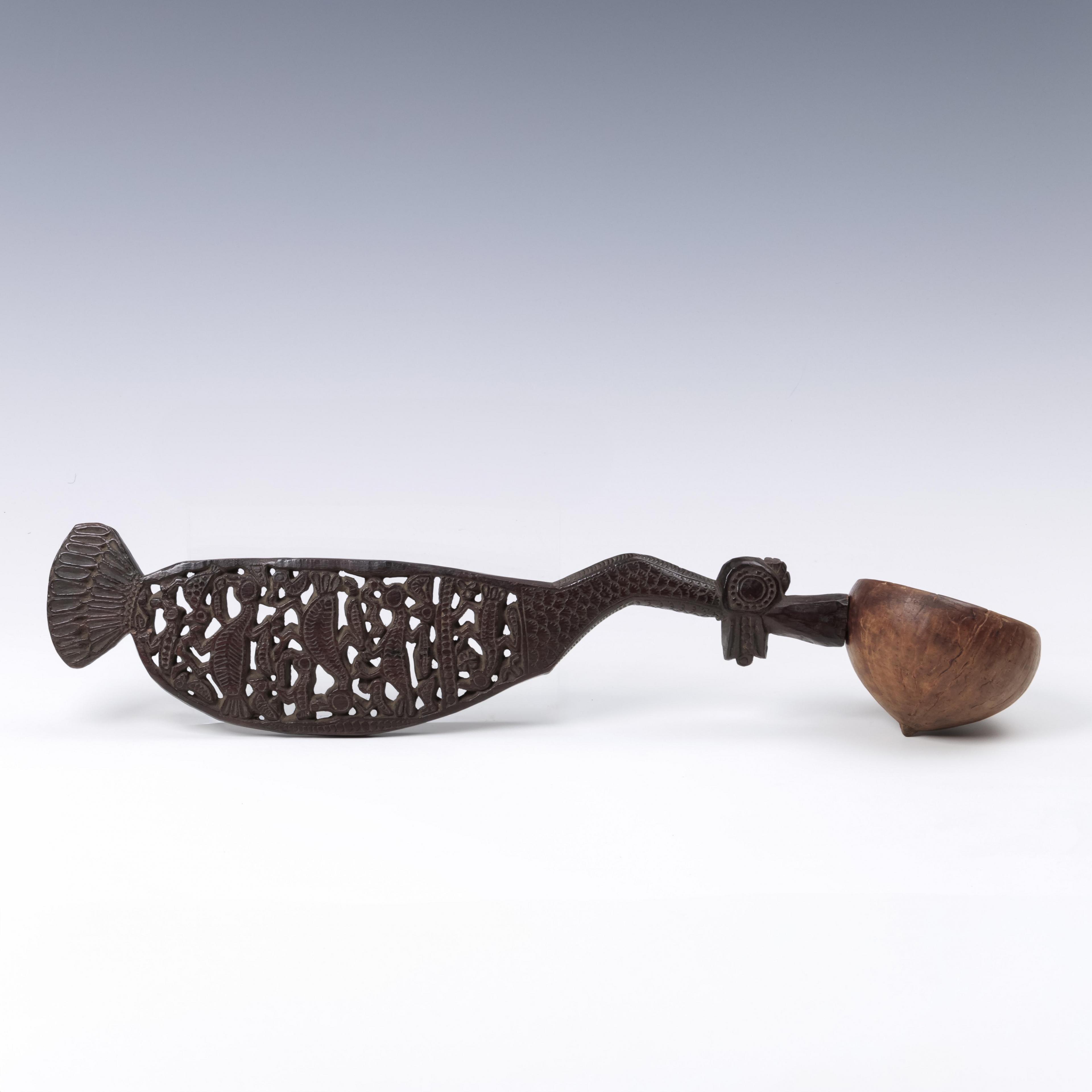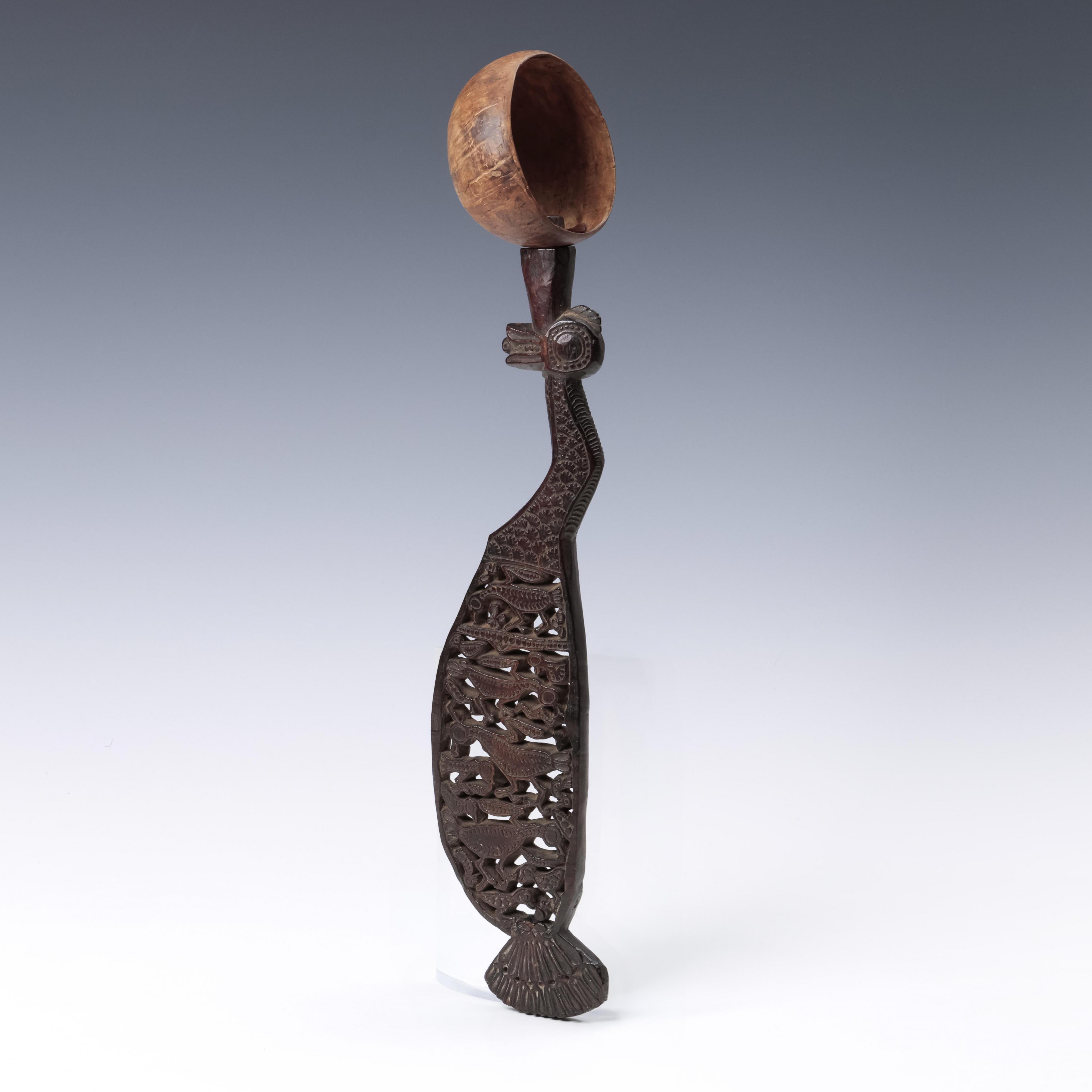 a coconut scoop attached to a fine large open worked wooden handle in the shape of a rooster with an intricate carved pattern of fourteen various birds